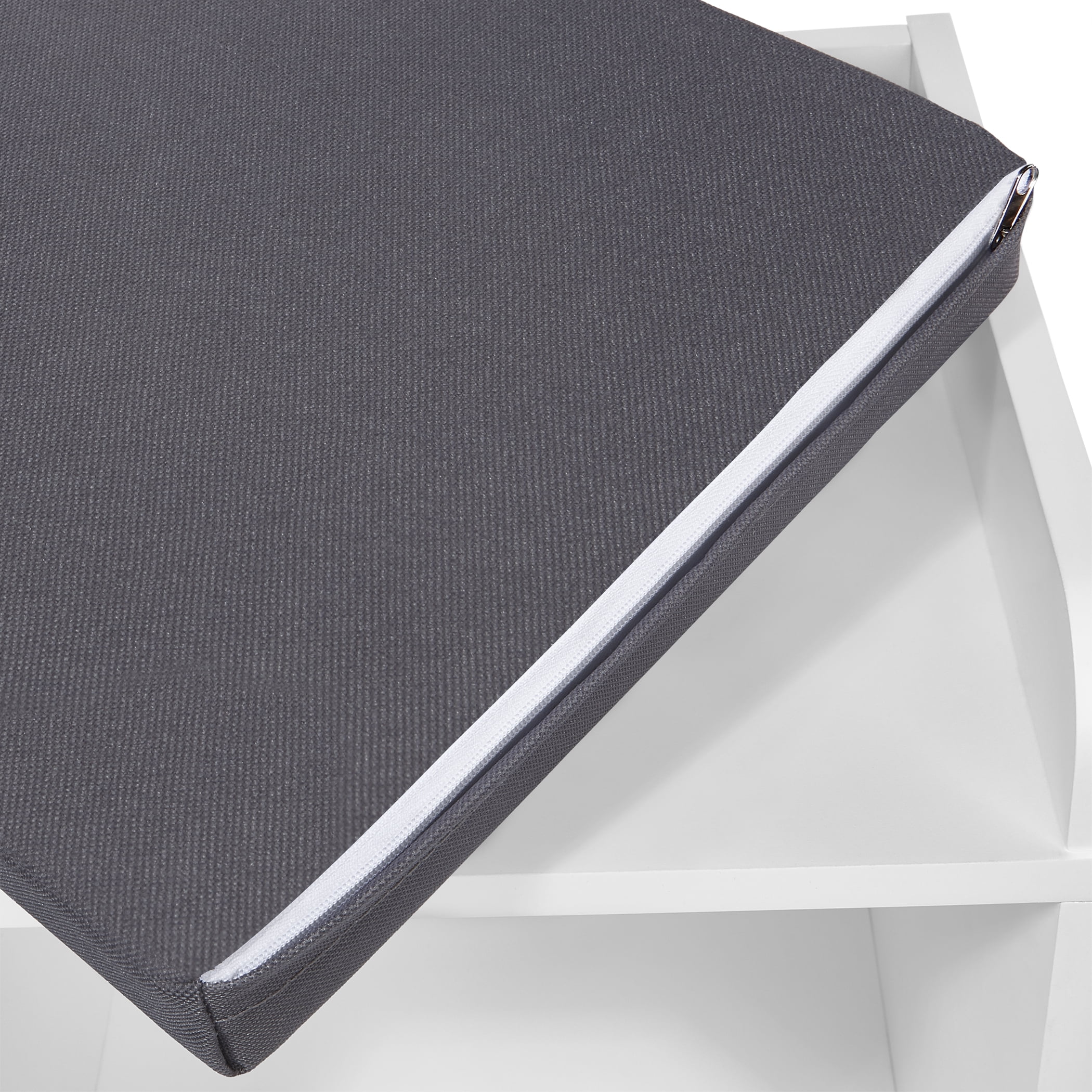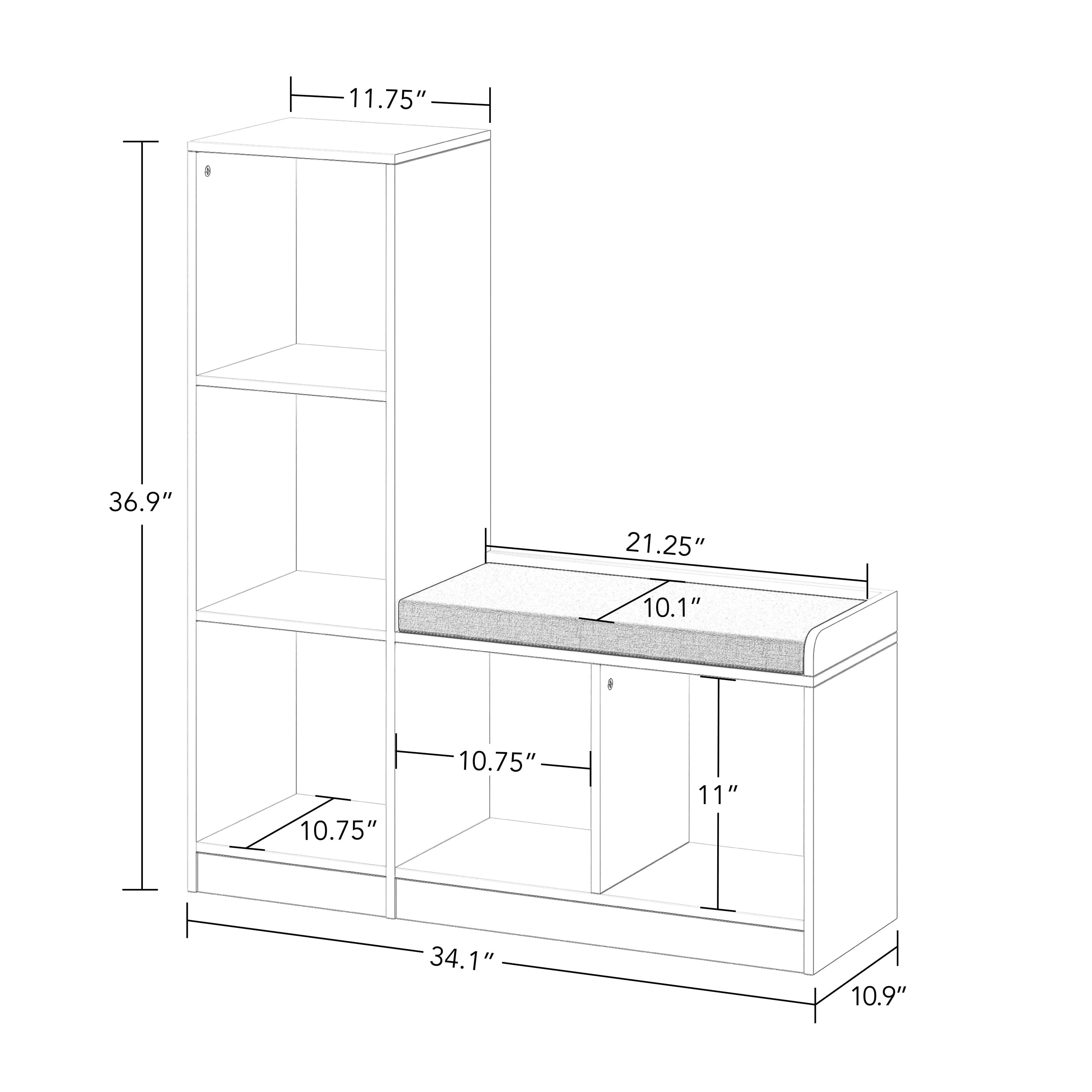 Assembled size: 10.88-in. D x 34.13-in. W x 36.88-in. H; Interior Shelves: 10.75″ W x 10.75″ D x 11″ H; Bench: 21.94″ W x 10.13″ D x 2″ H; Bench from floor: 14″ H Create a fun, designated reading and book storage space with this 5 Cubby Storage Bench for kids. This product will hold up to 15 lbs. per cubby, 15 lbs. on the top shelf and 75 lbs.on the bench seat, not to exceed 165 lbs. The toy organizer and bookshelf is made of painted MDF for long lasting durability. Cushion is 100% polyester fabric. Square cubbies are a perfect fit for RiverRidge® Home Kids 2Pc Folding Storage Bins to conceal clutter and add a pop of color to your space (sold separately) The bench seat features a dark gray cushion and a 14” seat height, adding a cozy place for children to sit and relax while they read and play. Securely anchor the toy organizer to the wall for enhanced stability with the provided tip-over restraints and wall mounting hardware, along with an easy to follow assembly guide Pair with additional RiverRidge® kids storage items to give the playroom a fresh, new look. Recommended for children ages 3 and up.