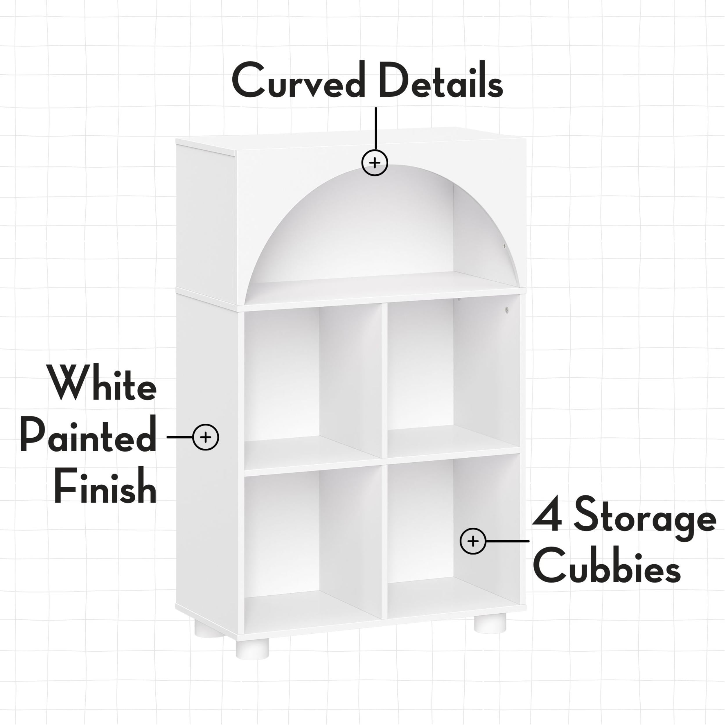 Our curved bookcase brings style and smart storage to any playroom or bedroom. The 4 spacious cubbies provide ample room for books, toys, and treasures, while the arched design adds elegant flair. At 23″W x 11.375″D x 36.063″H, this kids toy storage organizer fits neatly in cozy corners while holding up to 95 pounds of childhood essentials. The child-friendly height empowers little ones to access and organize their belongings independently. Crafted from durable MDF with a smooth white finish, our kids shelf stands up to daily use while keeping spaces tidy. Each cubby supports 15 pounds of storage, making them ideal for heavy picture books, building blocks, or toy collections. The sturdy top shelf handles 20 pounds for displaying special treasures or decorative items. This cubby storage organizer combines dependable construction with practical functionality. Transform cluttered spaces into organized havens with our adaptable storage system. Each cubby accommodates RiverRidge folding fabric bins (sold separately) to conceal toys and add pops of color. This kids book shelf organizer works beautifully as a reading nook, toy storage shelf, or creative space. The clean lines and curved accents complement any décor while keeping essentials within easy reach. -Four spacious storage cubbies for toys and books -Child-height design for easy access -Curved top arch detail in white finish -95-pound total weight capacity -Fits fabric storage bins for organization
