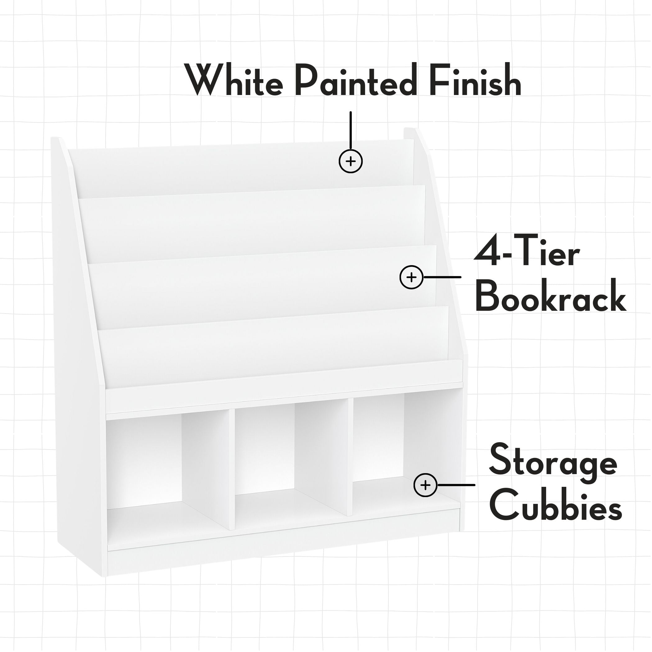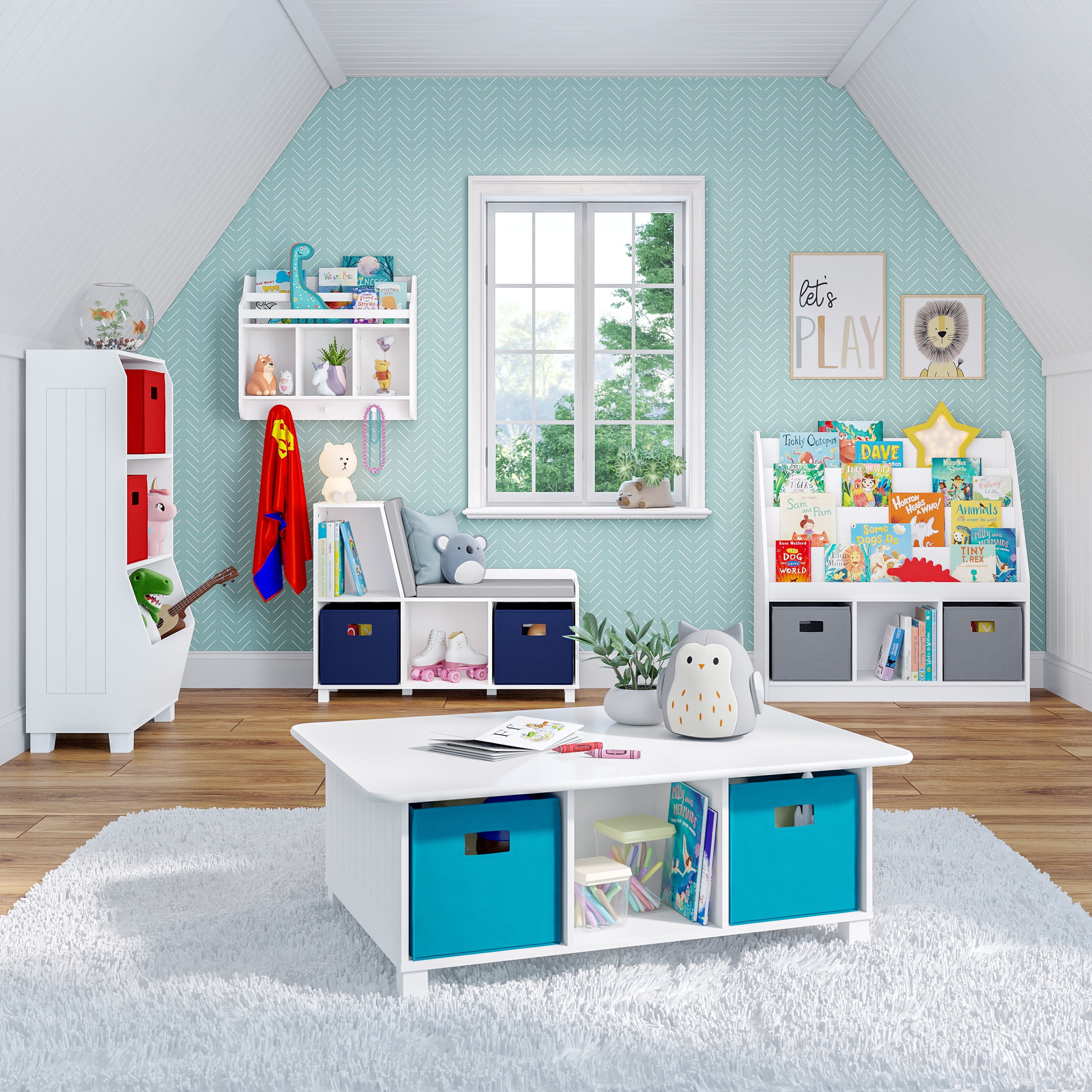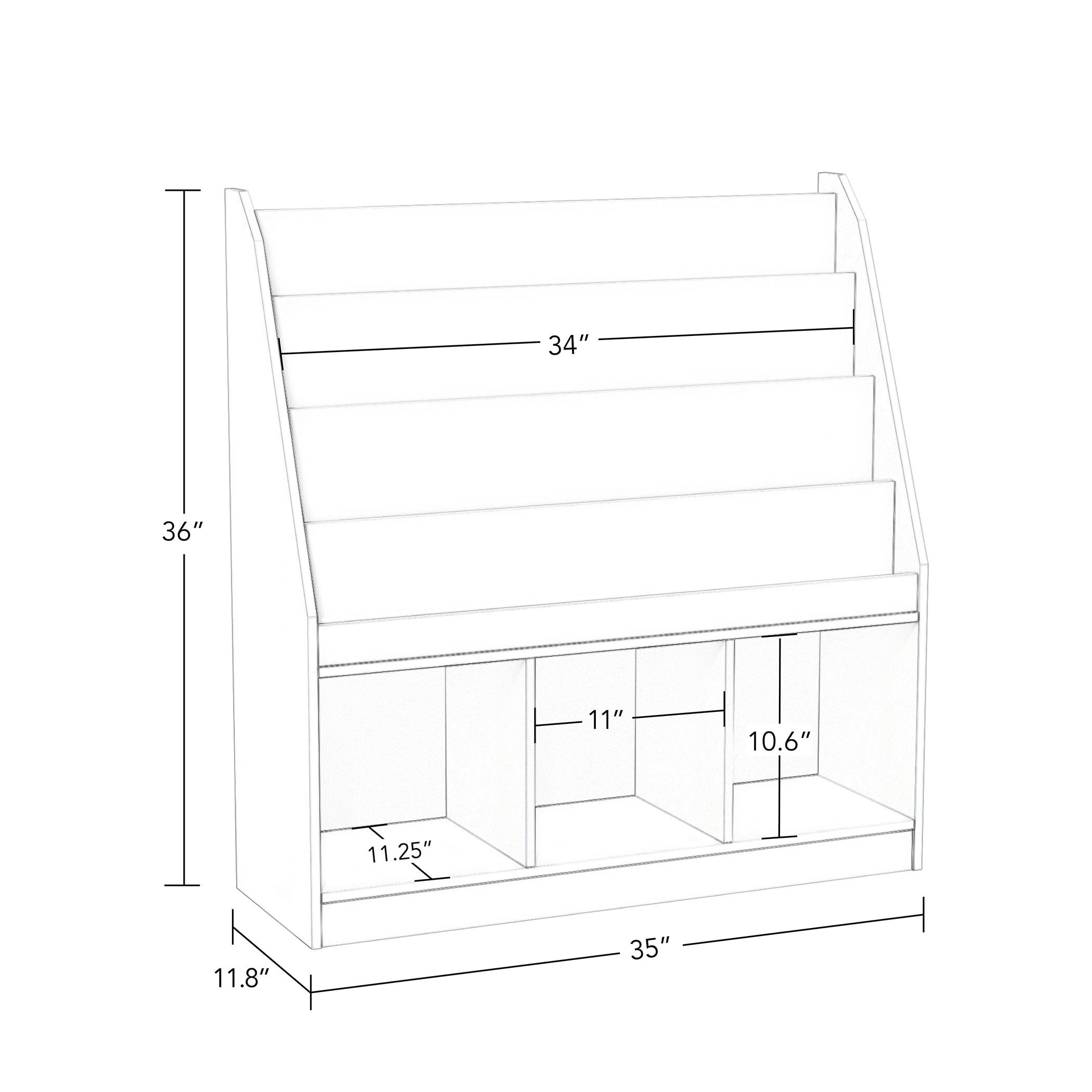 Assembled size 35″ W x 11.8″ D x 36 “H and weighs 24 lbs. Exterior Shelves: 11″ W x 11.25″ D x 10.63″ H; Bookracks: 34” W, Bookrack Depths: 1.75” – 2.31”, Shelf Lip Heights from Front to Back: 2″, 3″, 4″, 4” This kids bookrack holds 10 lbs. per shelf and 20 lbs. per cubby, for a total weight of 100 lbs. It features four horizontal bookshelves and three storage cubbies, and it can hold up to 90 books. The toy organizer and bookshelf is made of painted MDF for long lasting durability. 2pc bin set made from non-woven polypropylene. This sturdy and spacious bookcase features 4 book racks and 3 cubbies providing plenty of storage, smooth edges, and a tip-resistant design. A great storage and organization choice for all of your children’s spaces! Kid-friendly design appropriate as a toy shelf organizer, nursery bookshelf, and cube storage. Ideal size for children at just 36” tall. Securely anchor the bookrack to the wall for enhanced stability with the provided tip-over restraints and wall mounting hardware, along with an easy to follow assembly guide Includes our RiverRidge 2Pc Folding Storage Bins in Gray to give your playroom a fresh, new look. Recommended for children ages 3 and up.