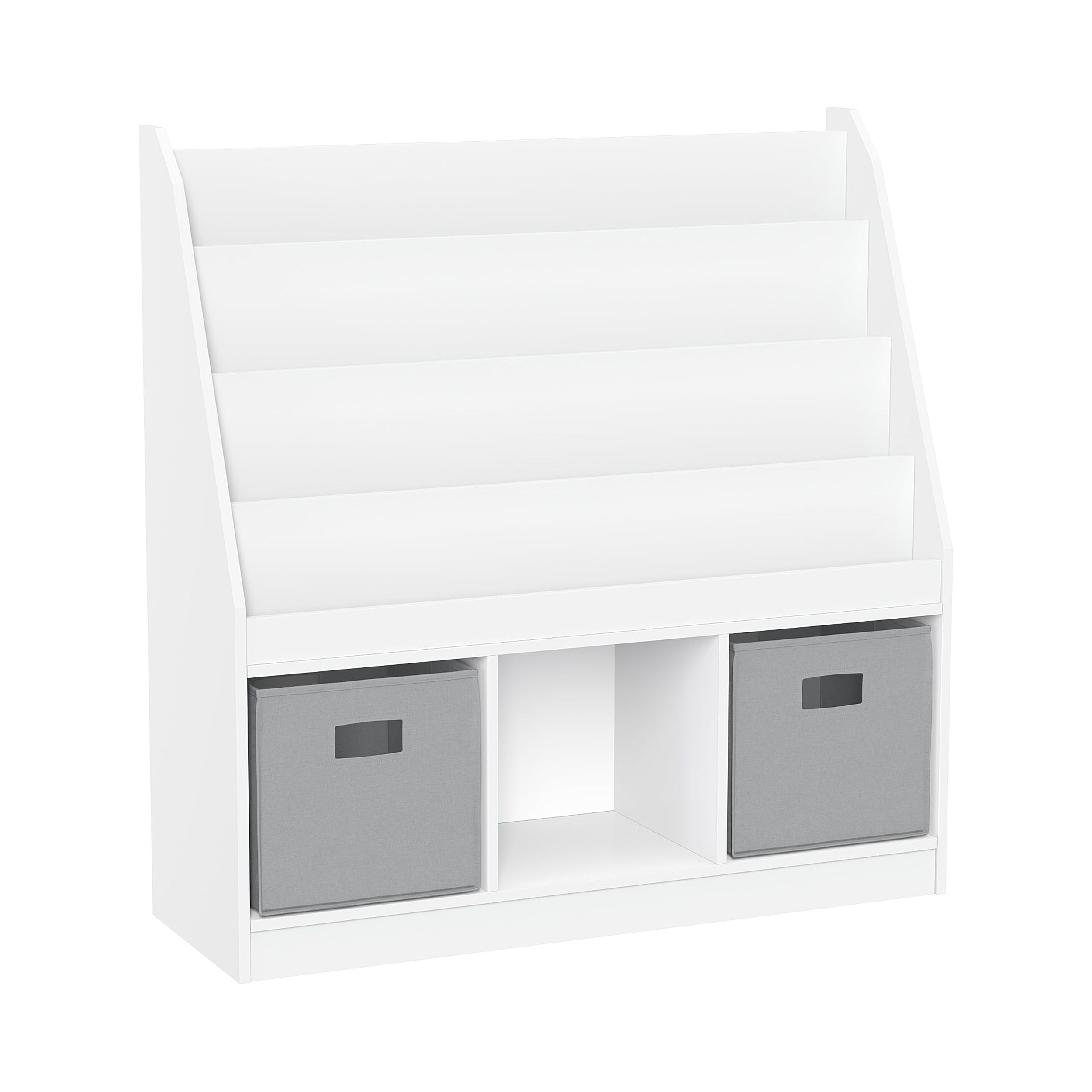 RiverRidge Kids Bookshelf Toy Storage Organizer with 4 Bookracks 3 Cubbies and 2 Gray Bins