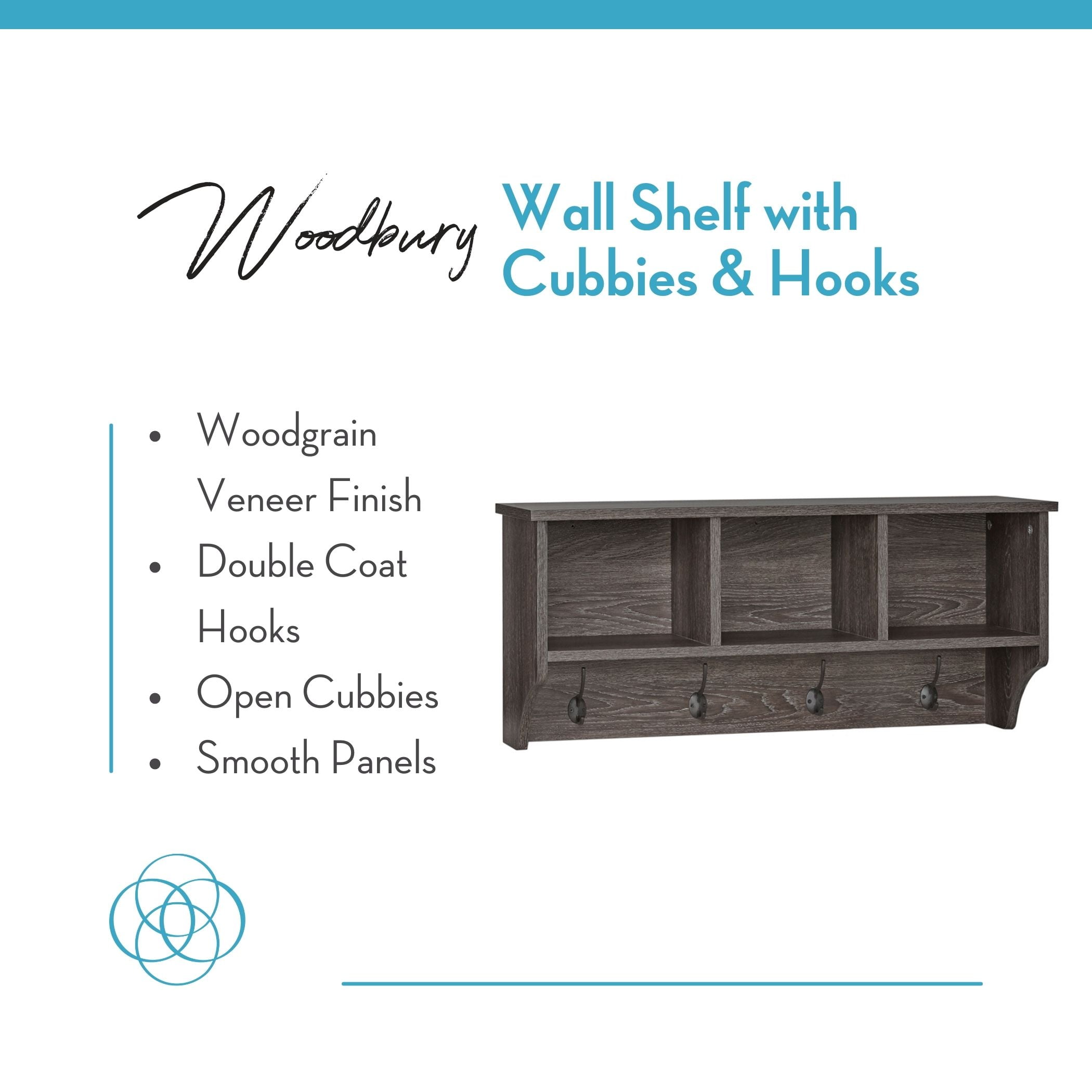 Assembled size: 9.38-in. D x 31.63-in. W x 14-in. H. Exterior Shelves: 31.63″ and 9.44″ W x 9.38″ and 8.25″ D x 7.25″ H; Top Shelf: 31.63”W x 9.38”D, Cubbies: 9.44”W x 8.25”D x 7.25”H; Board with Hooks: 29.5”W x 5.5”H The Woodbury Wall Shelf with Cubbies is great storage solution for your entryway, mudroom, closets or hallways. Holds up to 10 pounds per cubby for a total weight capacity of 30lbs. The wall coat rack is made of particleboard and veneer for long lasting durability. With a weathered woodgrain finish and and black metal accents, this cabinet is perfect for any room of your home The entryway coat rack includes 4 double coat hooks for coats, bags, hats, keys, dog leashes and much more and three open cubbies for small baskets, bins, mittens and other entryway necessities. Complete the look with our other Woodbury Organization Pieces, including an Entryway Bench or Shoe Cabinet Organizer Securely anchor the Coat Rack to the wall for enhanced stability with the provided wall mounting hardware, along with an easy to follow assembly guide