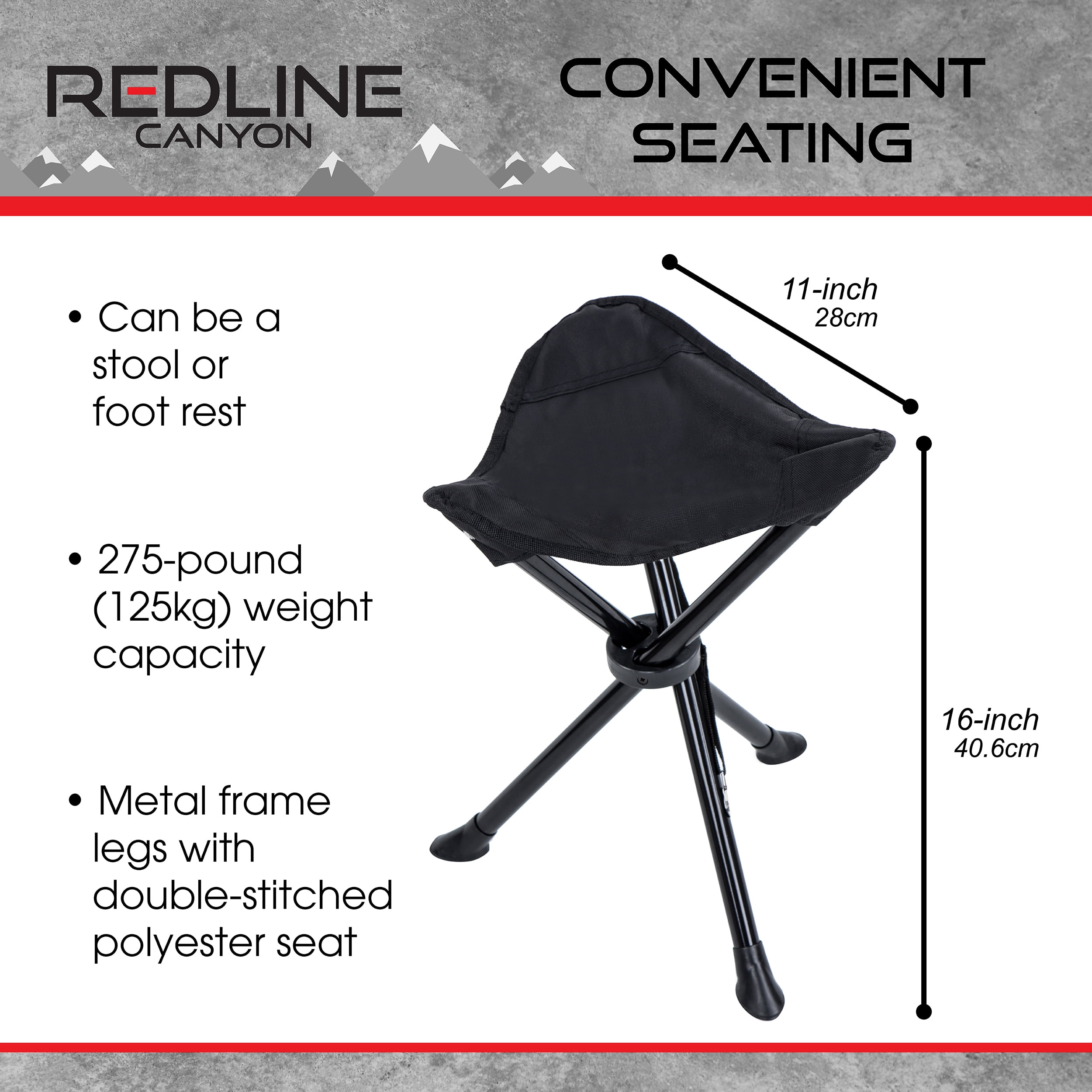 [Seating When You Need It]: Long hikes can be strenuous on your body; Take a seat with the Redline Canyon Folding Tripod Stool Portable Chair; Folding three legged stools provide a comfortable place to sit when camping, fishing, hunting, or gardening; Also great for barbeques, picnics, and bonfires [Easy Set Up]: Disconnect the hook and loop straps and place feet on level ground; Portable folding stool can be used as a fold up stool or as a footrest with your existing portable camping chair; Foldable stool stands 16 inches (40.6cm) tall when set up [3-Legged Design for Stability]: Tripod camping chair design spreads each leg at an angle into the 0.6-inch (1.5cm) thick plastic bracket disc to ensure a 275-pound (125kg) weight capacity; Anti-slip rubber feet also help to ensure a reliably stable structure [Built to Last]: High-strength 0.75-inch (1.9cm) thick metal frame and double-stitched polyester fabric camping seat are riveted together for added security and optimal durability; Each side of the triangular polyester ice fishing chair measures roughly 11 inches (28cm) from rivet to rivet [Compact Travel]: Folds to 21 x 3 x 3 inches (53.3 x 7.6 x 7.6cm), roughly the size of a rolled-up newspaper to take up less space; 1.2-pound (0.54kg) weight and included drawstring bag with nylon strap ensure lightweight travels