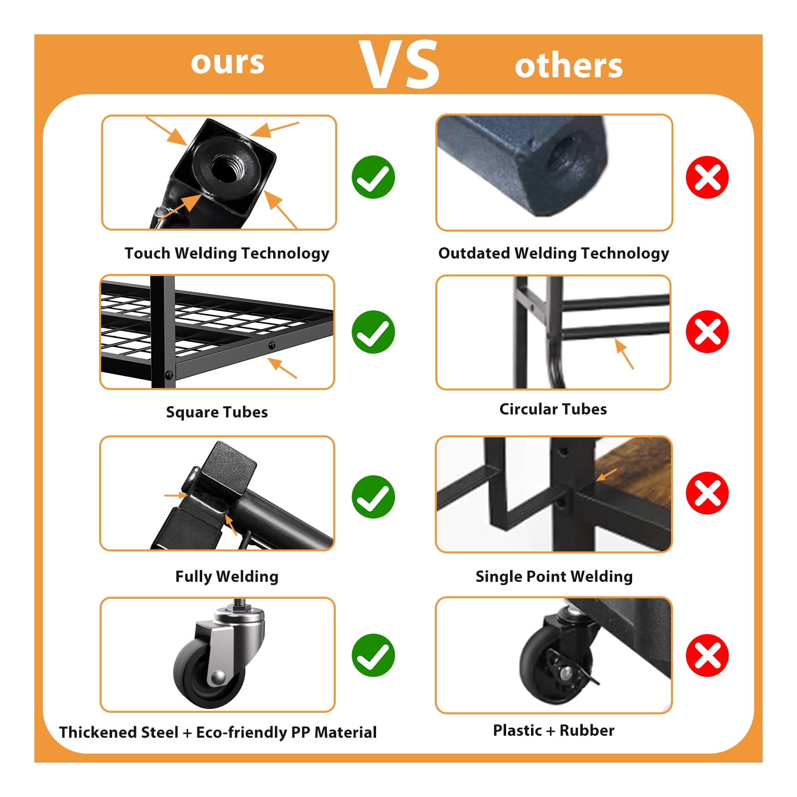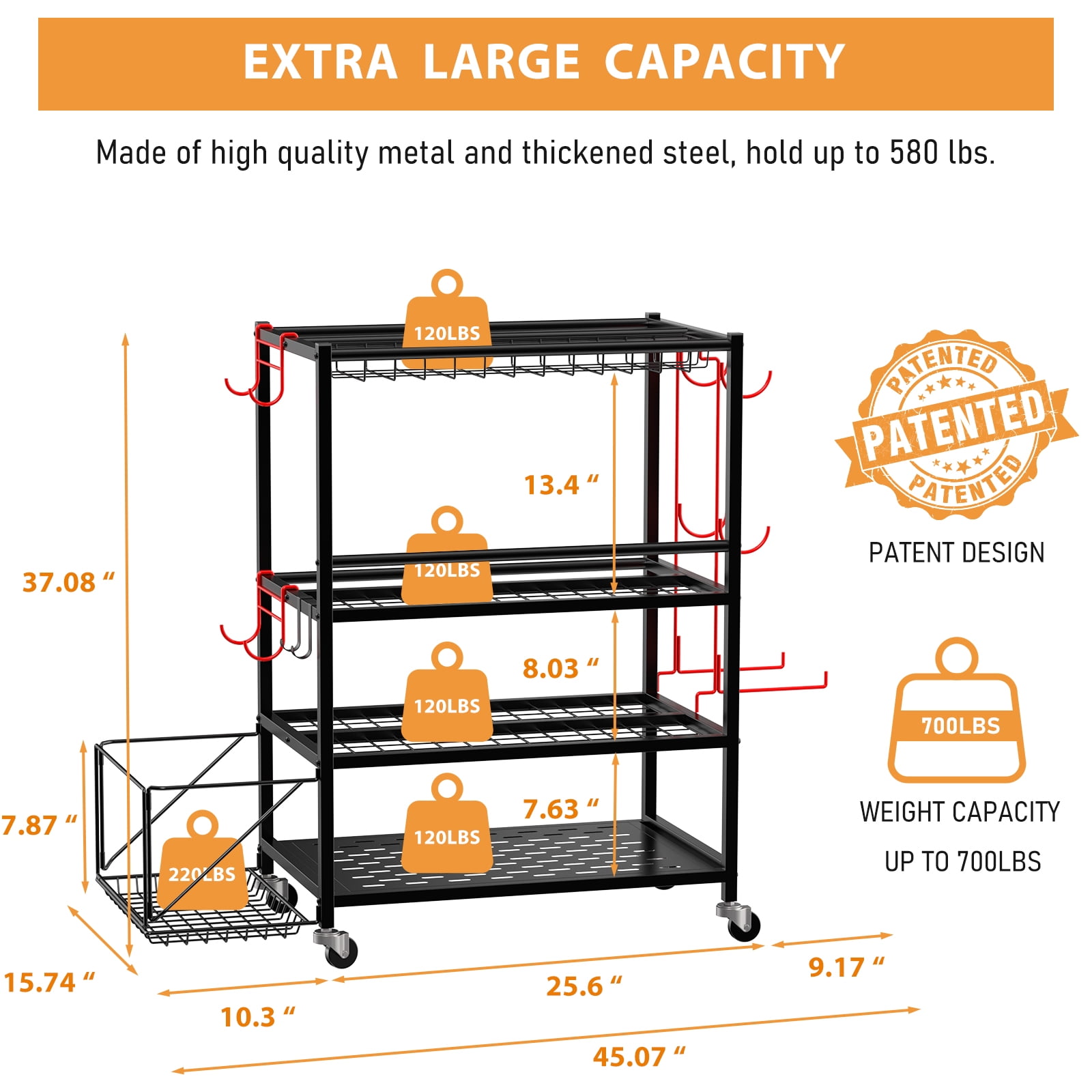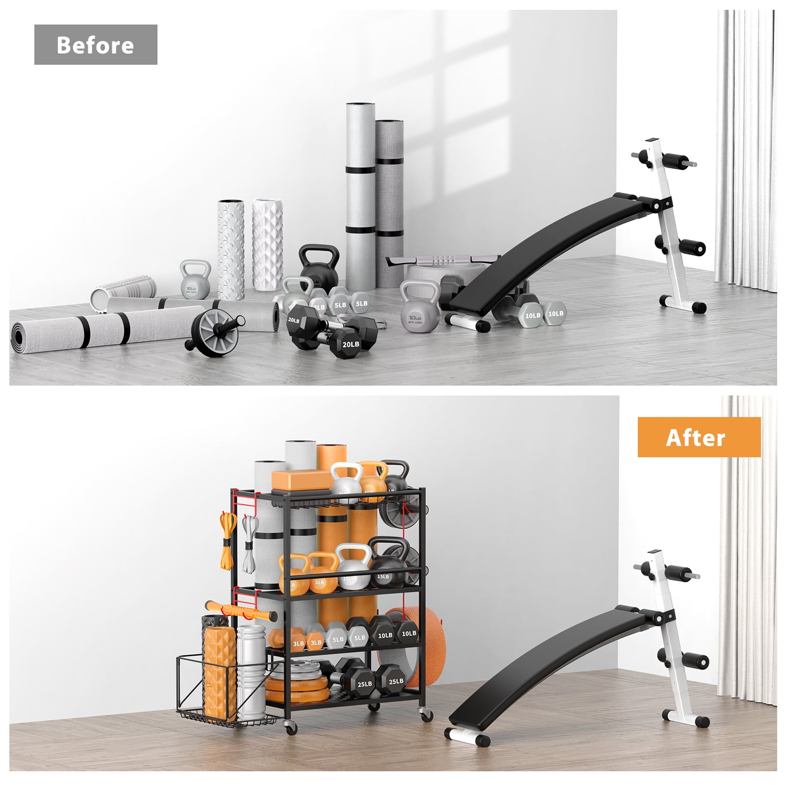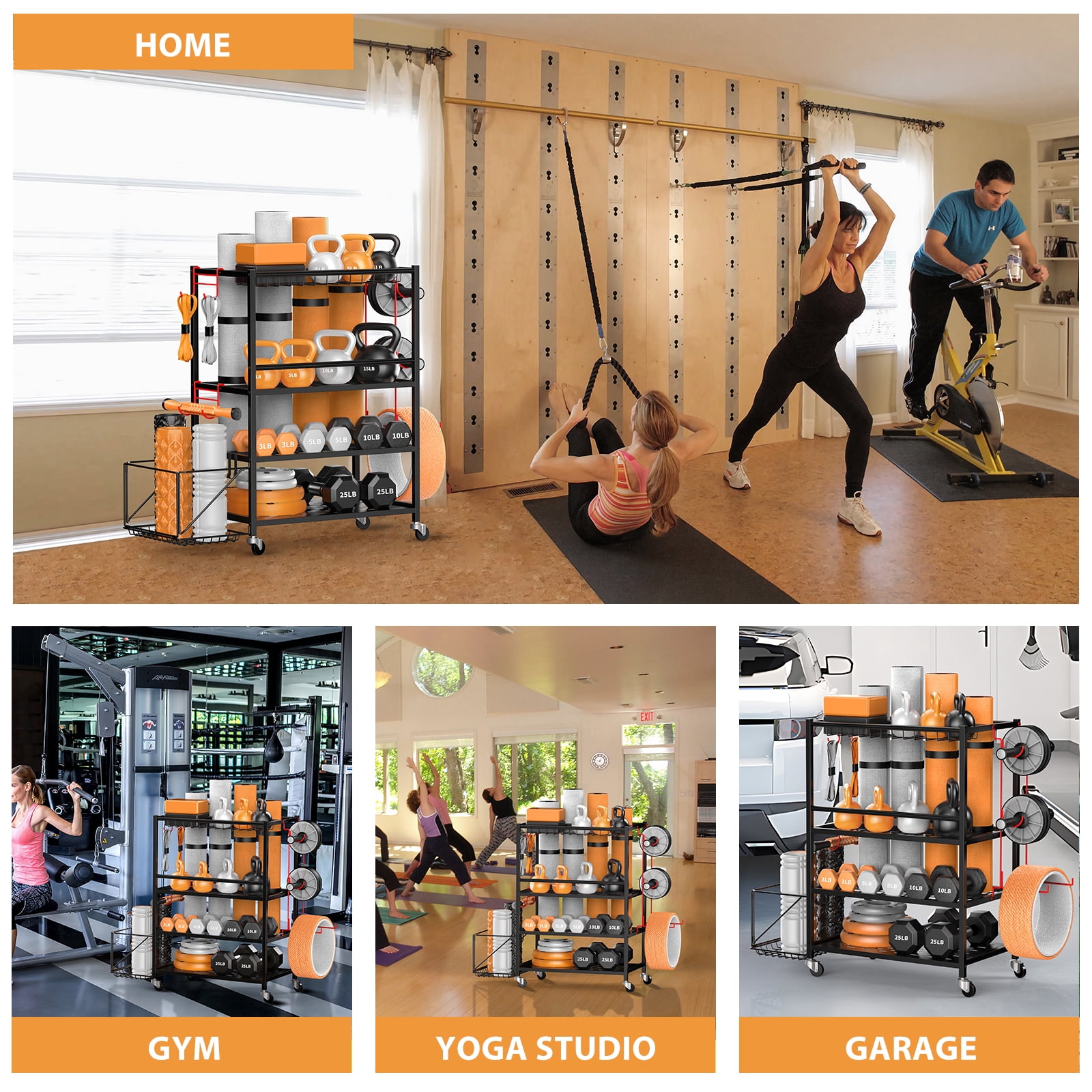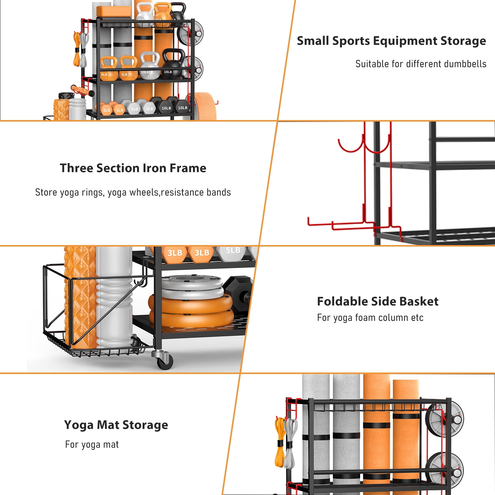 【4 LAYER MULTIFUNCTIONAL HOME GYM STORAGE RACK】: Our weight rack can store dumbbells, yoga balls, kettlebells, yoga blocks, resistance bands, balls and more! Suitable for various places, such as garage, home and gym. 【EXTRA LARGE CAPACITY & EXTENDED SIZE】: The dimension of our home gym organizer is 45.07”(L) x 15.74”(W) x 37.08”(H). Our storage rack comes with three metal mesh tiers, a side basket(foldable), three section iron frame and multiple hooks which can store for various yoga gear and fitness equipment, easily organize your space and stay organized! 【HIGH LOAD-BEARING CAPACITY】: Our dumbbell racks are made of high quality metal and thickened steel with a special coating to resist rust and corrosion. Each layer can bear 120lbs, the side basket can bear 220 lbs. 【HEAVY-DUTY WHEELS】: Movable and lockable, the workout storage rack comes with 4 strong multi-directional rollers (2 lockable), you can easily move the weight Rack wherever you want. 【HEAVY-DUTY CONSTRUCTION】: Study Weight Rack for Dumbbells,Made of high-quality steel, our home gym storage rack is built to last. It can withstand heavy loads and is sturdy enough to hold all your equipment securely. The powder-coated finish adds durability and prevents scratching or chipping. 【EASY INSTALLATION】: We have updated the user manual on this page, you can search (Product guides and documents). You can choose installation videos or user manual to install this sports equipment storage rack. 【SATISFACTION GUARANTEED】: We are confident in the quality of our product and offer a 100% satisfaction guarantee. If you have any issues with the storage rack, please contact us and we will resolve it for you. Your satisfaction is our top priority.