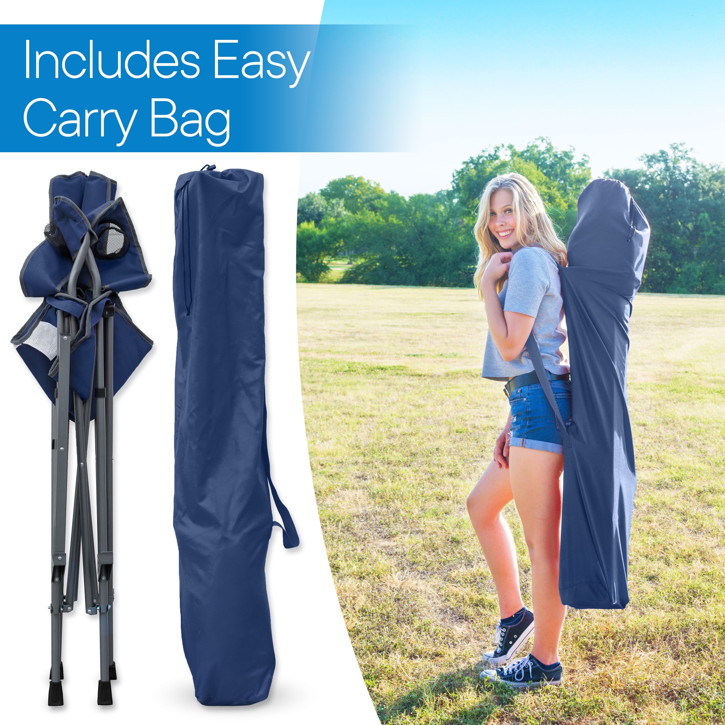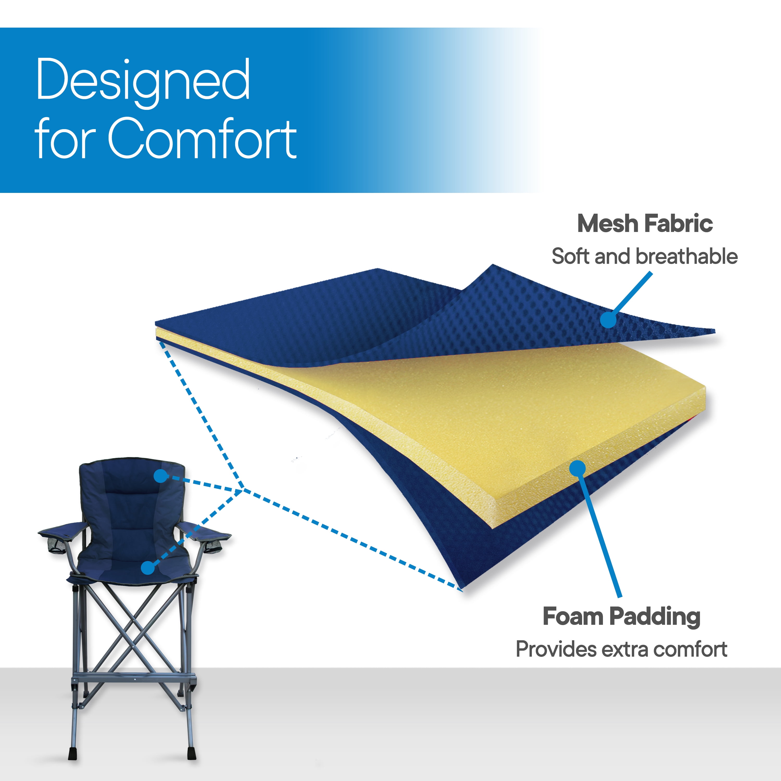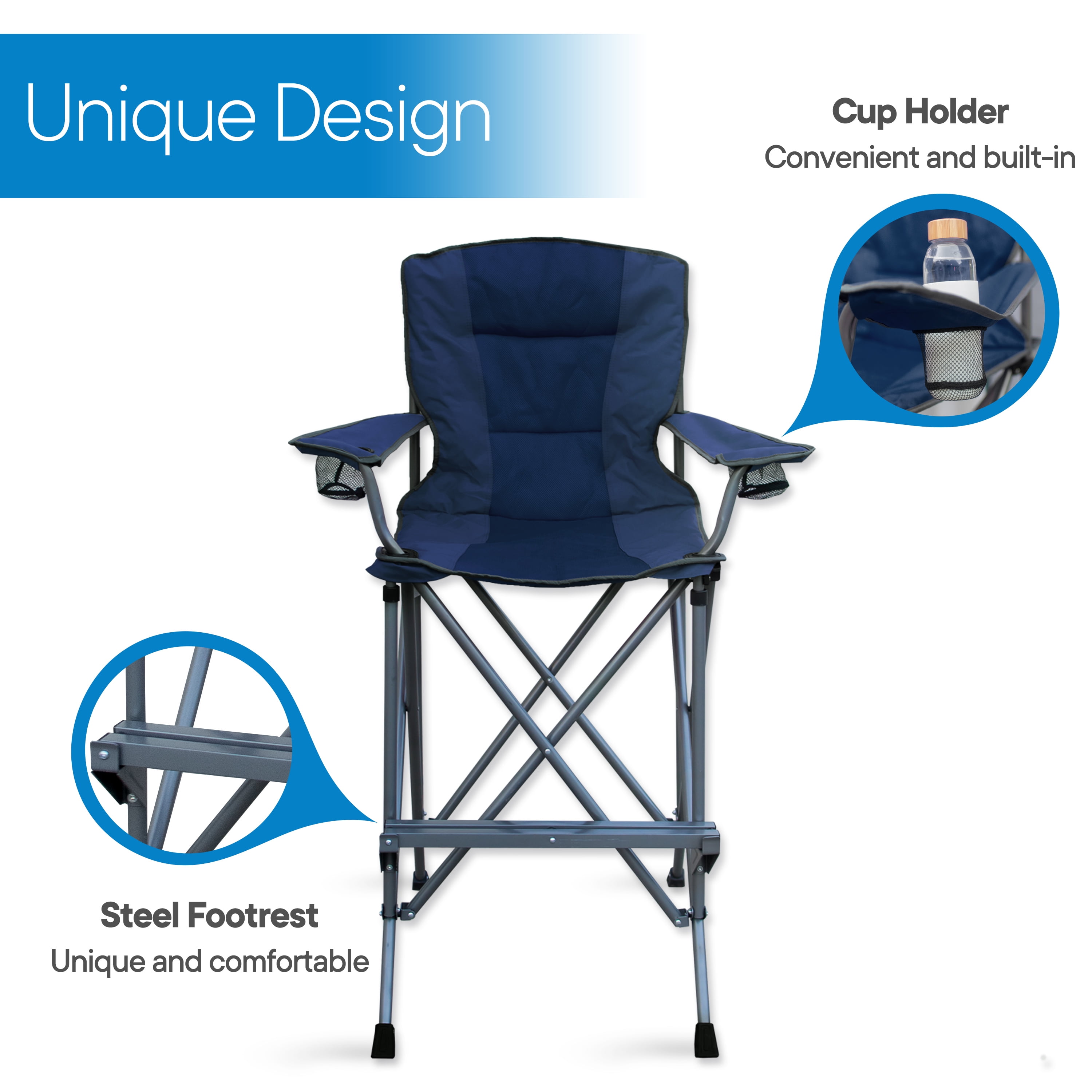 RMS Extra Tall Bar Height Director Chair with Carrying Bag, Blue Extra tall and oversized folding chair weighing approximately 15 lbs, made with a heavy duty steel frame for enhanced durability and safety Supports up to 300 lbs weight capacity; dimensions: 54″ Tall x 34″ Wide x 32″ Deep Designed for unobstructed views, making it ideal for patios, games, and camping trips Fully collapsible and portable; includes a carrying bag for easy storage and transport Features a padded seat and back made of mesh fabric for ventilation, dual cup holders, and a retractable footrest