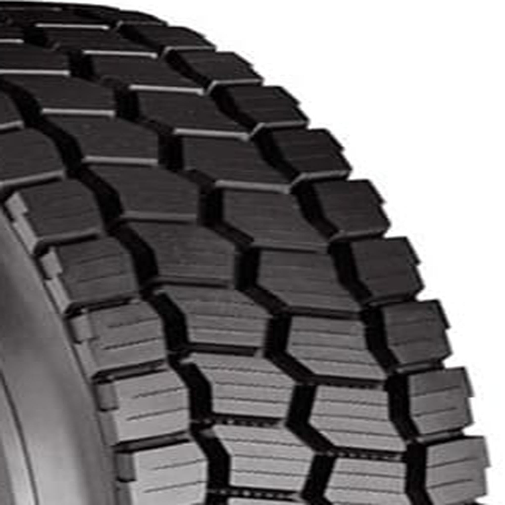 Three Peak Mountain Snowflake certified Full depth 3D siping helps to lock the tread blocks together to maintain stability for traction Stone ejectors in the tread grooves protect the casing from stone penetration Chevron grooves provide more biting edges for enhanced traction Optimized shoulder lugs provide added traction while tie-bars are designed to prevent heel-toe wear Size: 11R24.5 Load Range: H Product May Vary From Picture Wheel/Rim Not Included