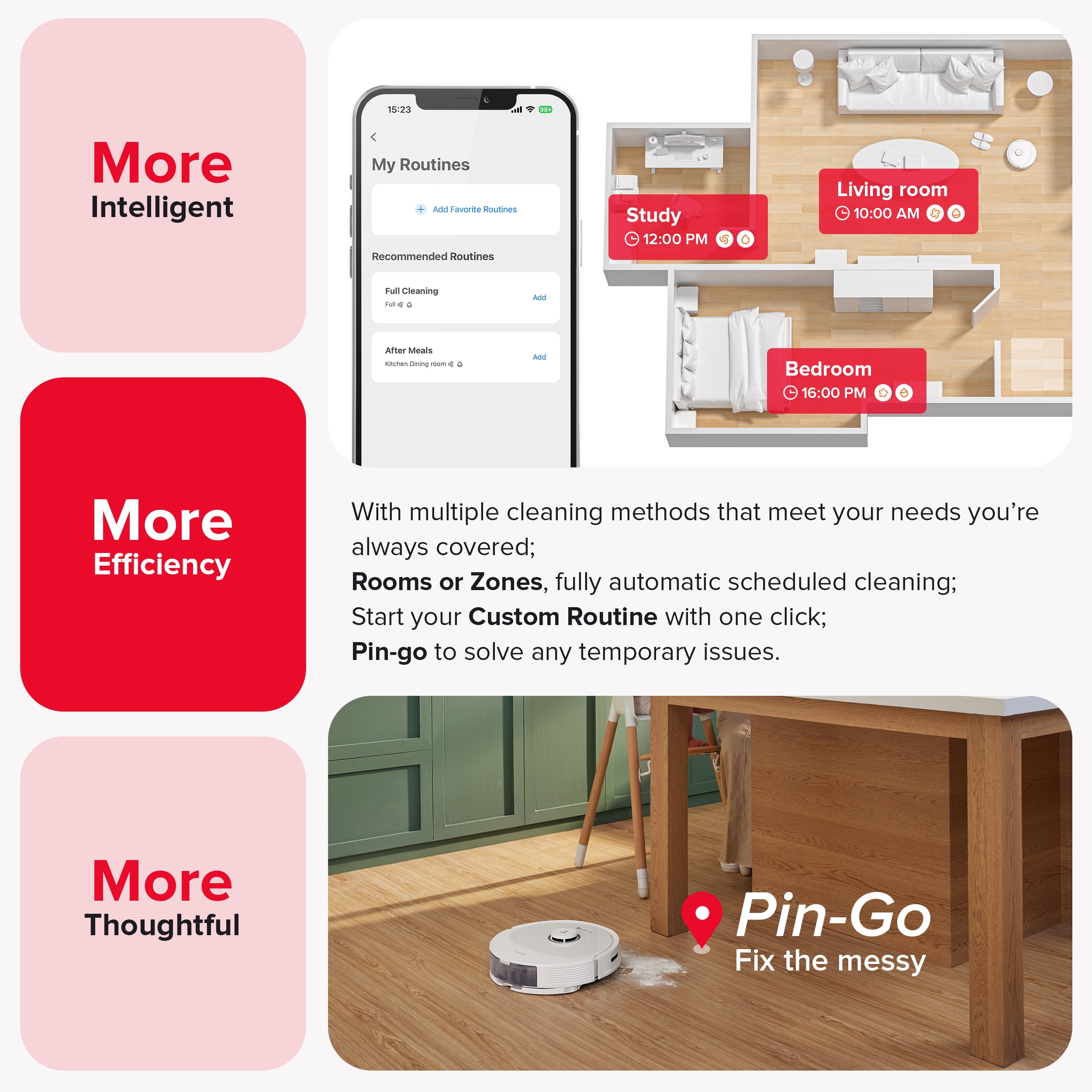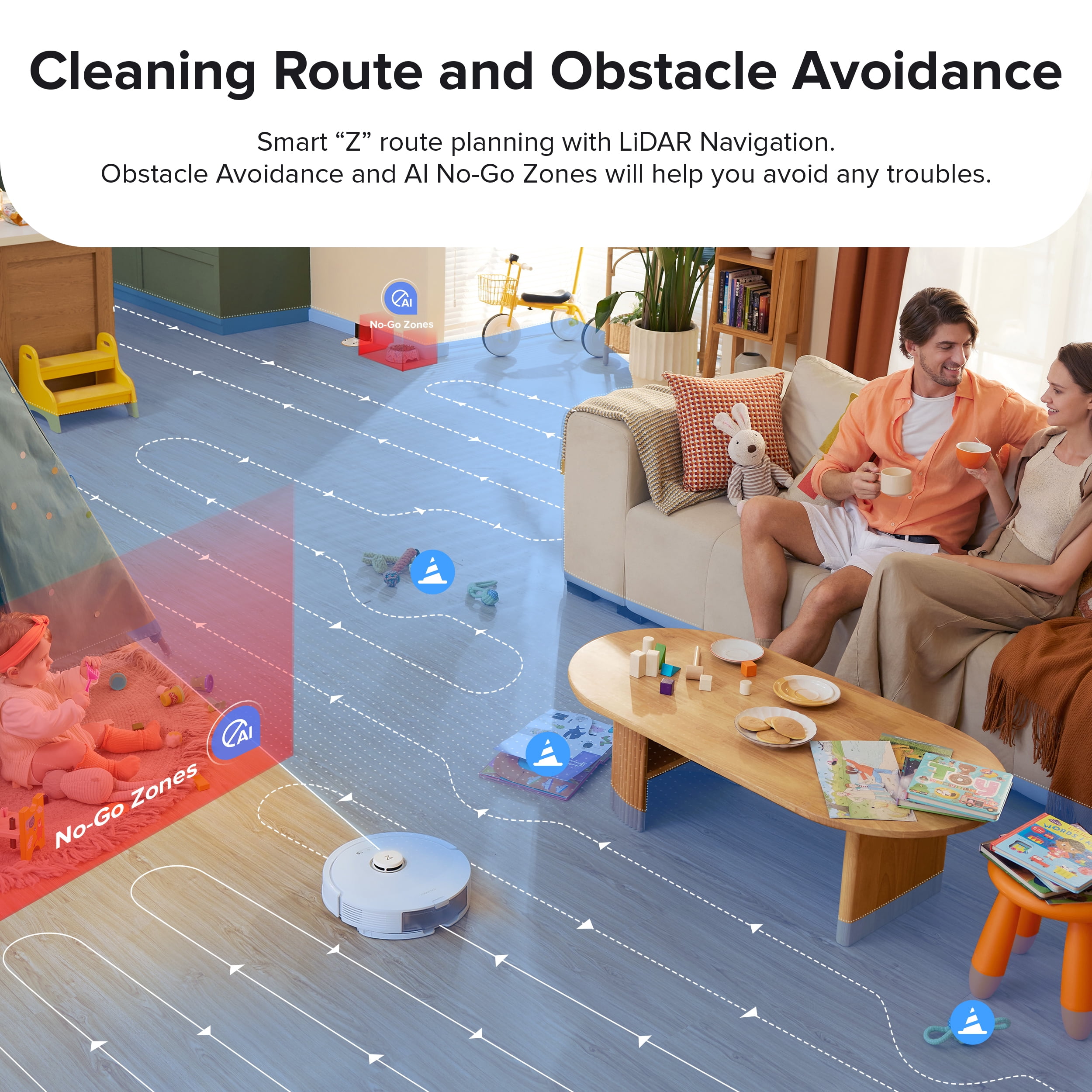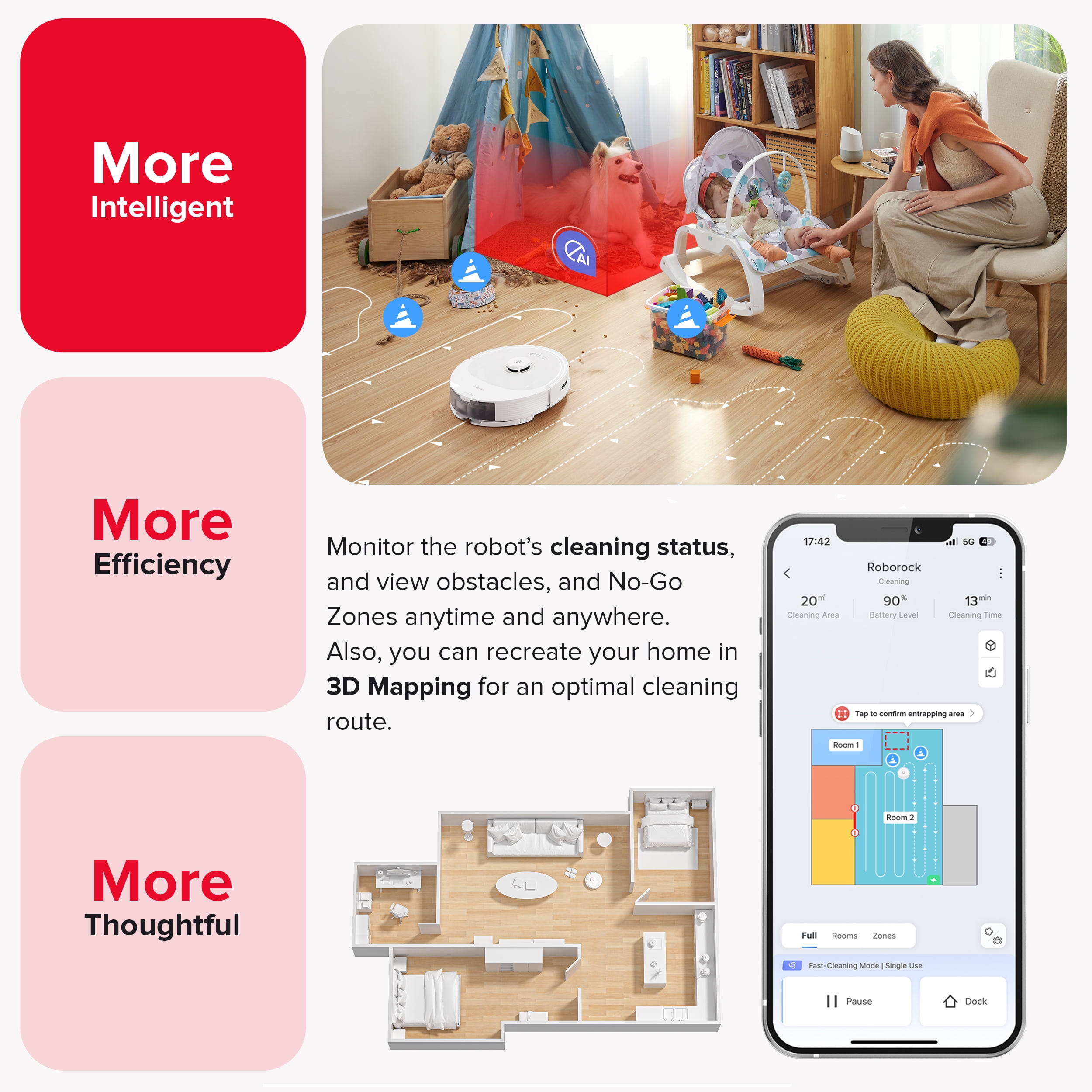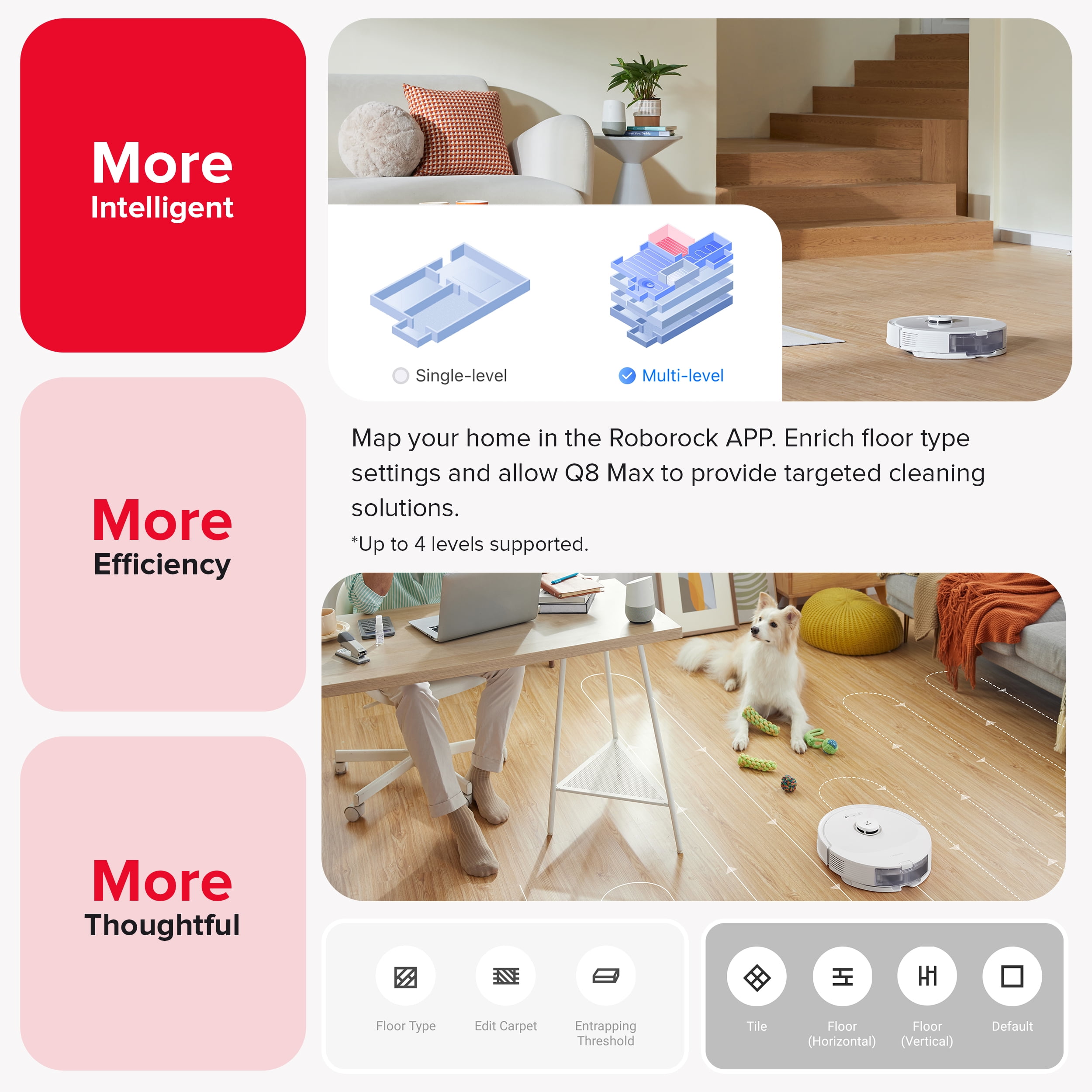 Detects and avoids objects on the floor easily, so you don’t have to pick them up before starting a cleanup. By suggesting No-Go Zones for stairs and easy-to-get-stuck places, the Q8 Max can prevent mishaps, allowing you peace of mind while it navigates your home. PreciSense® LiDAR Navigation creates detailed and accurate maps, enabling the Q8 Max to identify the most efficient route to navigate and optimally clean your home. Introducing the DuoRoller™ Brush, the latest in Roborock’s cleaning technology, designed to enhance vacuuming performance on carpets, ensuring fewer hair tangles, and providing a hassle-free cleaning experience. * HyperForce® suction power has been upgraded to 5,500 Pa*, allowing the Q8 Max to easily remove dirt and pet hair from different types of floors, leaving you with a spotless living space every time. * Q8 Max can vacuum and mop simultaneously to capture fine dust that vacuuming alone might miss. With 30 water flow levels, you can adjust the flow to meet your specific cleaning needs. Obstacle Avoidance and AI No-Go Zones Precise Mapping for Smart Navigation Double Rollers for Double the Power Impressive 5,500 Pa Suction Power Remove Dust You Hardly See Custom Cleaning Routine Seamless Floor Cleaning Fast Cleaning Voice Control