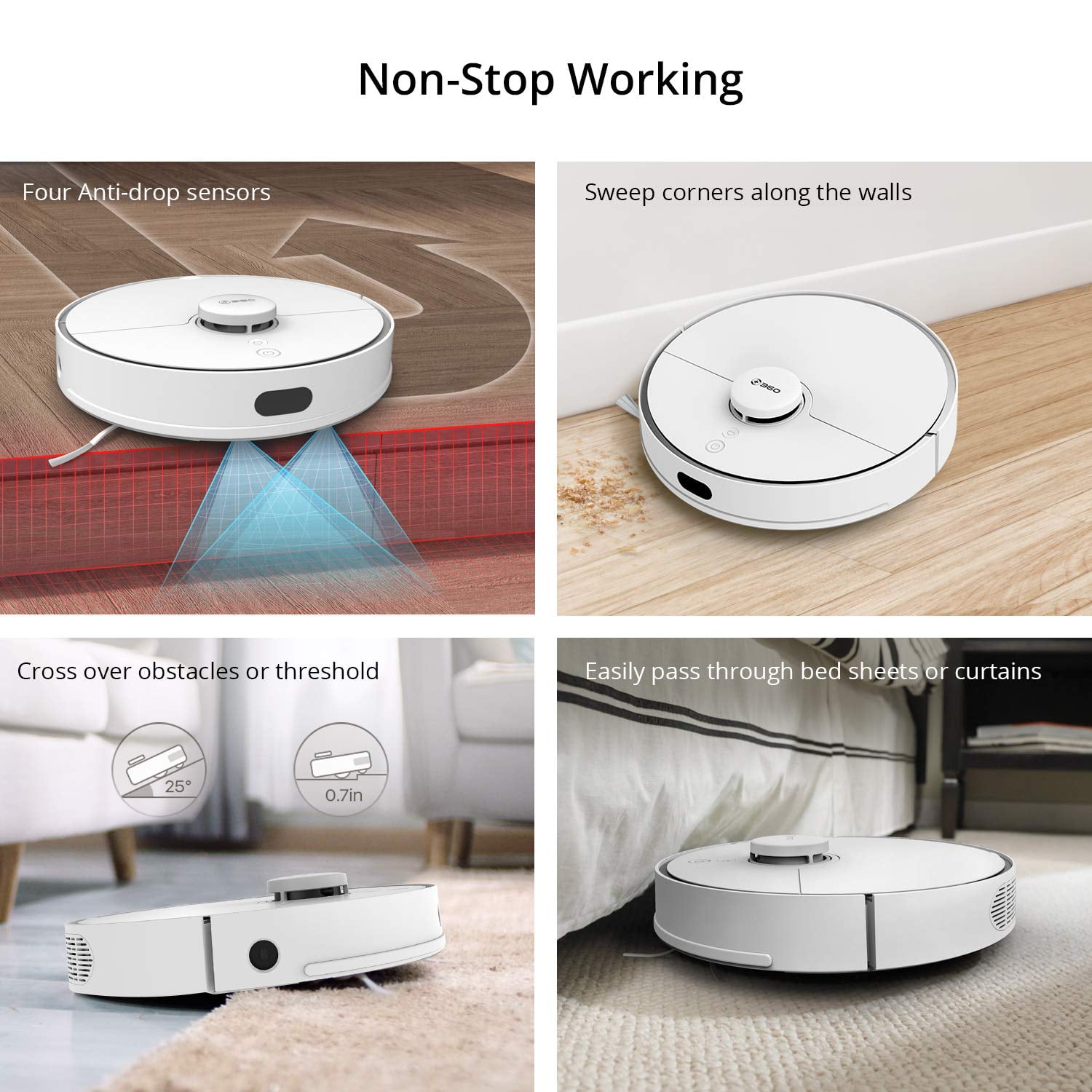 【LASER NAVIGATION AND SMART SYSTEM】-Works even in total darkness with highly accurate HD maps generated by the LDS LIDAR. Builds and saves the maps of your home intelligently and plans the best cleaning path with SLAM algorithm. Identifies carpet and automatically switches to Max Mode with 2000Pa suction power for deep cleaning. Automatically recharges when battery runs low and resumes cleaning 【MULTIPLE SENSORS COORDINATION】-Anti-collision sensors avoid furniture damages, prevent getting stuck in narrow spaces under furniture, and easily pass through bed sheets or curtains. Anti-drop sensors prevent vacuum from falling. Wall sensor sweeps around corners and along the walls 【SMART APP】- Off-limit Area, WI-FI Connectivity, Multi-map Management, Scheduling, Custom Cleaning, Remote Control, 3 Suction Levels, Spot cleaning mode, Proximity cleaning Mode, and more 【CONSIDERATE DESIGN】-Washable filter maintains high filtration even after one year of use. Vacuum stays close to the ground over a variety of cleaning surfaces, providing maximum cleaning power with the proprietary floating main brush 【WHAT YOU GET】-360 S5 Robotic Vacuum Cleaner, Charging Dock, Power Adapter, Dusting Brush and Instruction. Welcome guide and our worry-free 12-month warranty for the robot vacuum. Phone: 1-855-360-8800(U.S.) Mon~Fri 9:00am~5:00pm (PST),Email: [email protected]