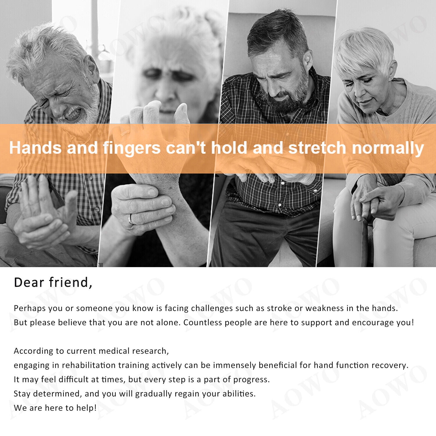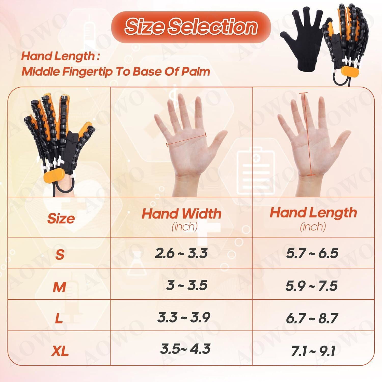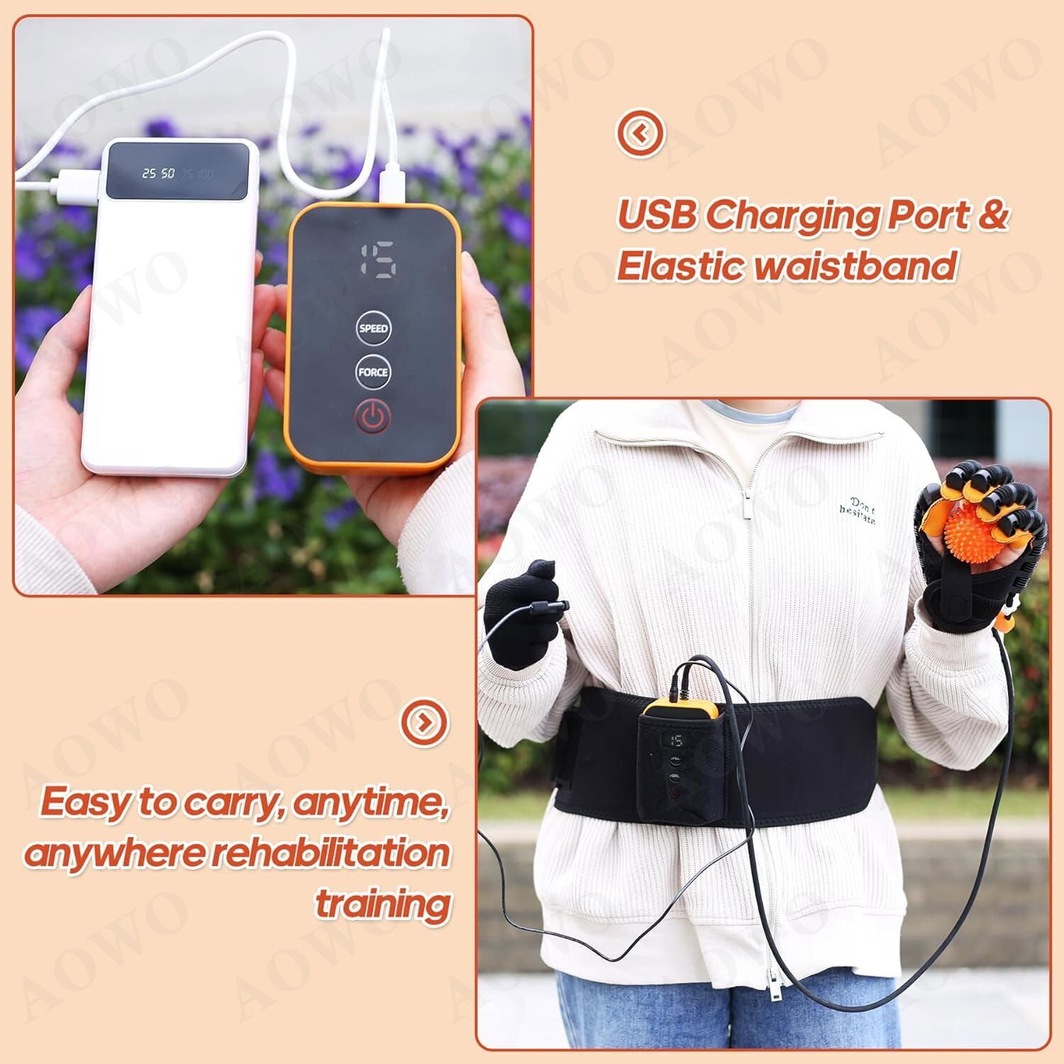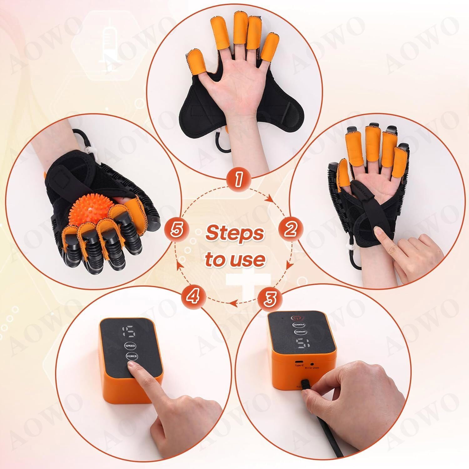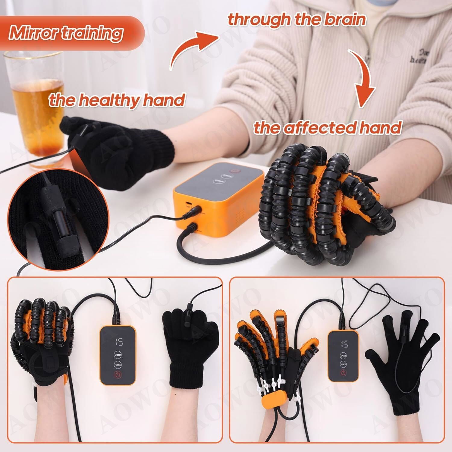 ⌛AOWO Rehabilitation Robot Gloves Hemiplegia Hand Stroke Recovery Equipment ⌛AOWO is a brand specializing in Automatic Hand Trainer Gloves. We collaborate with experts in rehabilitation medicine and use the latest technology to enhance functionality. Our goal is to provide better glove solutions for patients, helping them regain hand function and return to normal life. We also participate in public welfare activities and promote rehabilitation knowledge for a positive impact on society. ✅VERSATILE SPLIT-FINGER TRAINING: Equipped with independent air valve switches, the robot hand glove offer single finger, double finger, and multiple finger training options. ✅CONFRONTATION MODE: The confrontation training mode intelligently simulates gripping and bending actions, enhancing hand flexibility and promoting hand function rehabilitation. ✅MIRROR TRAINING: Robot Gloves utilize cutting-edge wireless mirroring technology to promote brain function reshaping.