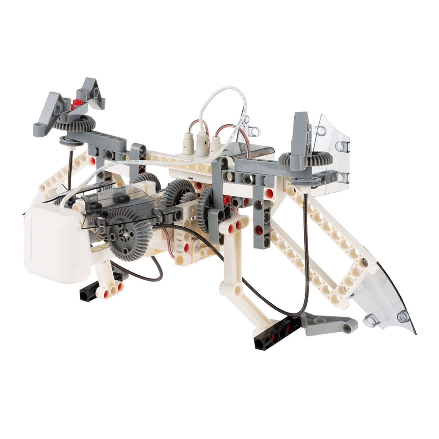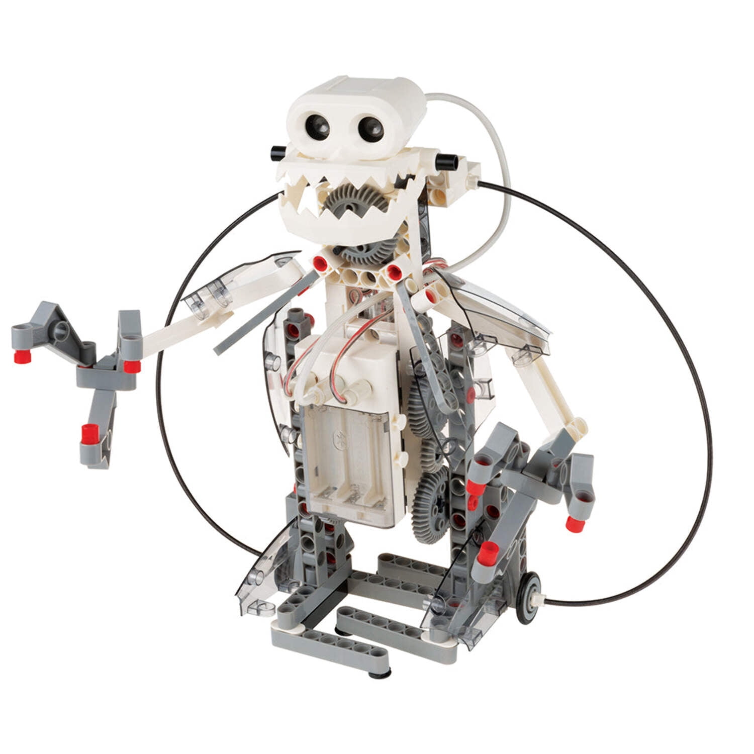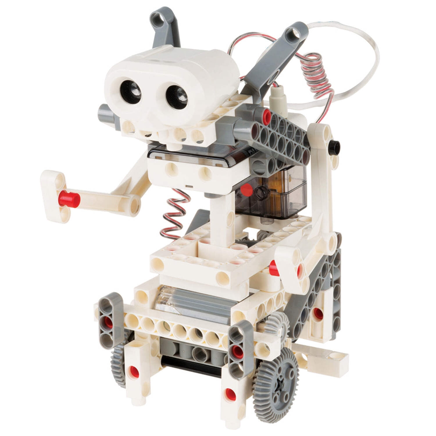 Robotics is a vast, thrilling, and sometimes overwhelming interdisciplinary field involving physics, engineering, and computer science. This kit gives kids a simple, fun, and customizable introduction to robotics that lets them build eight motorized machines controlled by programs and an ultrasound sensor. Kids code the programs using an easy, visual programming app on a tablet or smartphone, which connects to the robot models via a wireless Bluetooth connection. The ultrasonic sensor works on the same principle as sonar. It sends out sound waves, which bounce off objects. The sensor interprets the echoes returning to it, and from this detects objects in the path of the sensor. Using the app interface, you can program the robots you build to behave based on the feedback coming from the ultrasound sensor. Build a bipedal robot that walks forward on two legs and pivots to avoid obstacles in its path. An awesome beetle robot moves backwards or forwards in response to an obstacle, and opens and closes its pincers. Construct a funny crocodile model that wags its tail if no object is in sight, but then opens its giant jaws when an object approaches. Using an additional smartphone and tablet, you can even hack together a cute little spy bot that roams around and streams video back to the tablet screen. A cool tiltrotor aircraft model simulates vertical takeoff and landing by rotating its propeller blades 90 degrees. You can also assemble other fun robots including a robo dog and robotosaurus. After you have learned how the technology works, you can build and program your own robots using the kit’s 230 building pieces. A full-color, 64-page step-by-step illustrated manual helps kids assemble all of the models and teaches them about robotics in the real world. The visual programming language allows you to command the robots’ motors to move at different times, different power levels, in different directions, and in response to the data from the sensor. You can also add simple sounds to your programs. Requires a tablet or smartphone running iOS or Android. Please check the app stores for compatibility and device requirements. Product Information Ages: 8+ Experiments: 8 Piece Count: 230 Manual Pages: 64 Product Dimensions: 16.8 x 11.5 x 3.2 in. Product Weight: 3 lbs Manual Dimensions: 8.25 x 11.5 in. Batteries Required: AA (3) Country of Origin: Taiwan Year Released: 2015 Awards 2016 Parents’ Choice Gold Award NGSS Correlations 4-LS1-2 Structure, Function, and Information Processing 4-PS3-4 Energy Downloads Complete Manual Download Hi-Res Images Download the App