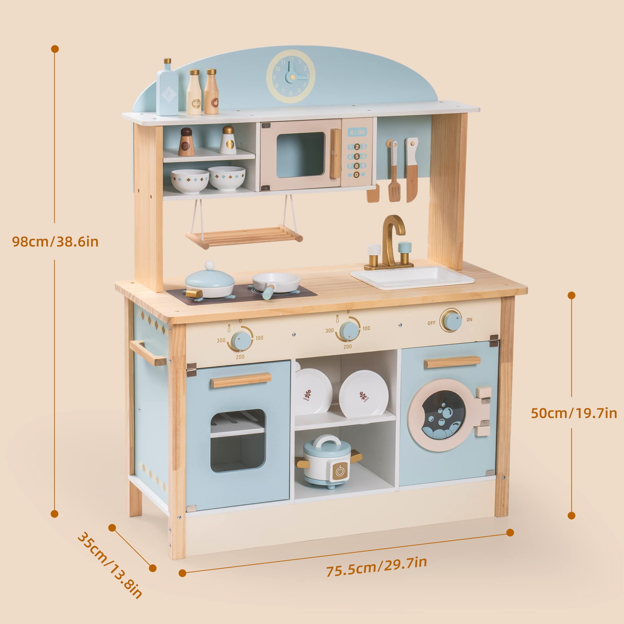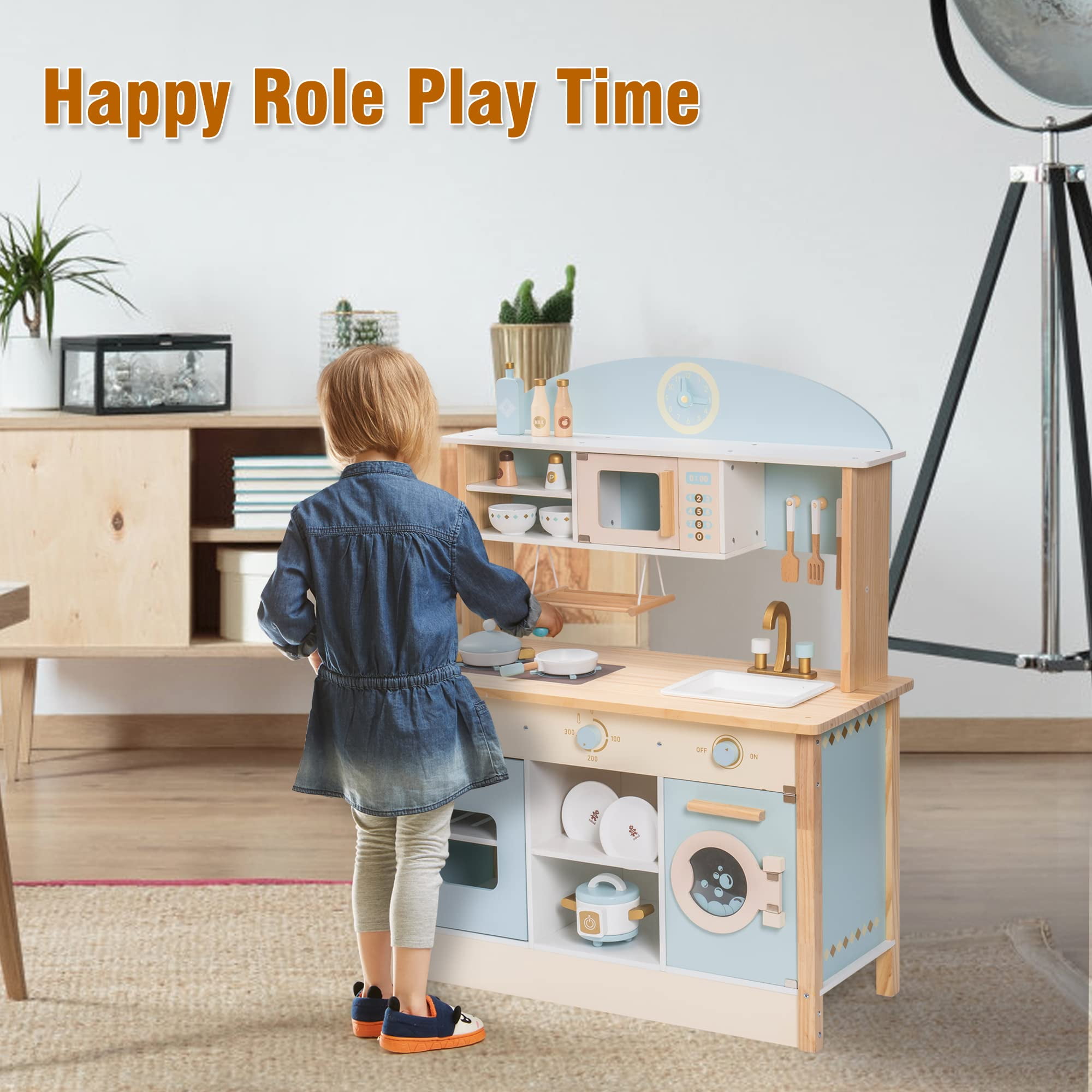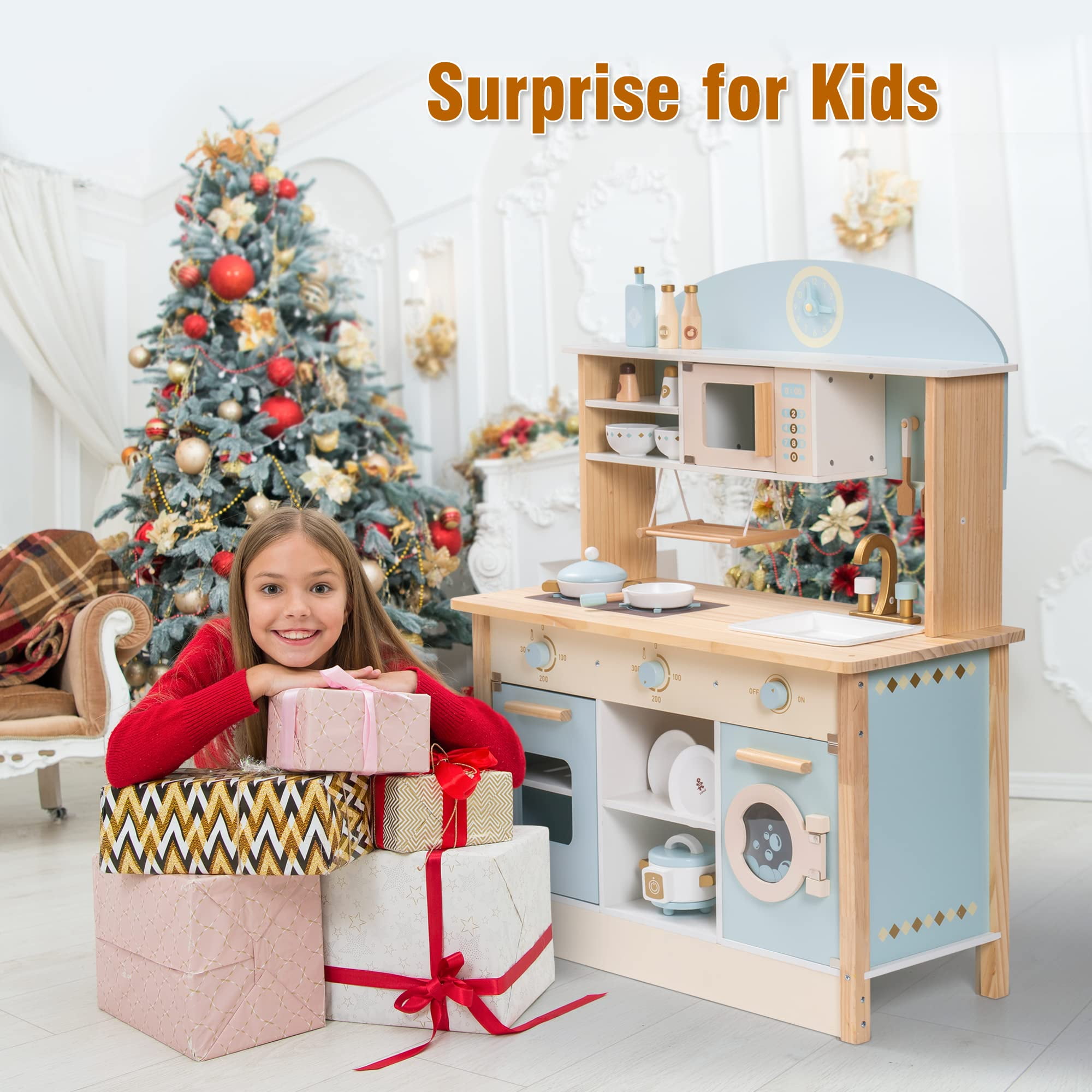 Robud Luxury Kids Play Kitchen Playset, Wooden Pretend Playset with Microwave Oven, Clock,Towel Rack,Toy for Toddler,Blue