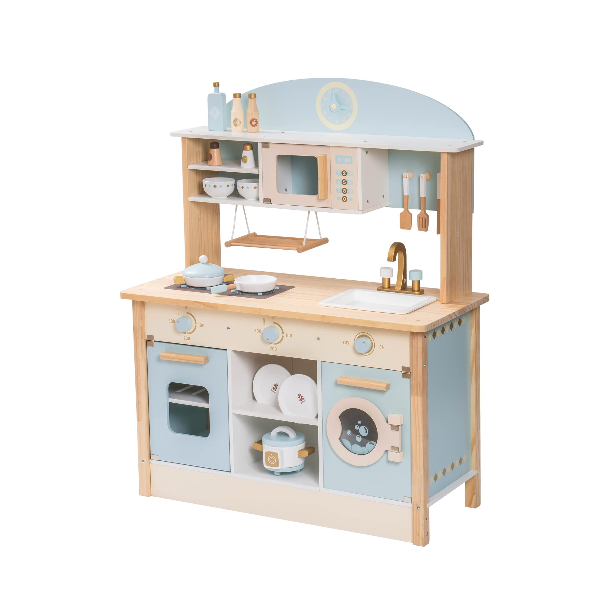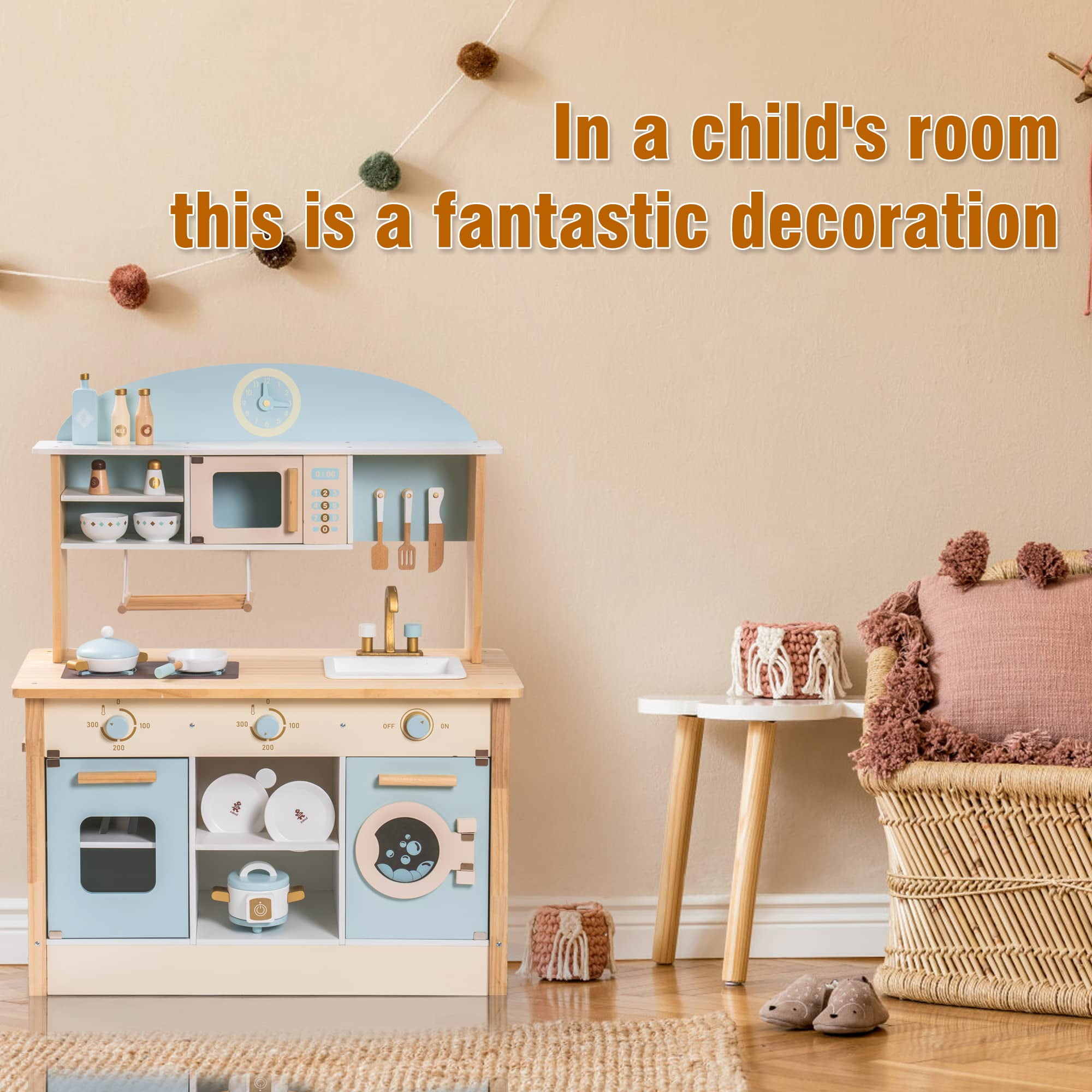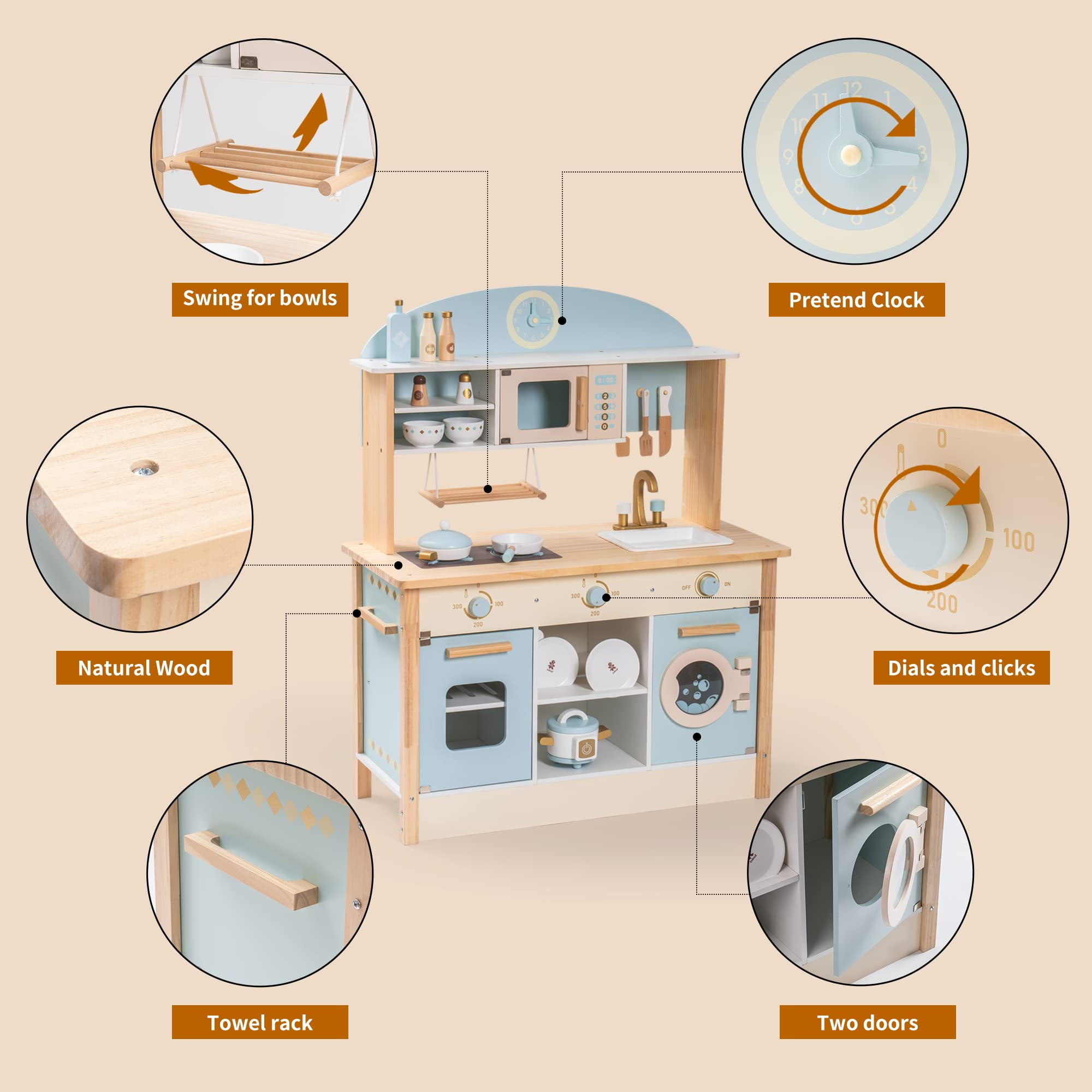 Robud Luxury Kids Play Kitchen Playset, Wooden Pretend Playset with Microwave Oven, Clock,Towel Rack,Toy for Toddler,Blue