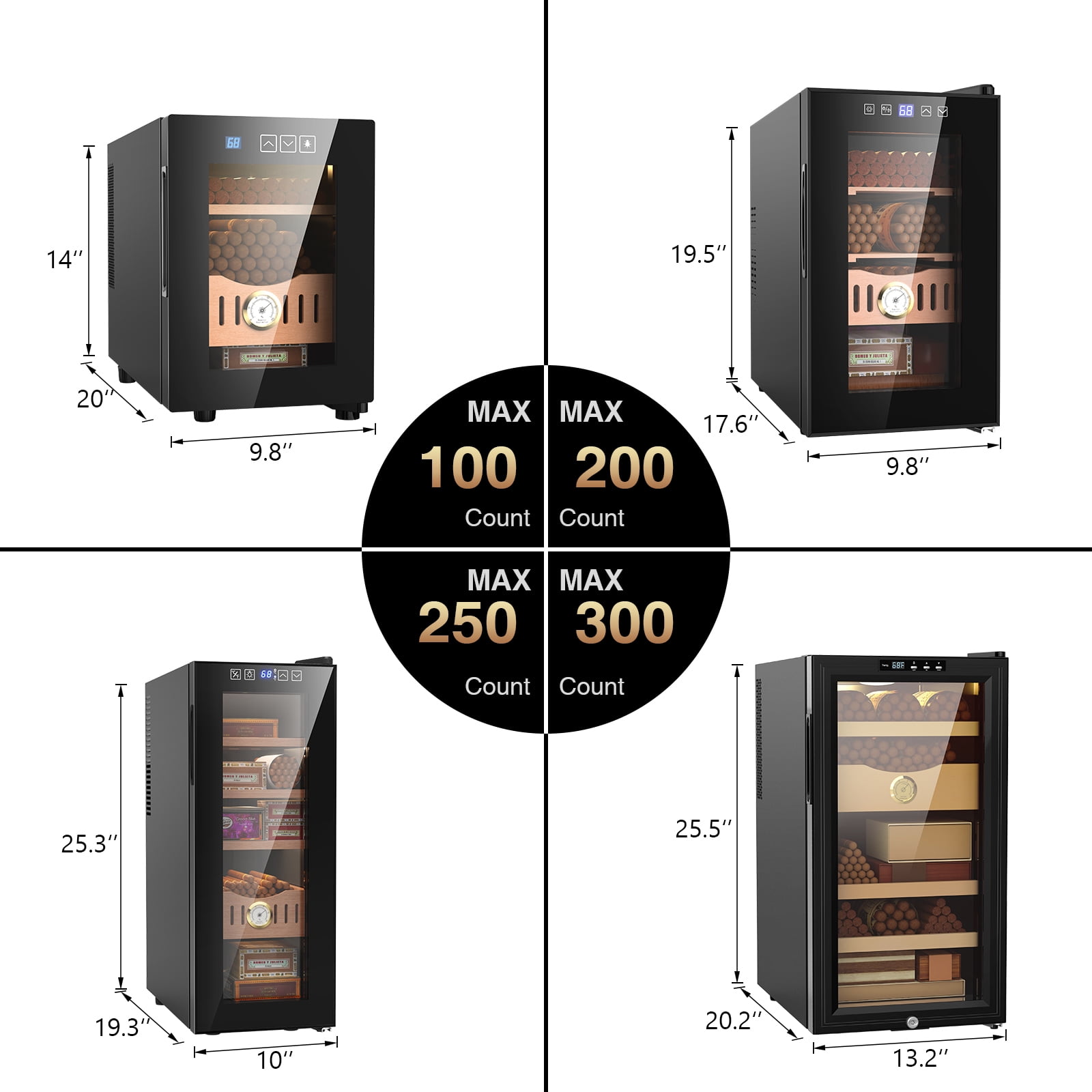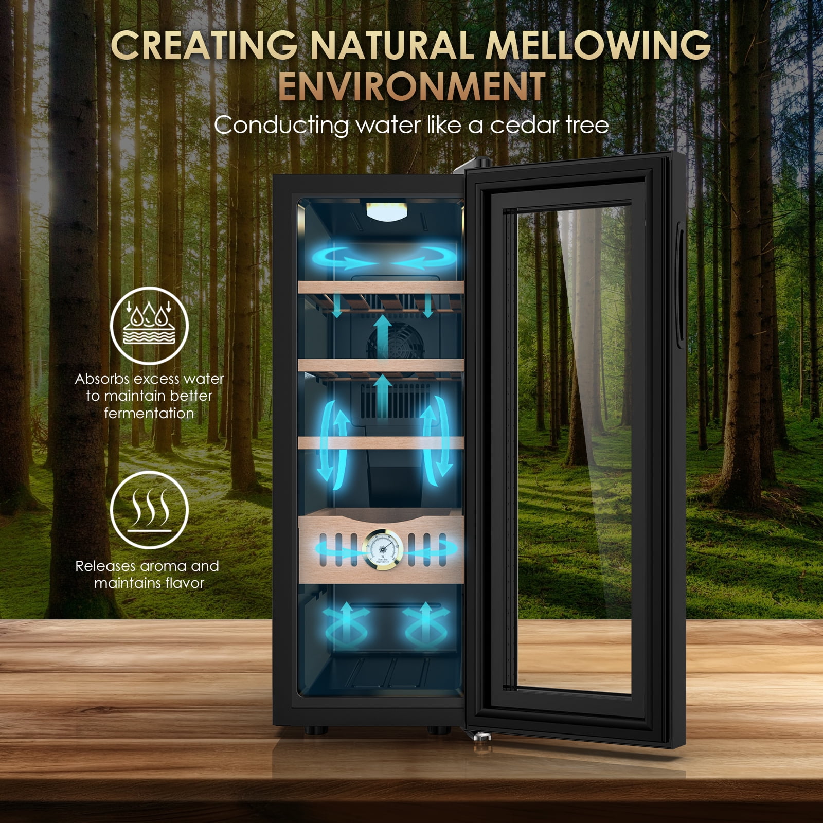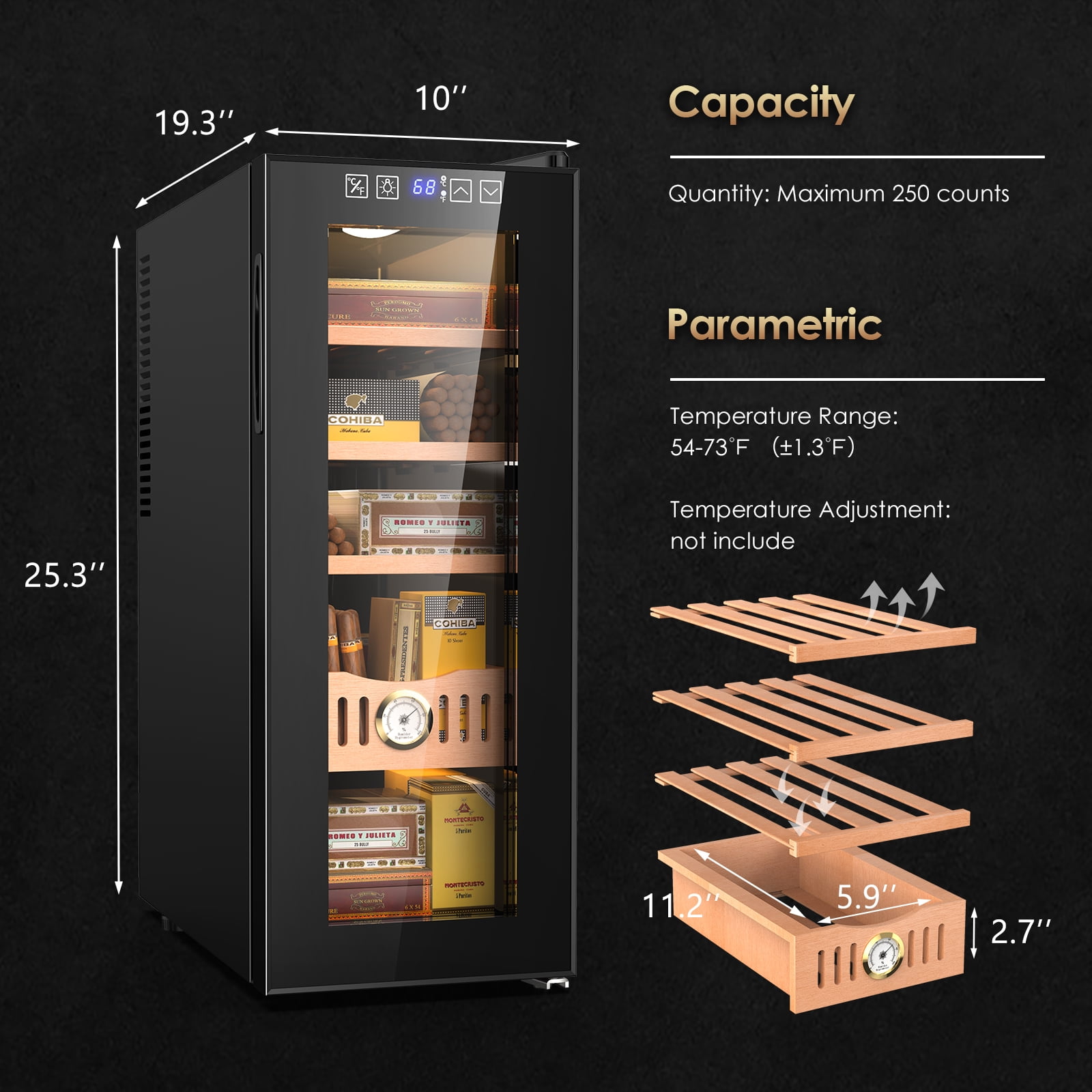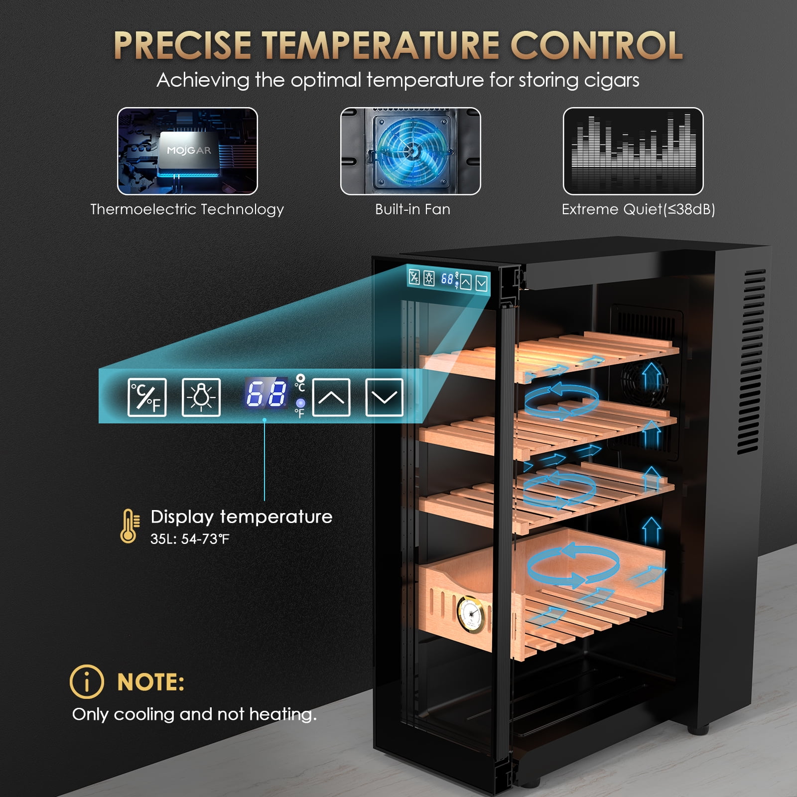 Rocita Electric 35L Cigar Humidor Cabinet, 250 Cigars Electronic cigar cabinet with a temperature range of 54 to 73 Fahrenheit for optimal storage conditions Capacity to store up to 250 items with ultra-quiet operation below 30dB Constructed from Spanish cedar wood, enhancing aroma and flavor of cigars Dual pane insulated glass door with touch control for easy access and temperature stability 360-degree circulating air cooling system for uniform humidity throughout the cabinet