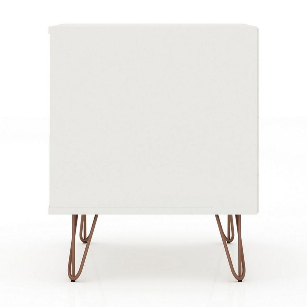 Moonlighting as an end table or armchair sidekick, the Rockefeller nightstand is seamless and sophisticated, with plenty of Mid-century flair, enhanced by edgy metal splayed legs, cutout drawer handles, and clean lines, to feature one sophisticated design. Tuck away remotes, books, tablets, and more, in the concealed drawer space, and keep magazines, laptops, or books, in the open shelf space for easy access. Add a decorative lamp and favorite framed photos on its base and set it in the living room or bedroom to finish off the space. Features: Material: Engineered wood Finish: White Upon assembly Choose your handle design when the product is at your home! option for cut-out edge handle, or flush design look. Fashionable wire splayed legs made of metal for extra durability. Perfect for storage or display items. Home assembly required. All hardware included. Specifications: Product Dimensions: 21.65″H x 20.08″W x 17.62″D Product Weight: 32.29 lbs Number of Drawers: 1 Number of Shelves: (Open) 1 Weight Capacity: 11 lbs (per shelf and drawer)