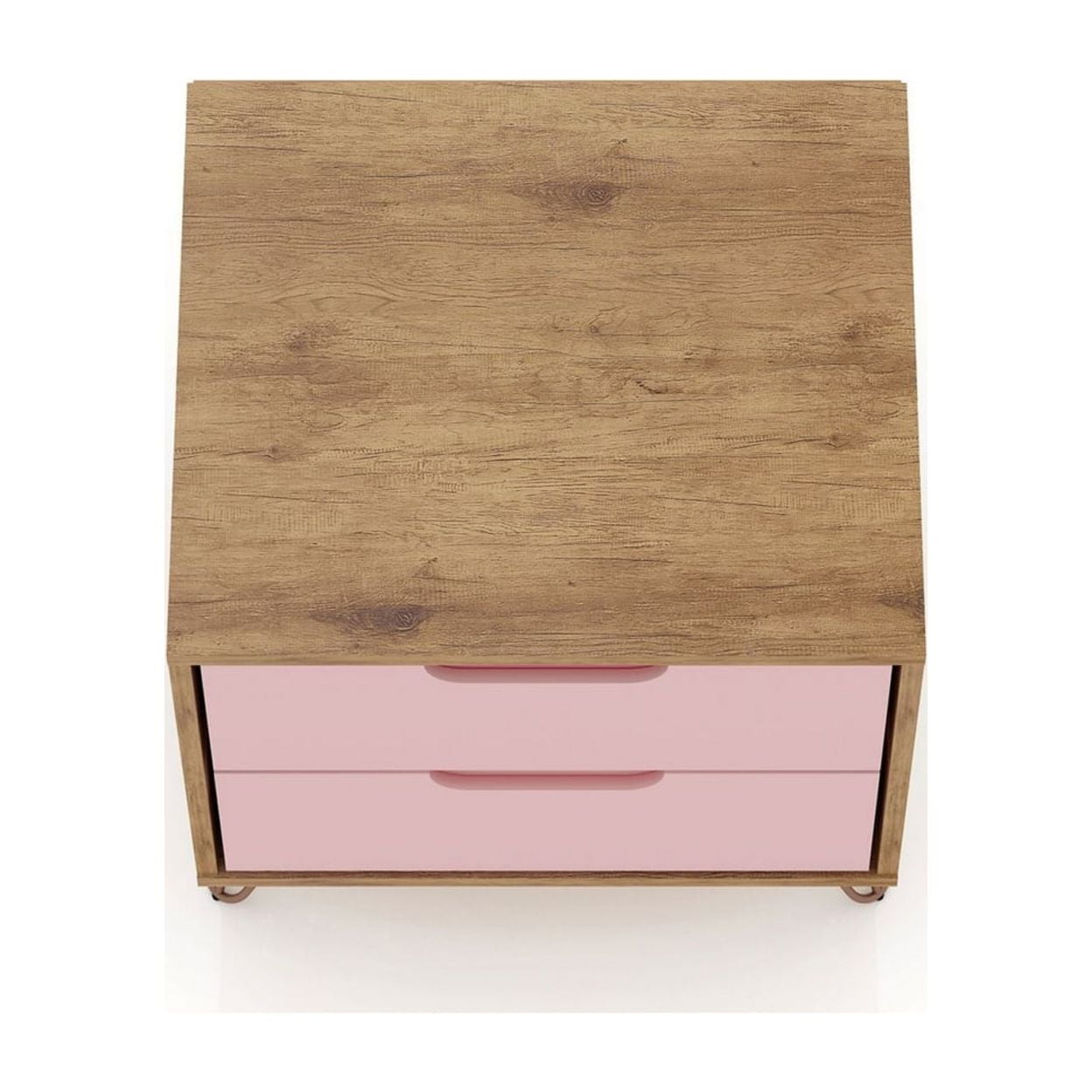 Material: Engineered wood Finish: Rose pink, natural Upon assembly Choose your handle design when the product is at your home! option for cut-out edge handle, or flush design look. Includes 2 spacious drawers with simple 0.75 gliding mechanism. Fashionable wire splayed legs made of metal for extra durability. Perfect for storage or display items. Home assembly required. All hardware included.