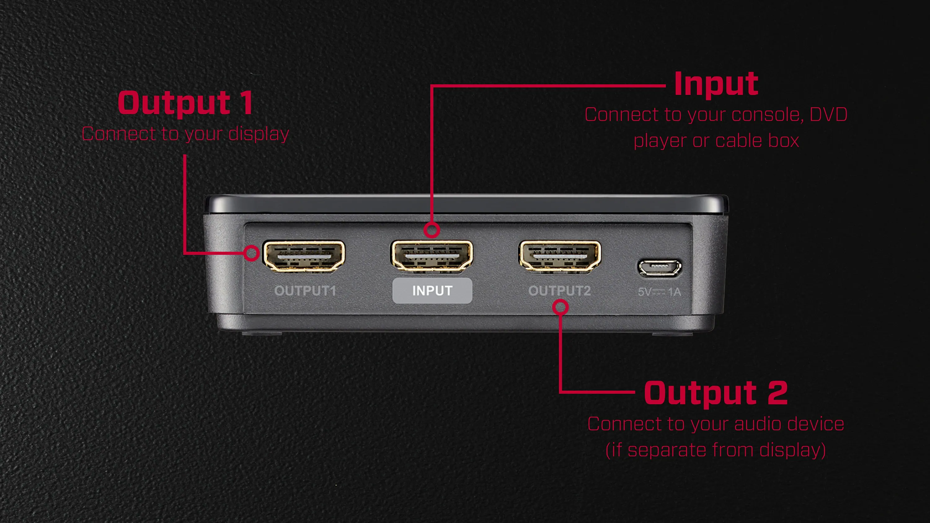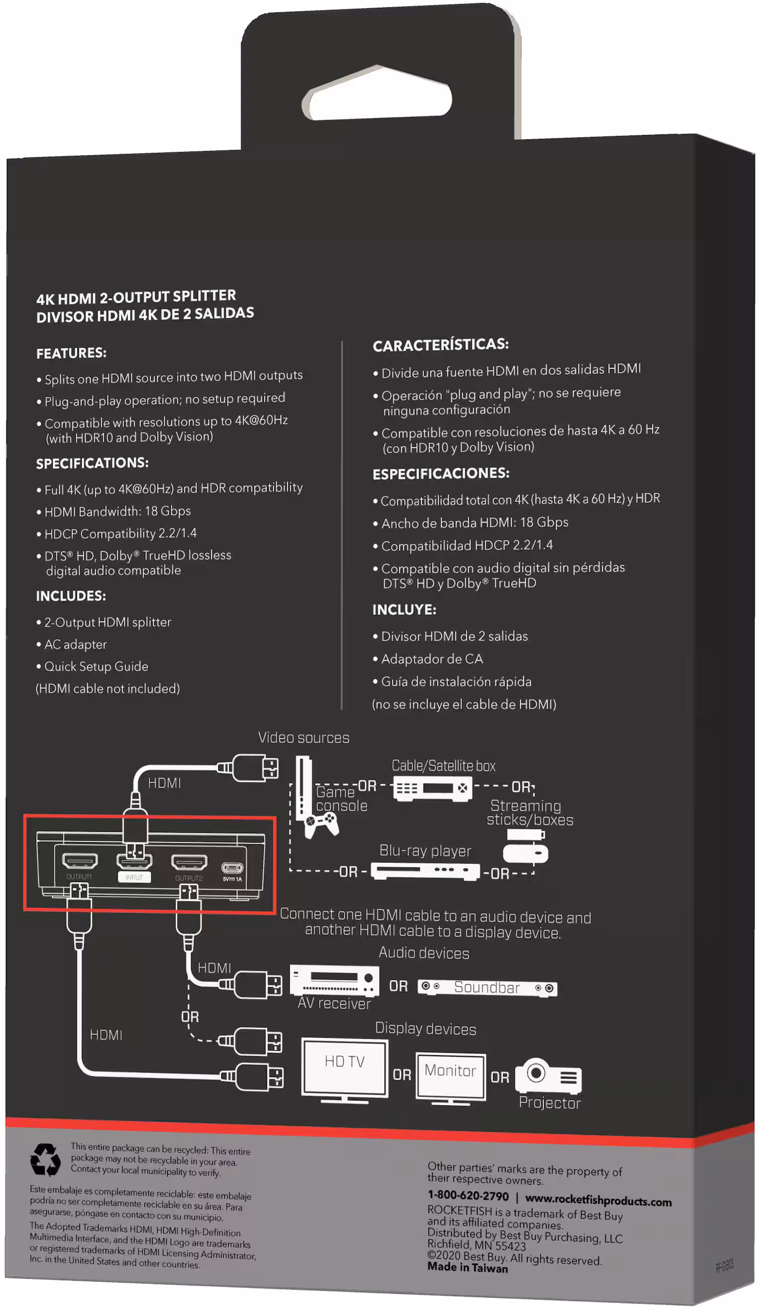 Use this Rocketfish 2-Output HDMI Splitter with 4K at 60Hz and HDR Pass-Through to create two outputs with one HDMI signal. It has a plug-and-play interface with no setup necessary, and it has full 4K and HDR compatibility to accommodate the latest visual displays. This Rocketfish HDMI splitter retains the sound and image quality of the original input.