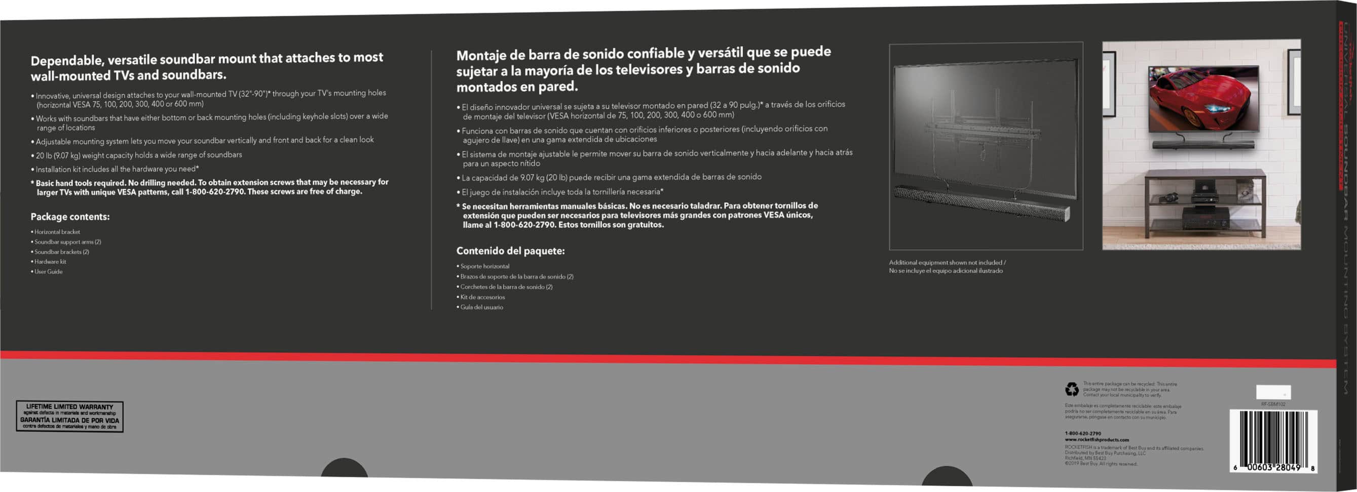 Conserve space and create a sleek home theater with this Rocketfish black soundbar mount. The high-quality construction is durable for long-lasting quality, and the 20-lb. capacity supports most units. This VESA-compliant 75x75mm and 600x600mm Rocketfish black soundbar mount offers multiple mounting options, and the included adapters and hardware support simple installation.
