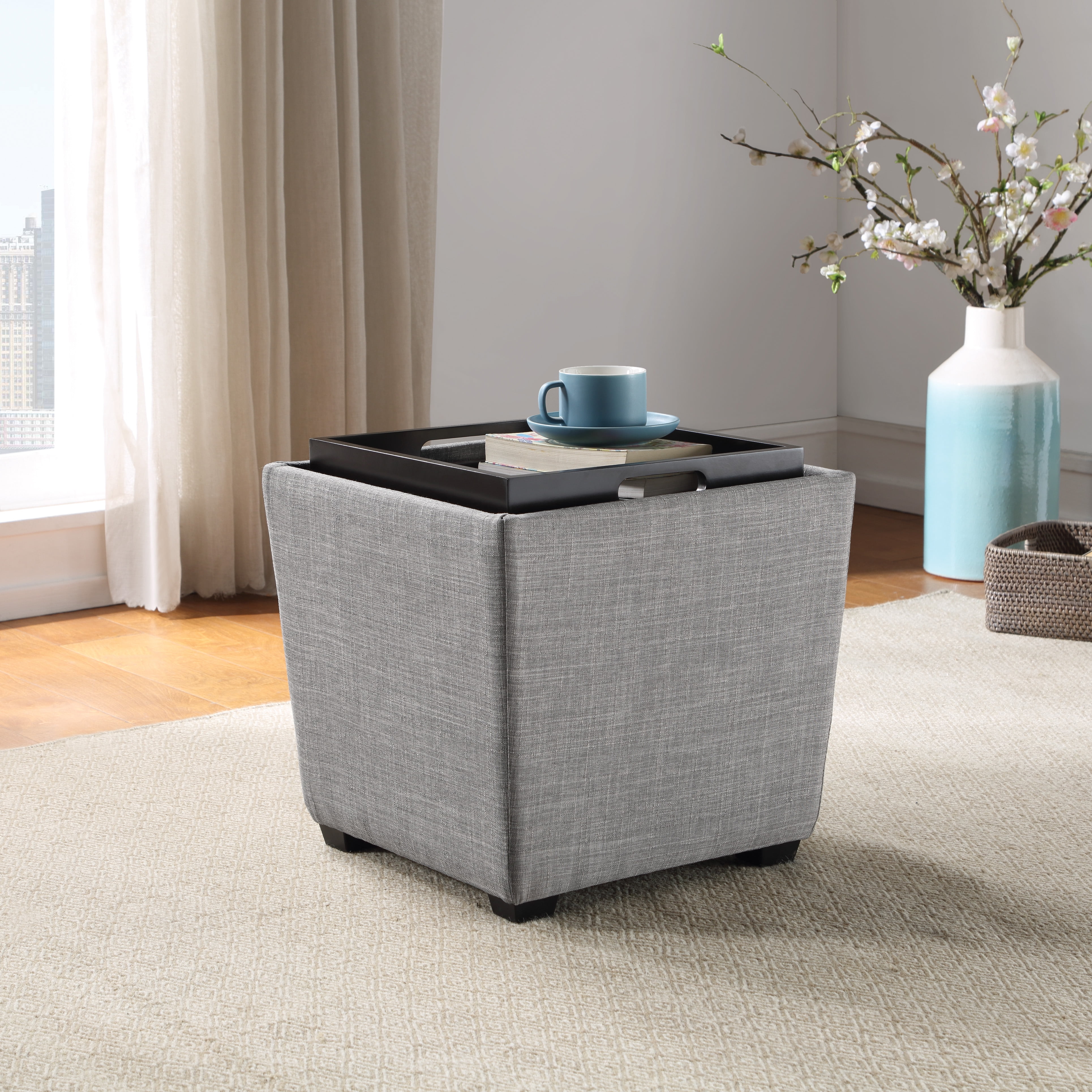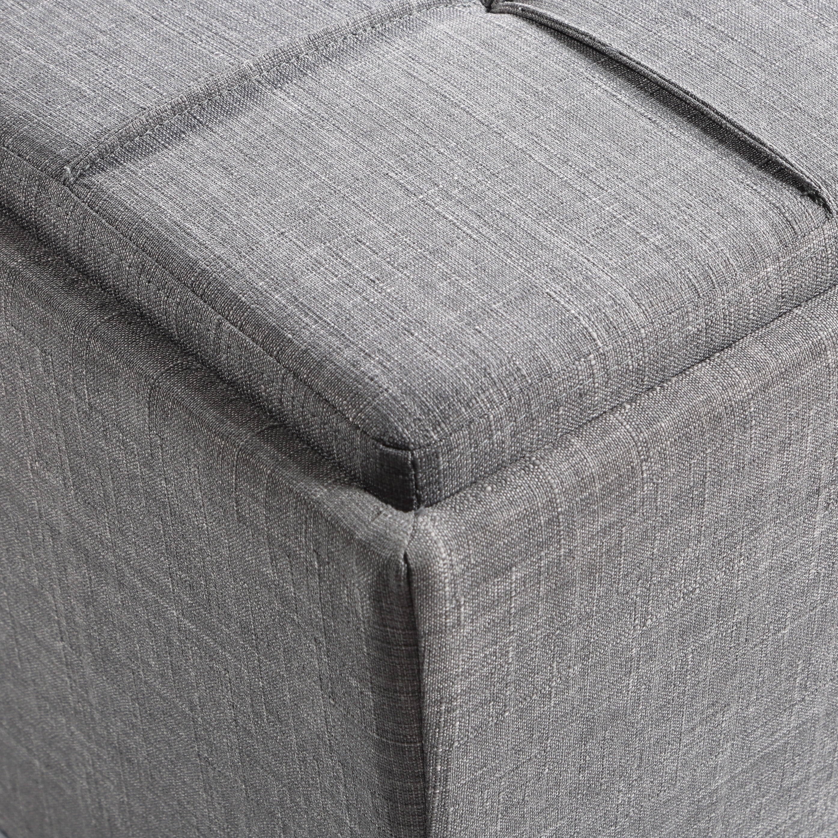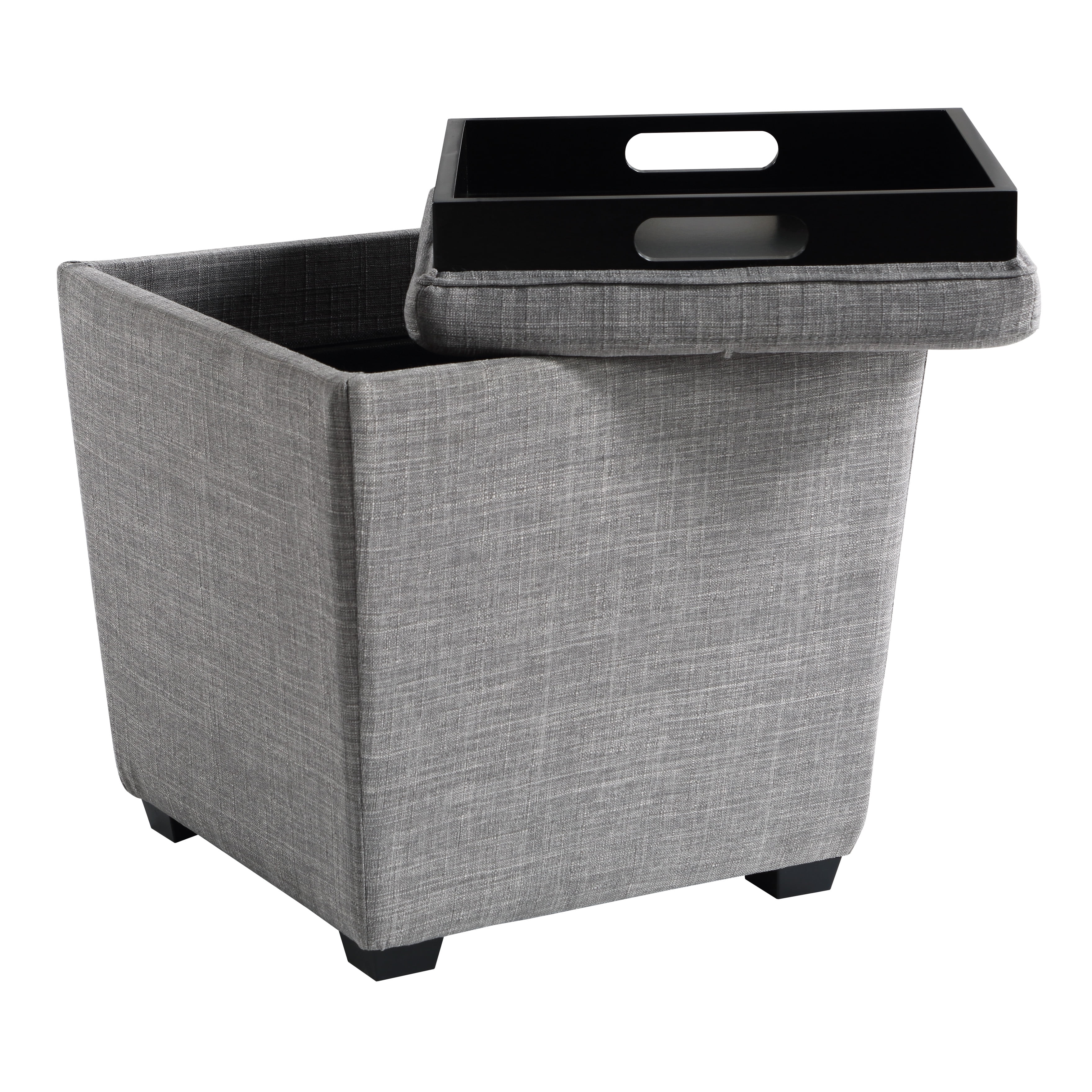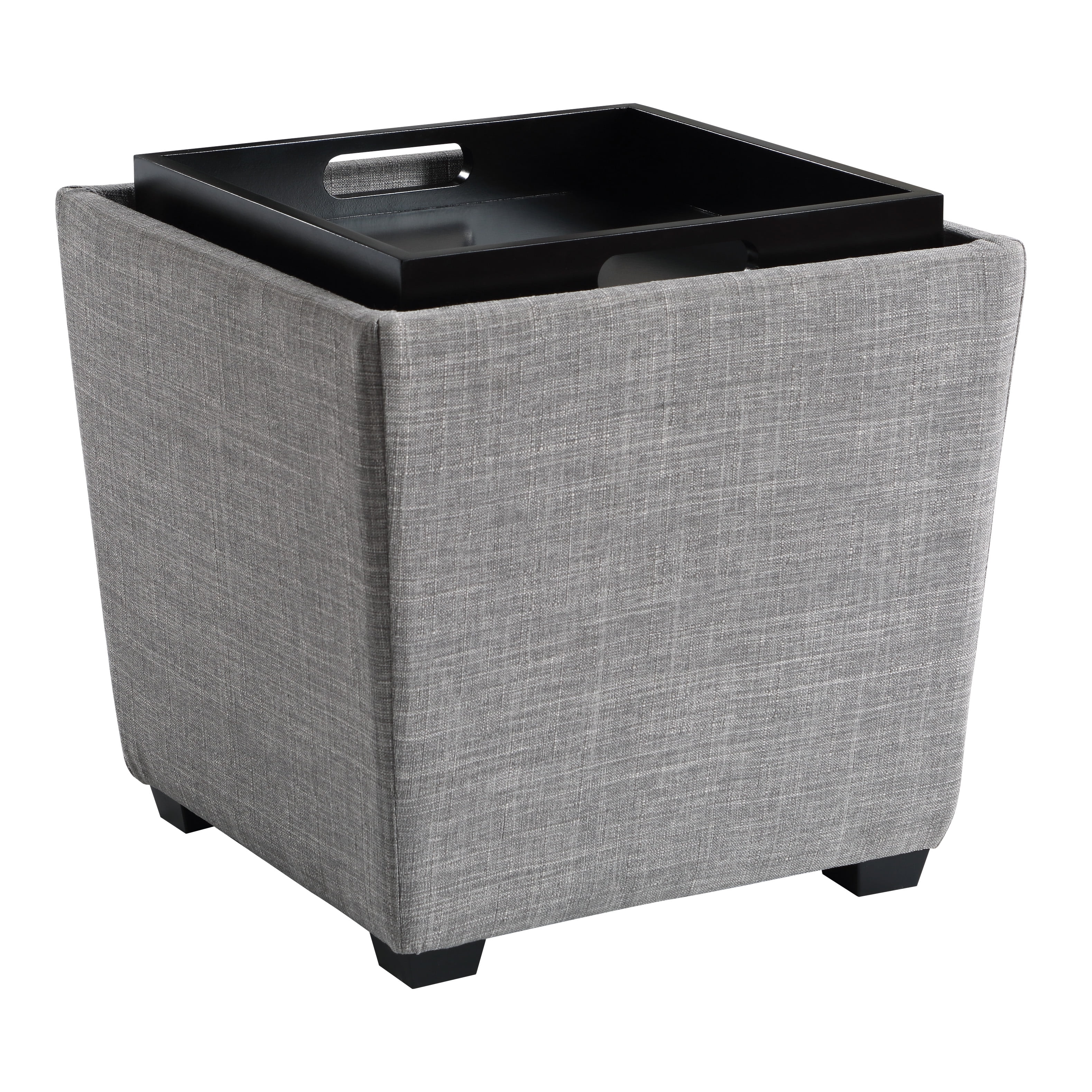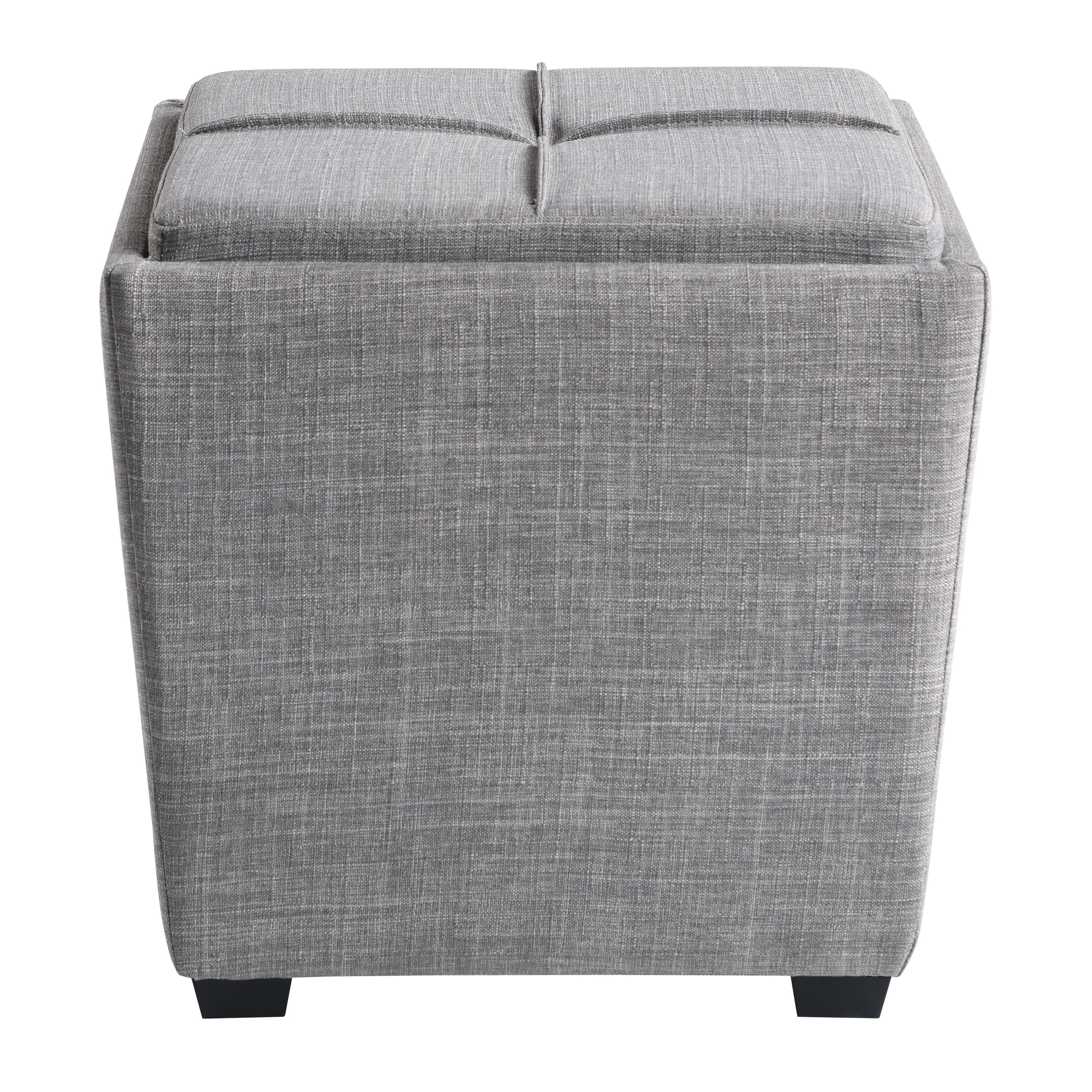 Rockford Storage Ottoman in Dove Gray Fabric Complete any room with our contemporary Rockford storage ottoman. Remove the lid and stow toys, books, and blanket throw, keeping even the busiest family room tidy and organized. Complete the perfect guest room with extra storage and seating. Add color and casual space-saving seating to a vanity or student desk. Arrives fully assembled. Features: Fun contemporary storage solution Great casual seating solution Perfect toy storage in guest room Excellent vanity seating Tufted padded lid Lid flips to a handy serving tray Double stitching detail Fully lined interior Reversible Tray Lid Storage Dim: 12.5″W x 12.5″D x 2″H Specifications: Ottoman Dimensions: 16.25″W x 16.25″D x 16.25″H Product Weight: 15 lbs Ottoman Weight Capacity: 150 lbs