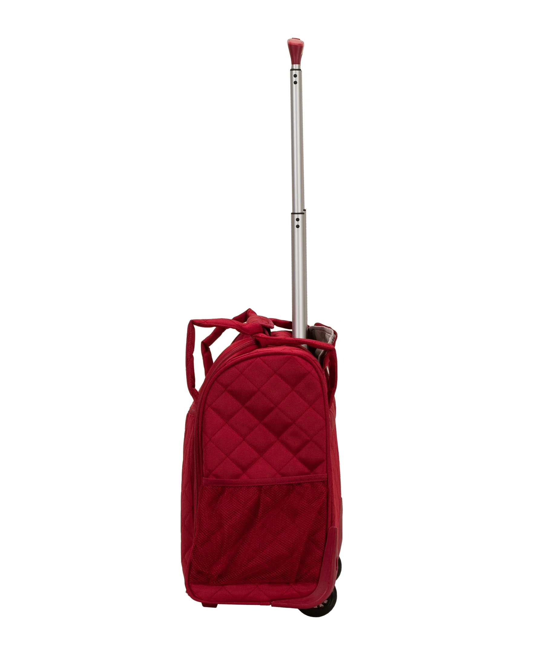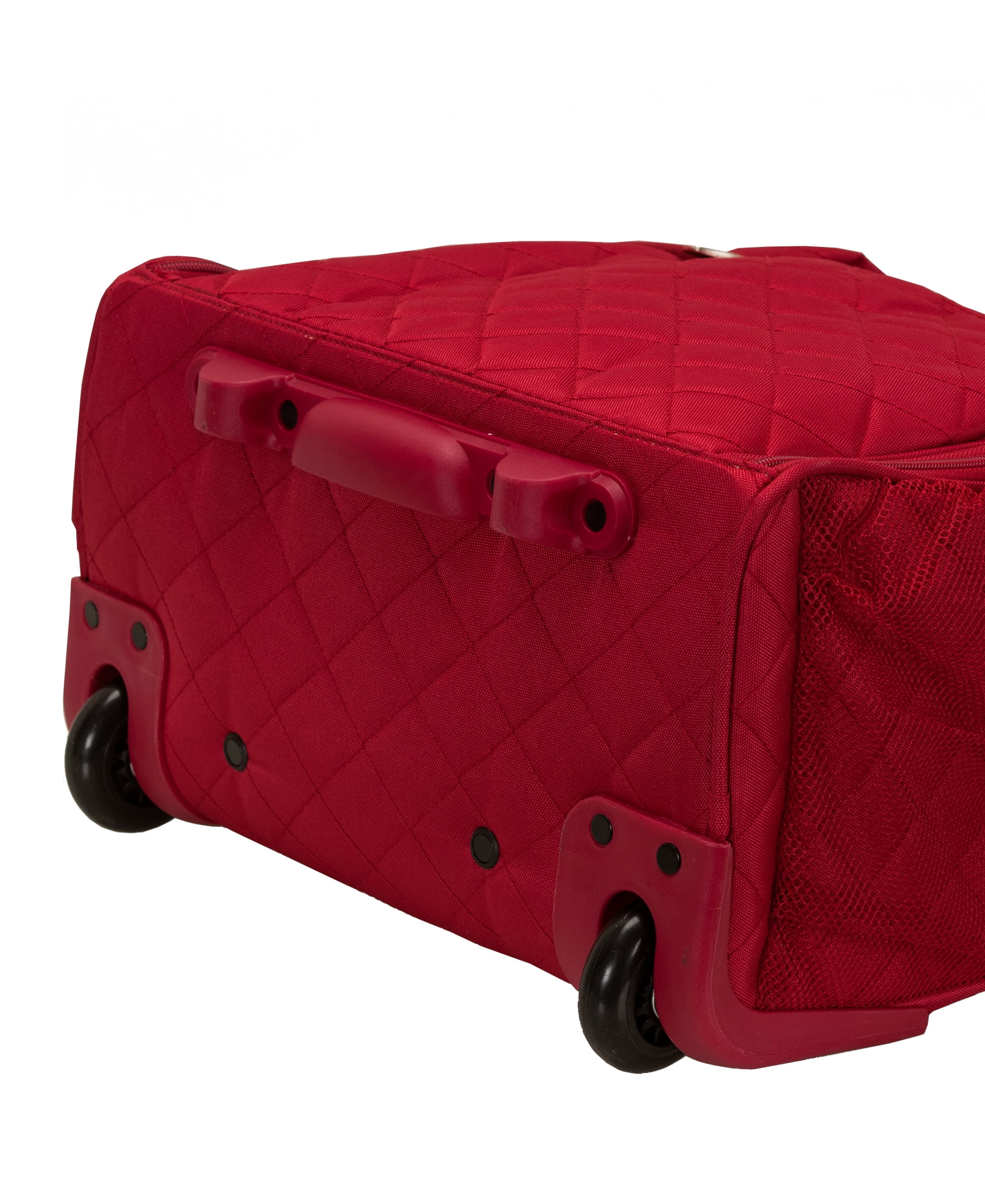 Carry all your essentials in style and comfort with the Rockland Wheeled Underseat Carry on Bag. Quilted polyester fabric exterior features a large main compartment for clothes, shoes and also has 2 slip pockets and two zippered pockets for keeping small essentials handy and organized. Retractable handle stores away while hand held handles allow for quickly grabbing bag from overhead bin or underneath seat. Back side has a strap allowing you to attach it to your wheeled carry on piece. This makes the perfect bag fro overnight trips and the small size fits undernear most airline seats allowing you to carry on your bag even when overhead bins are full. Measures 15″H x 14″w x 9″L (interior dimension 8″x13″x8″).