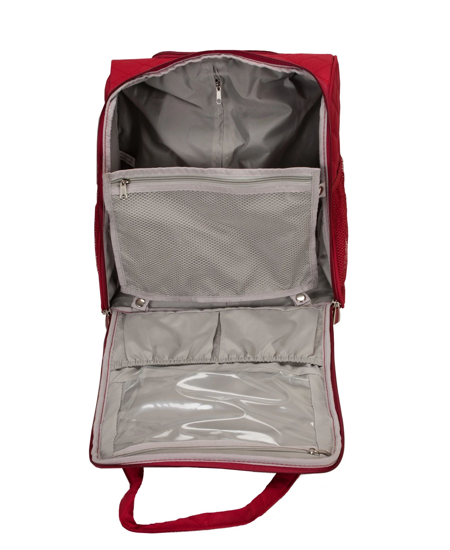 Large Main compartment Fits in most airline overhead compartments and underneath Airplane seat side mesh pockets for waterbottle, papers Slip pockets & zippered clear pocket interior Full lining with retractable handle