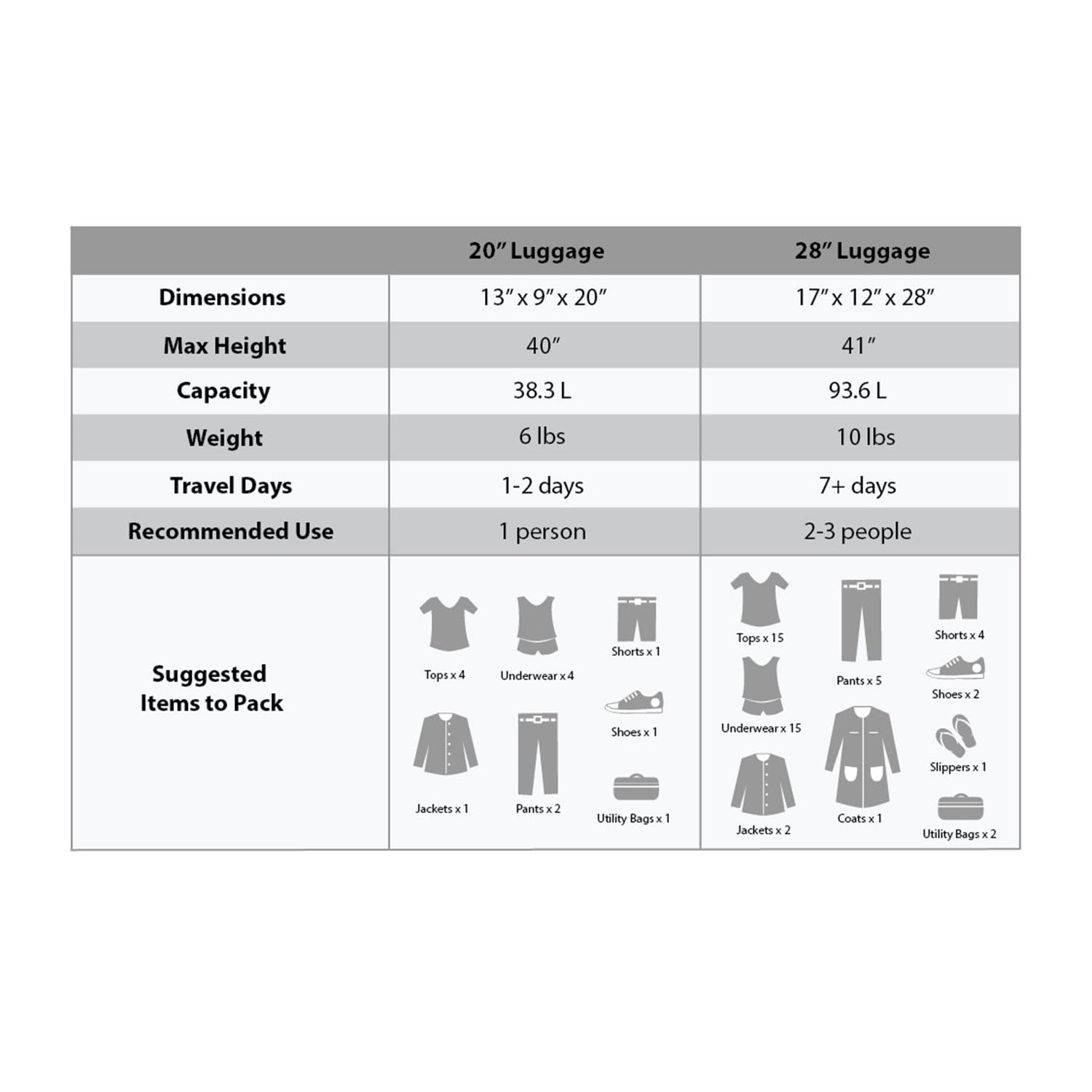 Multi-directional spinner wheels for easy maneuverability Modern internal chrome telescoping handle with push button handle. Interior mesh and zip pocket and elastic pocket Dimensions: 20″X13″x9″ weighs 6 lbs; 28″x17″x12″ weighs 10 lbs