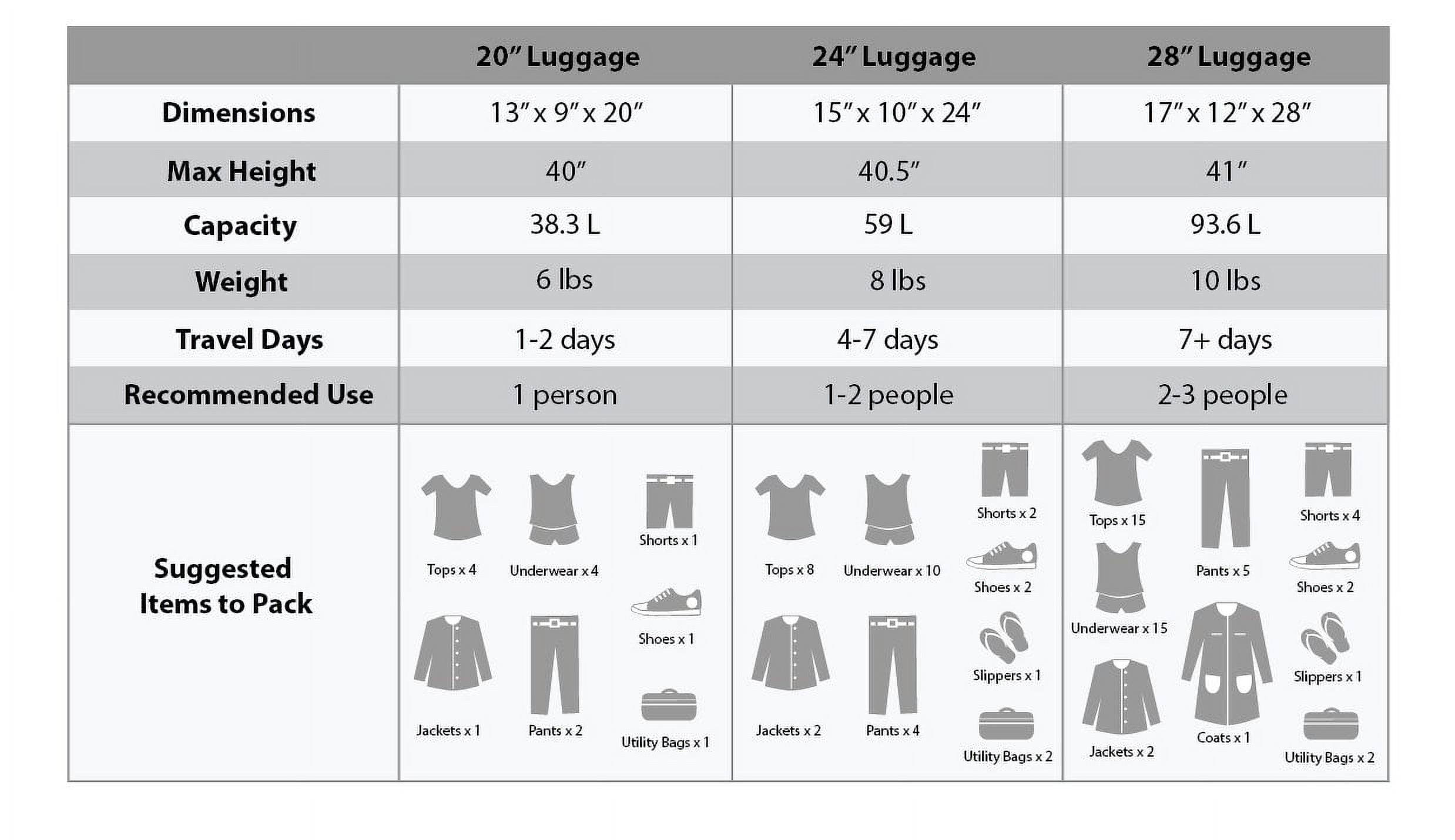 Includes small, medium and large upright luggage bags Light weight Extremely durable Eight multi directional spinner wheels rotate 360 degrees for easy maneuverability Sturdy ergonomic chrome telescoping handle with push button handle Interior mesh zip pocket and elasticated Expandable Warranty: Five years Made in China No assembly required Small: 13 in. L x 9 in. W x 20 in. H (6 lbs.) Medium: 15 in. L x 10 in. W x 24 in. H (8 lbs.) Large: 17 in. L x 12 in. w x 28 in. H (10 lbs.)