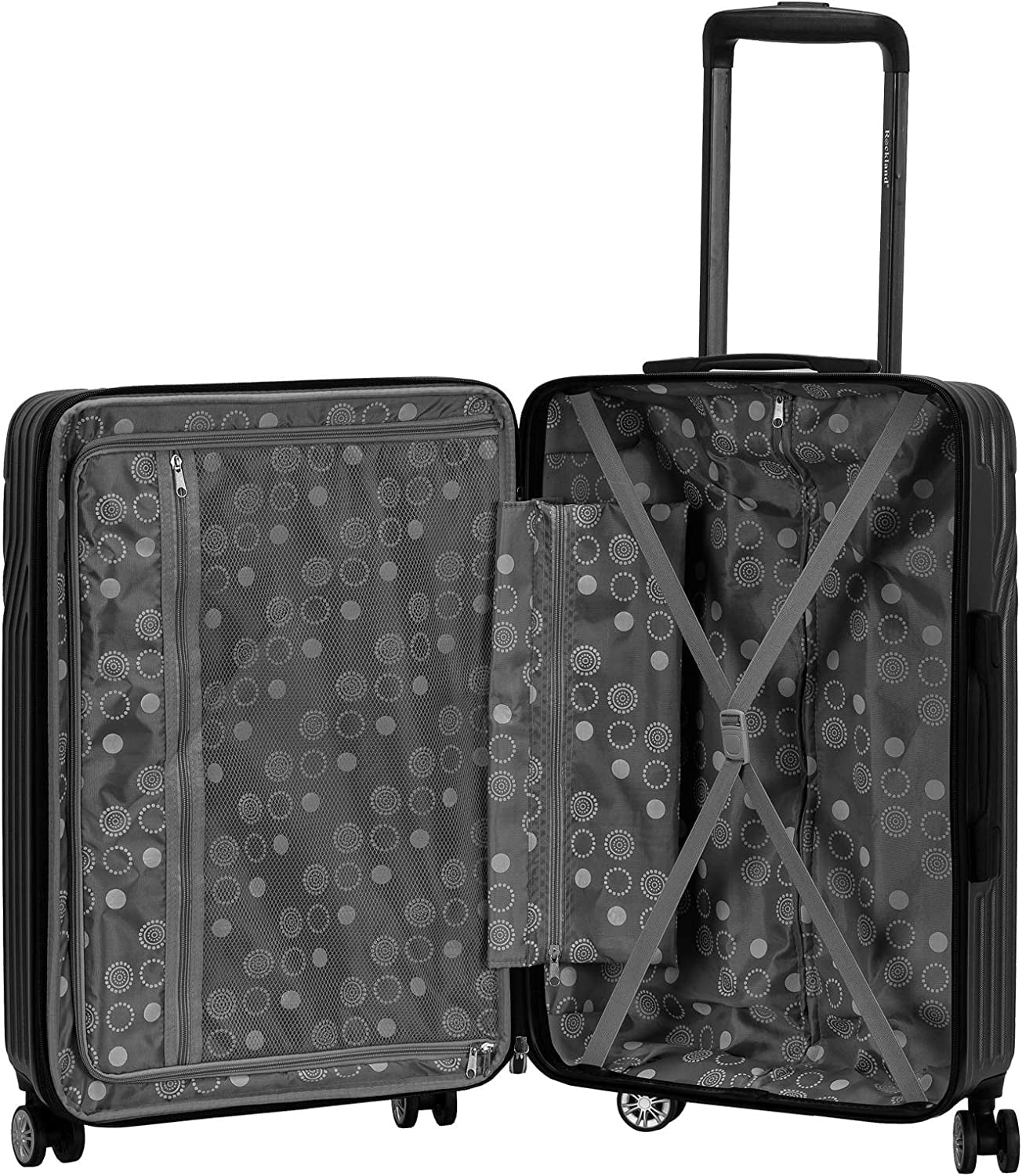 LIGHTWEIGHT YET EXTREMELY DURABLE ABS MATERIAL MULTI-DIRECTIONAL SPIINER WHEELS STURDY ERGONOMIC ALUMINUM TELESCOPING HANDLE INTERIOR MESH ZIP POCKET AND ELASTICATED POCKET NON-EXPANDABLE