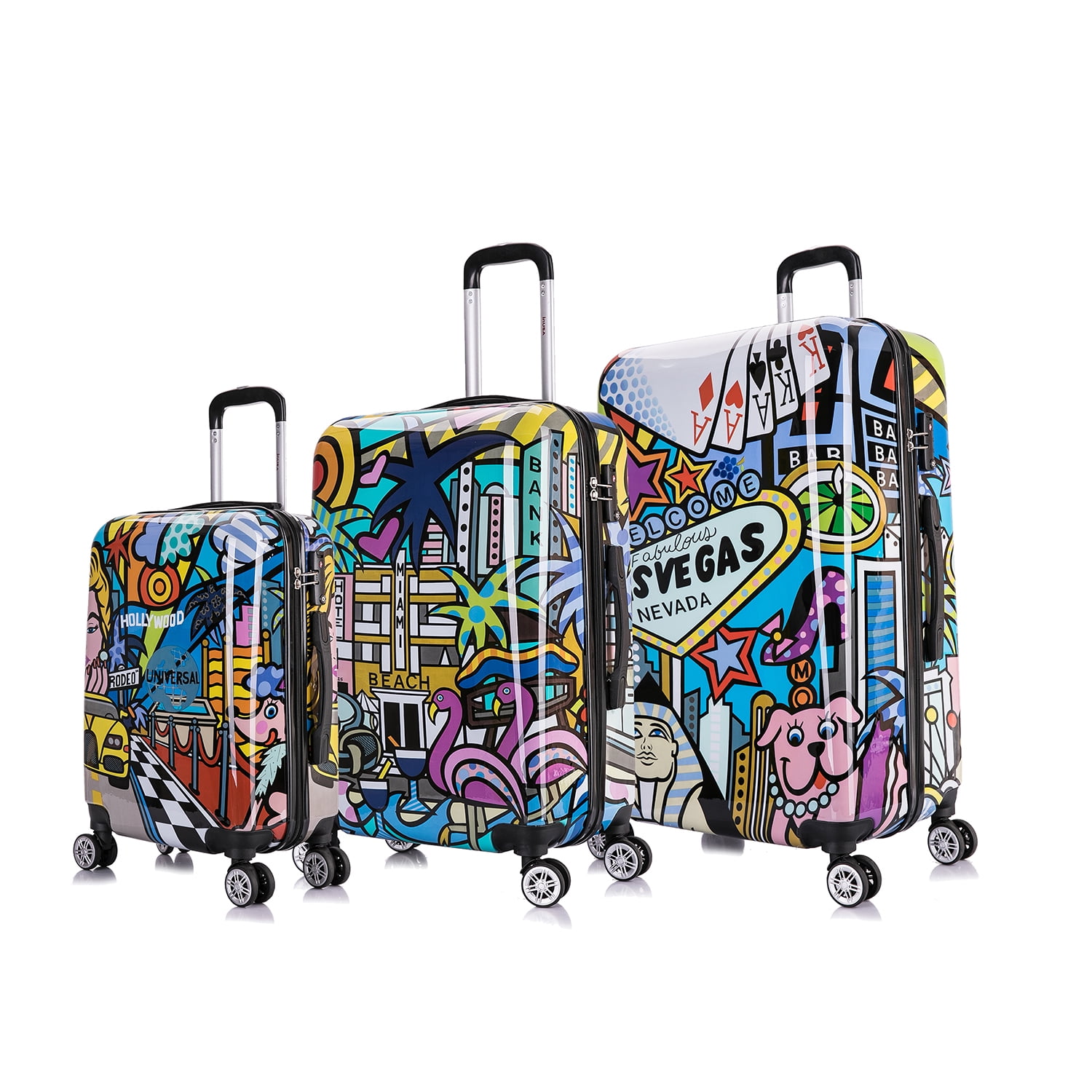 This 3 pc. Set is made of ABS. The major benefits of this material – it is extremely lightweight, it is durable, and protects the contents of your luggage. Eight multi directional spinner wheels rotate 360 degrees for easy maneuverability. This luggage allows you to pack more while avoiding the excess weight surcharges imposed by most airlines. • Expandable • Multi-directional spinner wheels for easy maneuverability • Modern internal chrome telescoping handle with push button handle. • Interior mesh and zip pocket and elastic pocket * 5 year warranty * 20″X13″x9″ weighs 6 lbs, 24″ x15″x10″ weights 8 lbs, 28″x17″x12″ weighs 10 lbs.