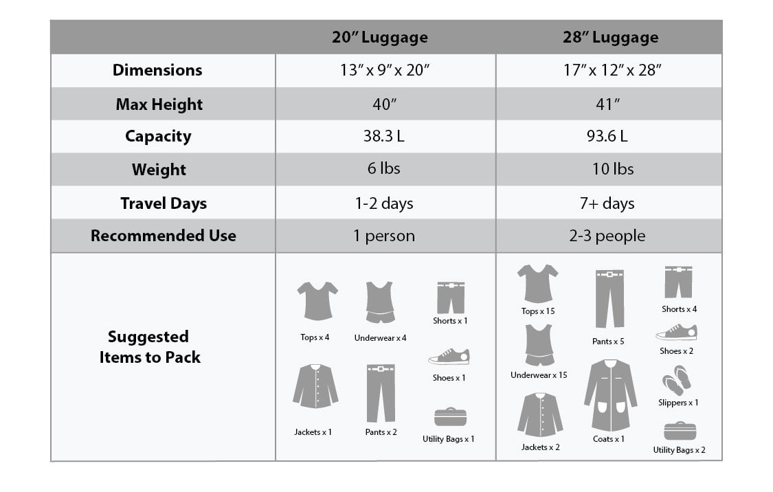 Expandable Multi-directional spinner wheels for easy maneuverability Modern internal chrome telescoping handle with push button handle Interior mesh and zip pocket and elastic pocket Dimensions: 20″X13″x9″ weighs 6 lbs; 28″x17″x12″ weighs 10 lbs