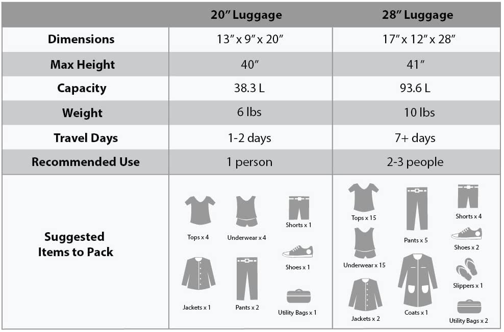 Expandable Multi-directional spinner wheels for easy maneuverability Modern internal chrome telescoping handle with push button handle Interior mesh and zip pocket and elastic pocket Dimensions: 20″X13″x9″ weighs 6 lbs; 28″x17″x12″ weighs 10 lbs