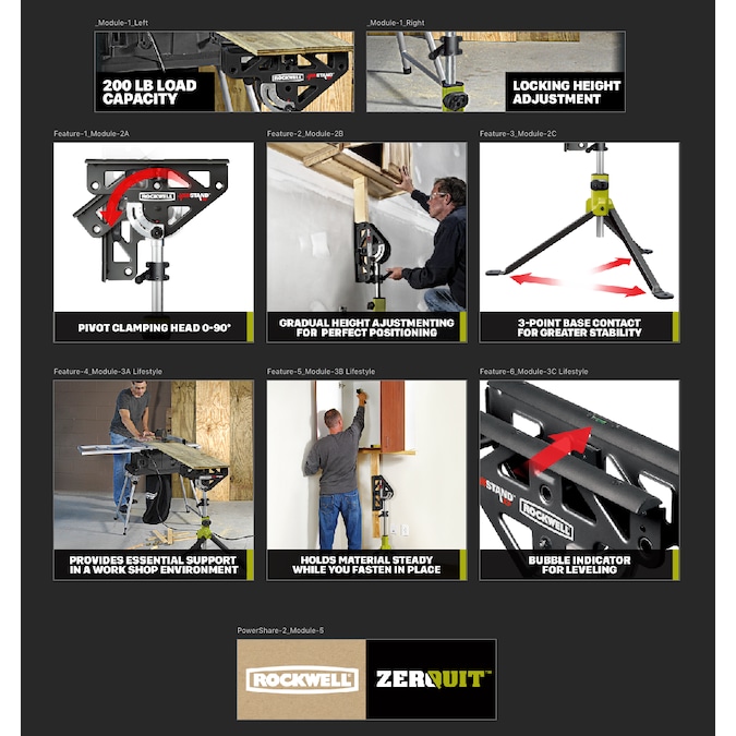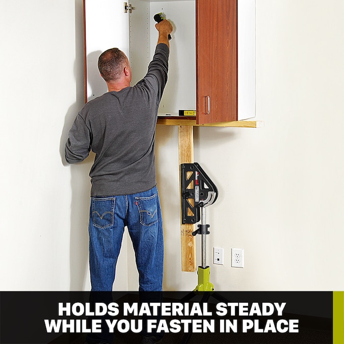 The Rockwell RK9034 jaw stand XP is a versatile, portable work stand designed to save you time and hassle. The XP stands for exact positioning when fine tuning the perfect level or clamping for more security. The tripod set up allows for a level and more sturdy work area. The non-marring feet protect your work and prevent damage to both your project and floor. The RK9034 improves the concept of the traditional roller stand, and adds extra features to create a work support stand. The low-friction slides on the top of the stand allow work to pass over it in a straight path. The head bevels a full 90-degrees. Built into the tilting head is a work clamp, capable of holding material up to 1-3/4 In. wide. The jaw stand is perfect for holding a door in place for hanging, or using a 2 x 4 brace to support crown molding while hanging it.