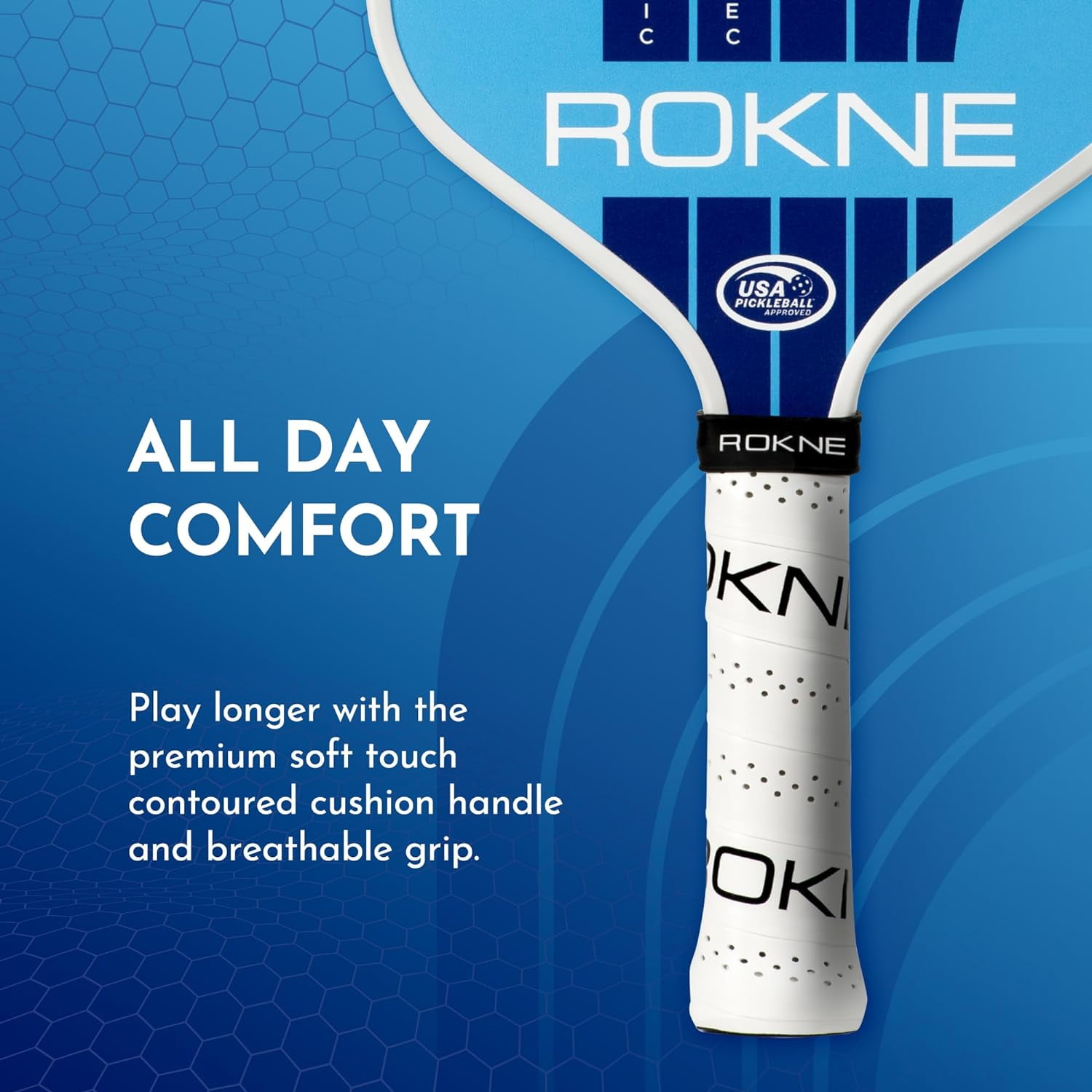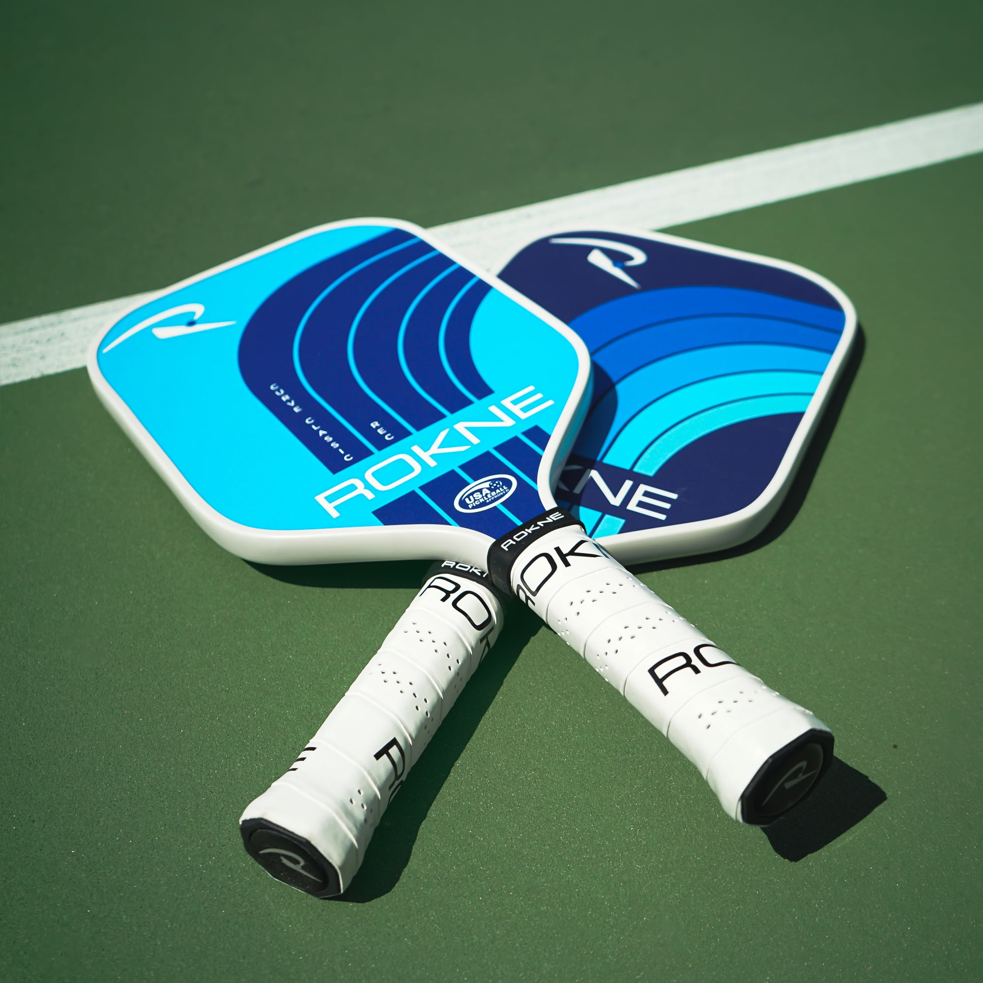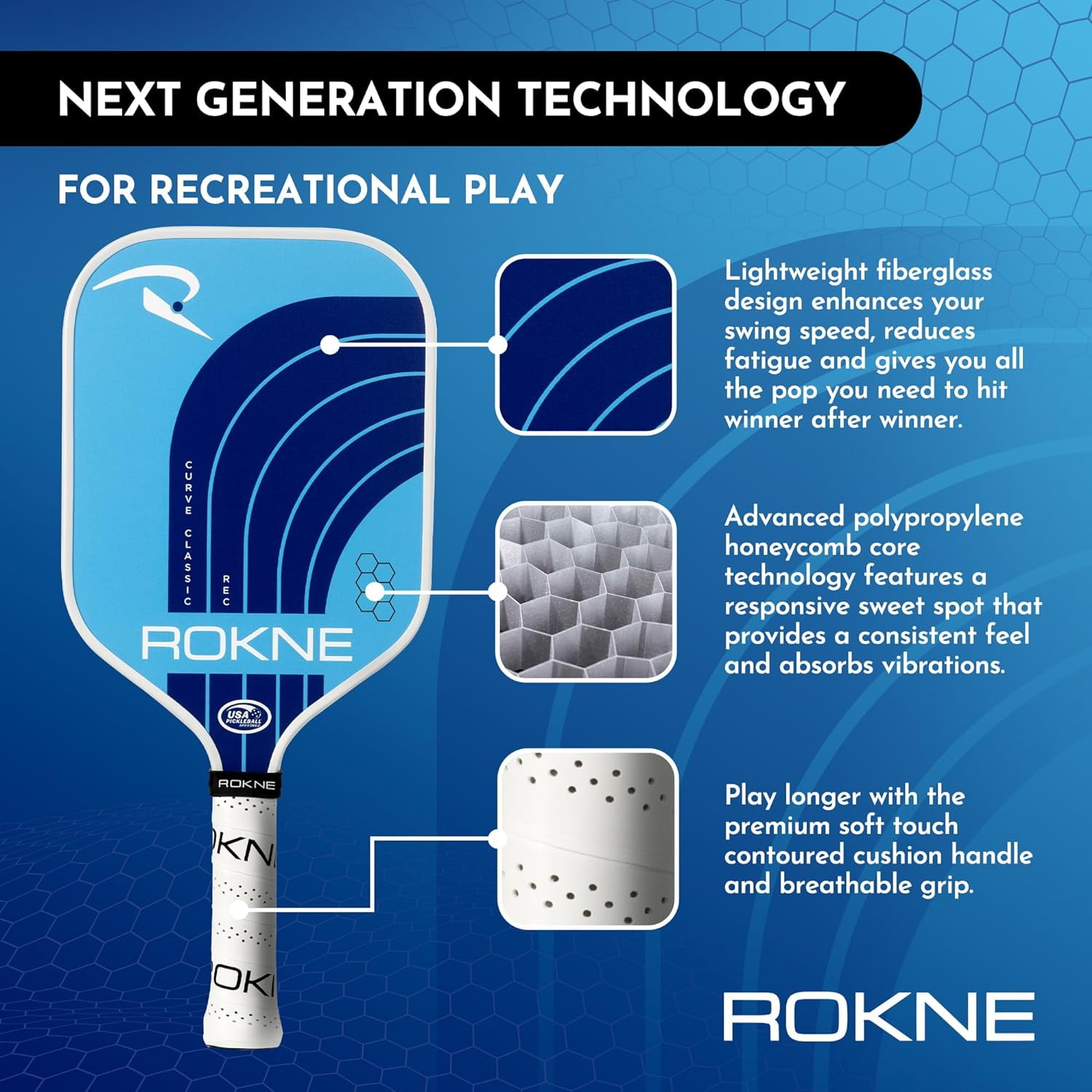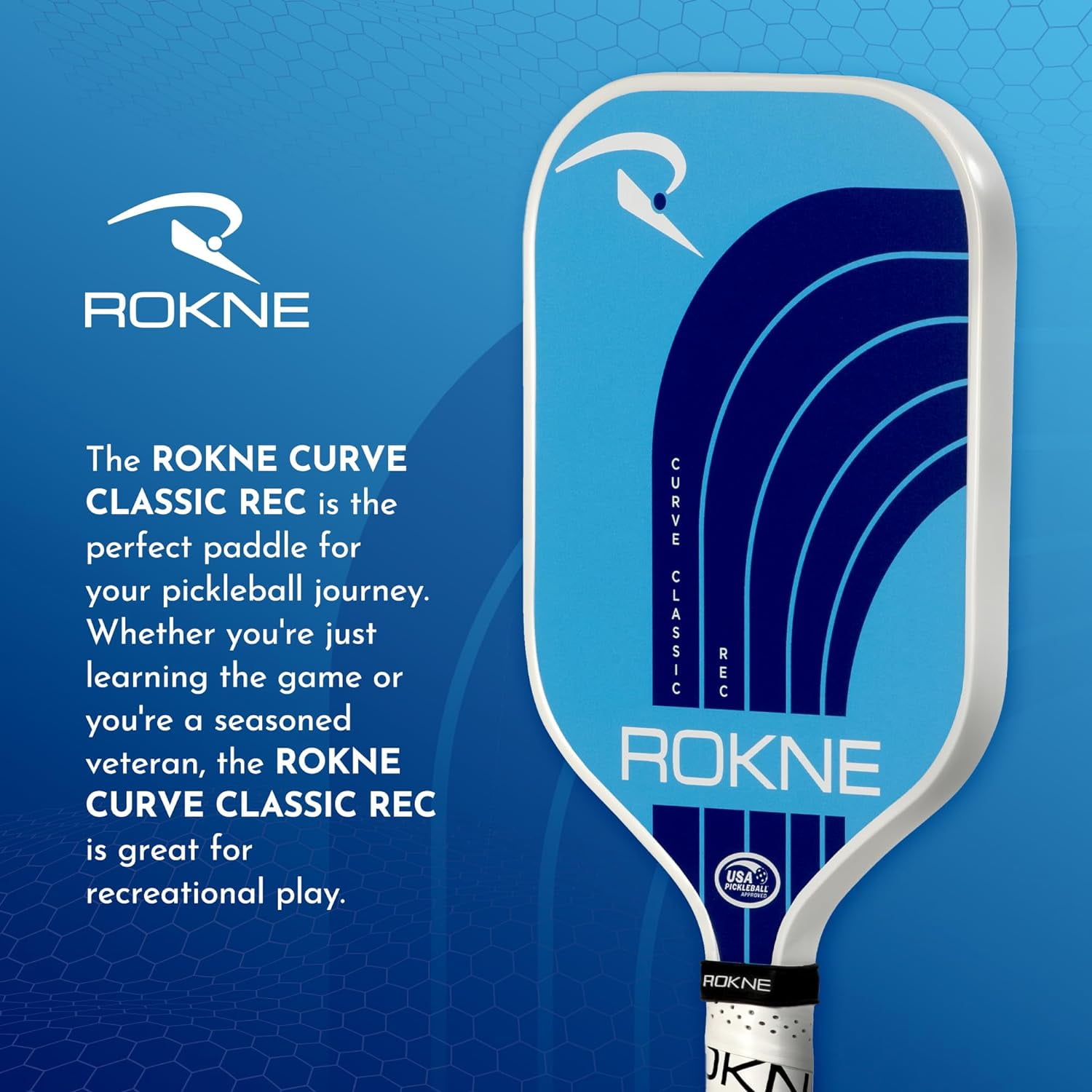 Experience unmatched maneuverability and control on the court with these pickleball paddles! The Curve Classic REC pickle ball paddle is one of the stellar additions to ROKNE’s Curve Classic lineup. This innovative lightweight paddle weighs in at an impressive 7.25 Oz – 7.5 Oz. With a generous width of 7.5”, it generates huge power without sacrificing precision. The advanced polypropylene core of this paddle ball racket ensures that each honeycomb cell has a consistent shape and size to create a large yet stable and responsive sweet spot. The fiberglass face enhances your ability to perform every ace, drive, and lob like a pro. Stand out and serve with the ROKNE Curve Classic REC Fiberglass Pickleball Paddle! The 5.5” handle of this pickleball racket optimizes one and two handed shots. Tennis players transitioning to pickleball will appreciate the extra grip space and handle shape. The medium 4.25″ grip circumference provides room for quick hand changes between volleys and dinks. It also has a soft touch, contoured cushion grip that limits the stress on your hand and elbow so you can play longer with more accurate shots. This paddle’s composition creates a solid and durable feel that rivals some of the best pickle ball rackets on the market. The tough yet balanced and comfortable feel it has makes this paddle suitable for both indoor and outdoor play at any level from beginner to intermediate and advanced. Our pickle ball paddle is USAPA approved for tournament play. The composition of this fiberglass paddle helps eliminate dreaded mishits. Its NanoGroove textured fiberglass surface texture heightens your swing speed, reduces fatigue, and provides the explosive pop necessary for consistently hitting those winning shots. Transform your game with one of the best pickle ball paddles in the court. Order your ROKNE Pickleball Curve Classic REC Pickleball Paddle today!