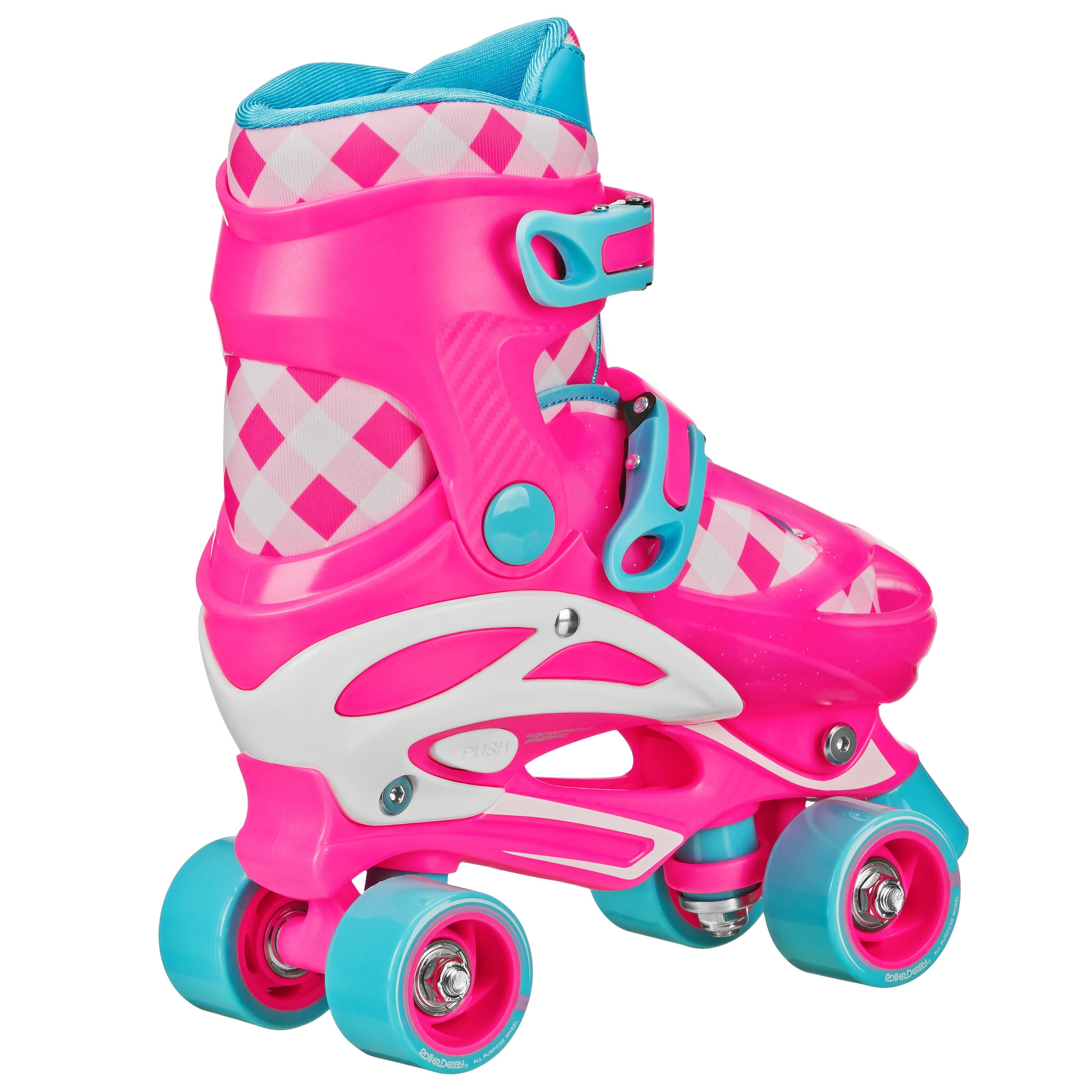 Roller Derby Sprinter Inline/Quad Combination Skates for girls are great for beginners who want the best of both worlds: quad and inline skating! The skates come with interchangeable frames that convert from quad to inline. The boot features adjustable sizing at the push of a button to help keep up with growing kids. Soft, comfortable padding is included in the boot and molded ankles offer lasting support. Quick-latch buckles are easy to use with no laces to tie. Multi-surface polyurethane wheels roll smoothly indoors and outdoors. Silver-5 bearings roll fast and smooth, whether on the street or in the rink. Fits true to children’s U.S. shoe sizes. Small adjusts from size 12-2. Medium adjusts from size 3 to 6. Roller Derby is America’s Skate Company, since 1936.