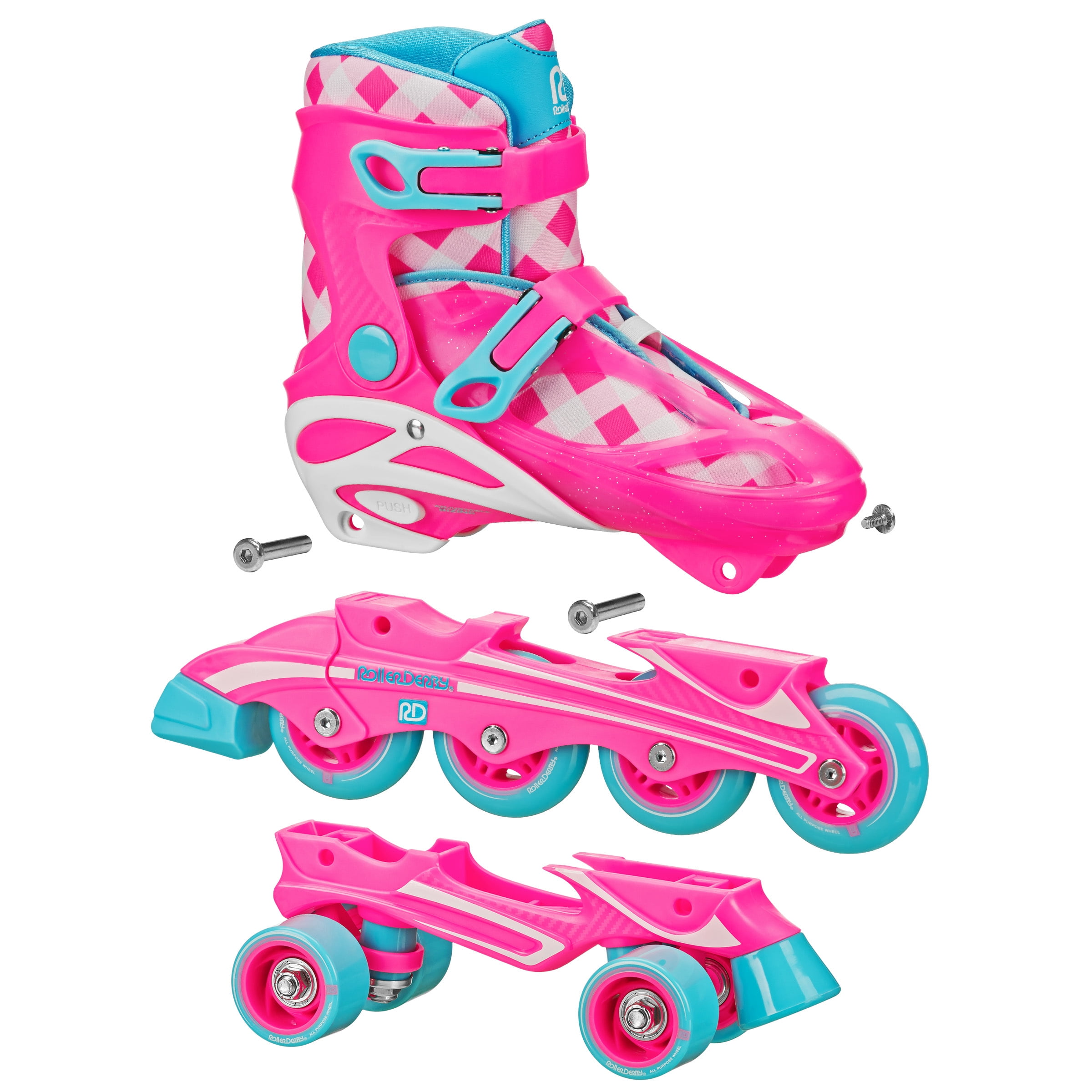 2 SKATES IN 1! Switch between Quads and inline skates for the best of both worlds for boys and girls SMOOTH ROLLING: Roller Derby skates feature grippy indoor/outdoor urethane wheels loaded with fast Silver-5 bearings THE REAL DEAL: Quads have real trucks for control; Inline skates have non-marking brake on right skate GET GOING: Comfy, supportive boots are great for beginners OUTGROW NO MORE! Adjustable sizing for growing feet: Medium fits youth shoe sizes 3 to 6.