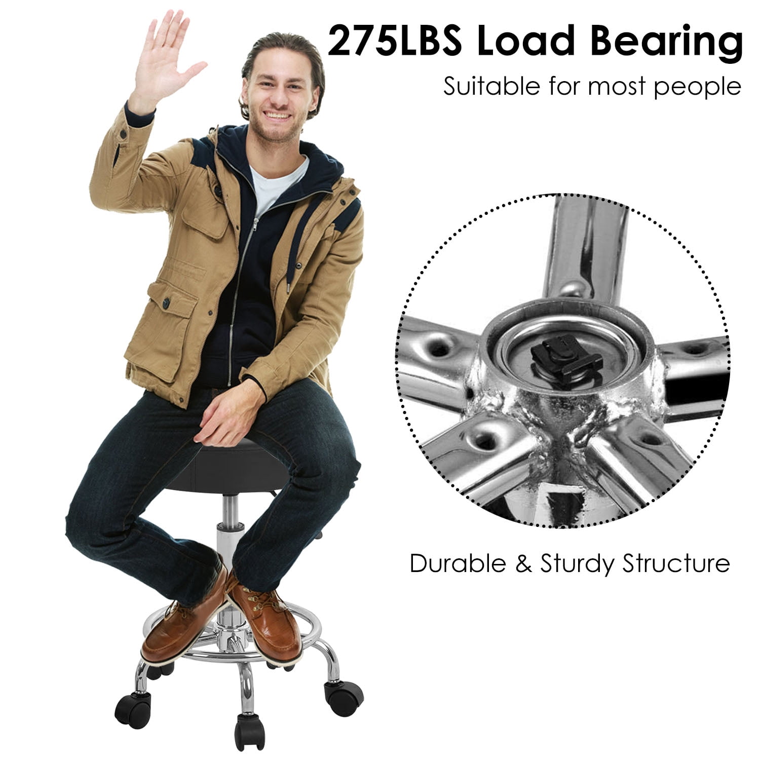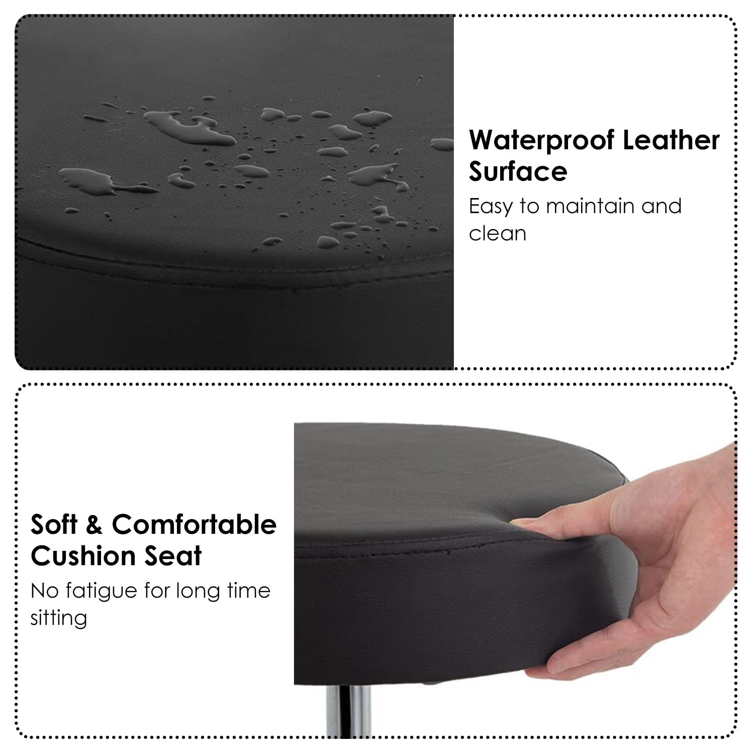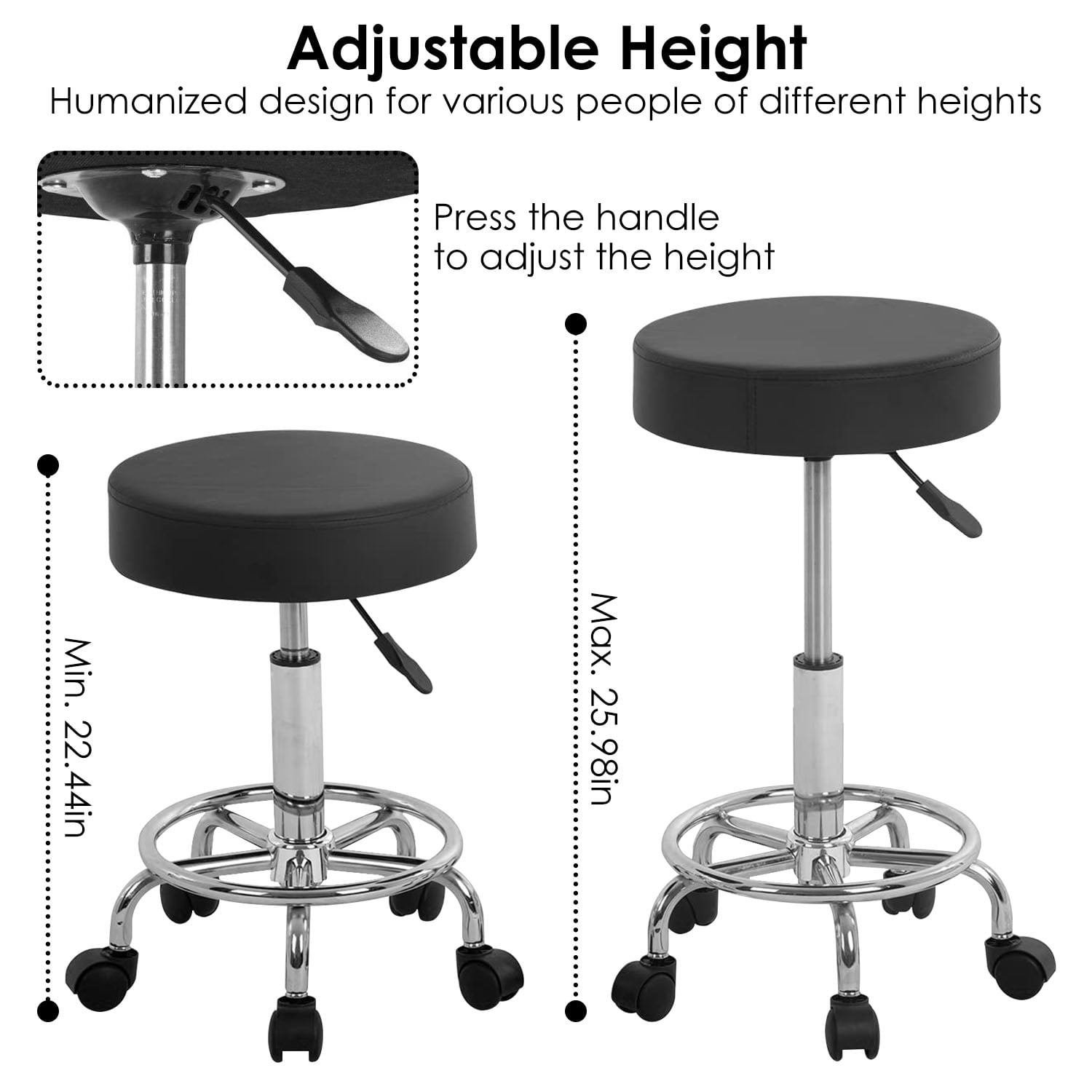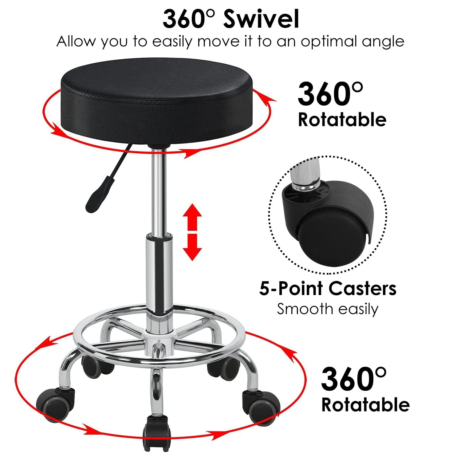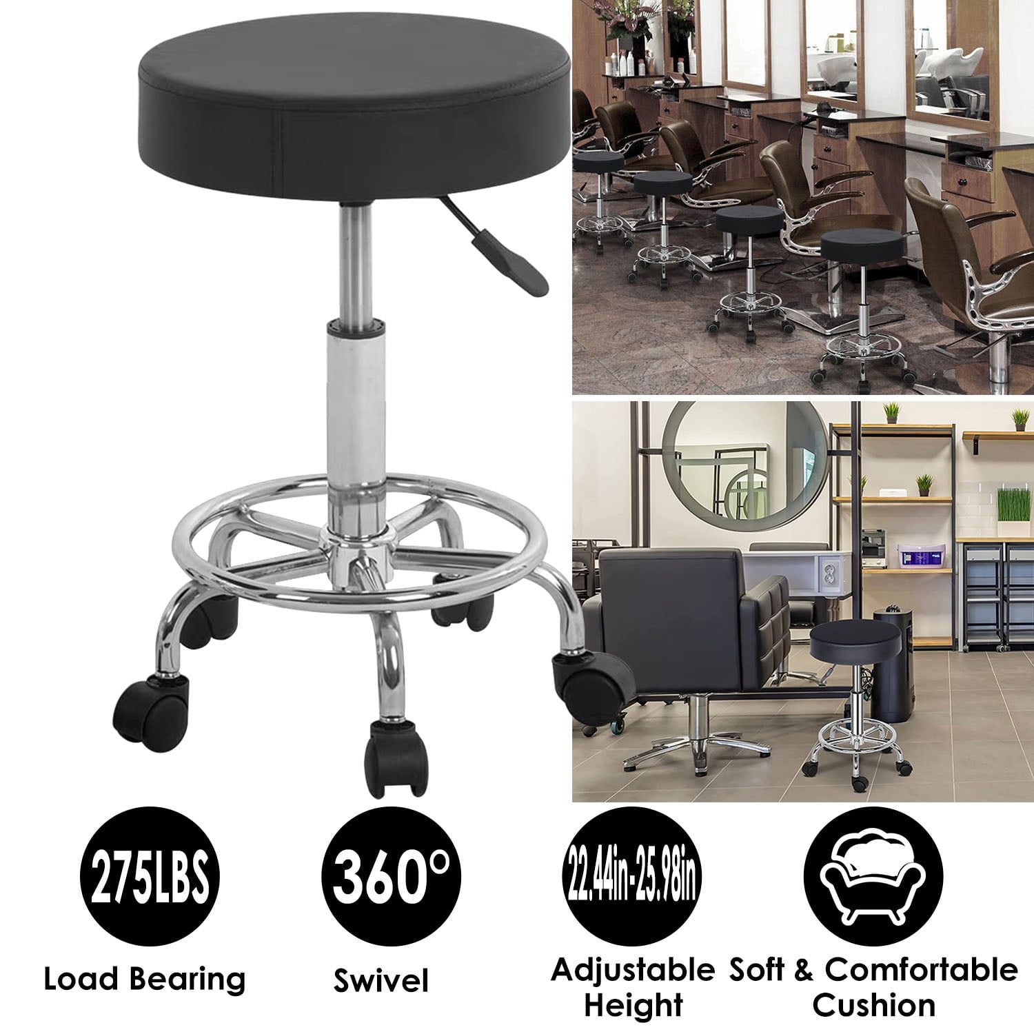 360 Swivel Counter Stool SEAT:360 degrees, the five-point rotating casters provided a convenient movement and additional stability Height Adjustable high stool:adjusts from 22.44 to 25.98 inch,chassis diameter : 13.78 inch Durable & Sturdy Structure: Supported by a durable gas lift and sturdy iron base, the chair can hold up to 275lbs, suitable for most people. FEATURES:The tall stool is perfect for bar bistro coffee house patio home kitchen workshop guitar Easy Assembly in 10 minutes, PU leather cushion is waterproof, oil wear resistant