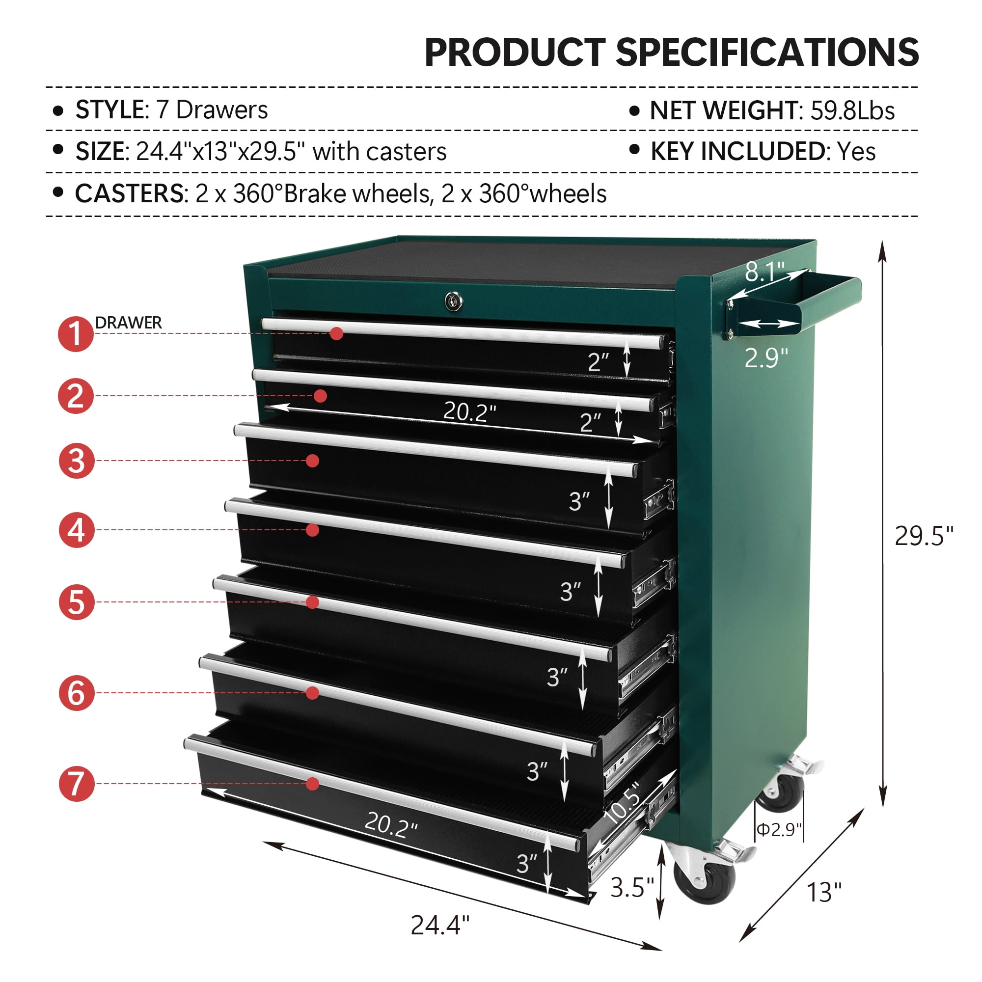 【LARGE STORAGE SPACE】: The tool cabinet has 7 removable drawers, each drawer is 3 inches or 2 inches in height. The top of the tool storage cabinet has a large work surface, which provides more space for you to work and fix various parts. and we provide you with 7 storage boxes. 【PACKAGING】: 7-Drawer Rolling Tool Chest with 7 removable and locking drawers,cushion and stainless steel Countertop, key, pad feet and Brake wheels can be used either for working on garage tool counter tops or for placing items at home, either individually or in combination. 【STRONG AND DURABLE】: The tool box is made of durable steel with high structural strength, the surface is powder coated to enhance abrasion resistance, the countertop of the tool box is not easy to rust, and it can be used for a variety of large-scale work. 【EASY TO MOVE】: The tool chest includes 2 x 360° Brake wheels, 2 x 360° wheels and handles for smooth rolling and easy pushing. When you want to work for a long time on the tool cabinet table top of the work cabinet, you can replace the feet and the structure will be more stable. 【Multi-Functional Tool Cabinet】:Suitable for a variety of scenarios, such as factories, homes, garages, etc., can be used to store and place a variety of tools and parts.