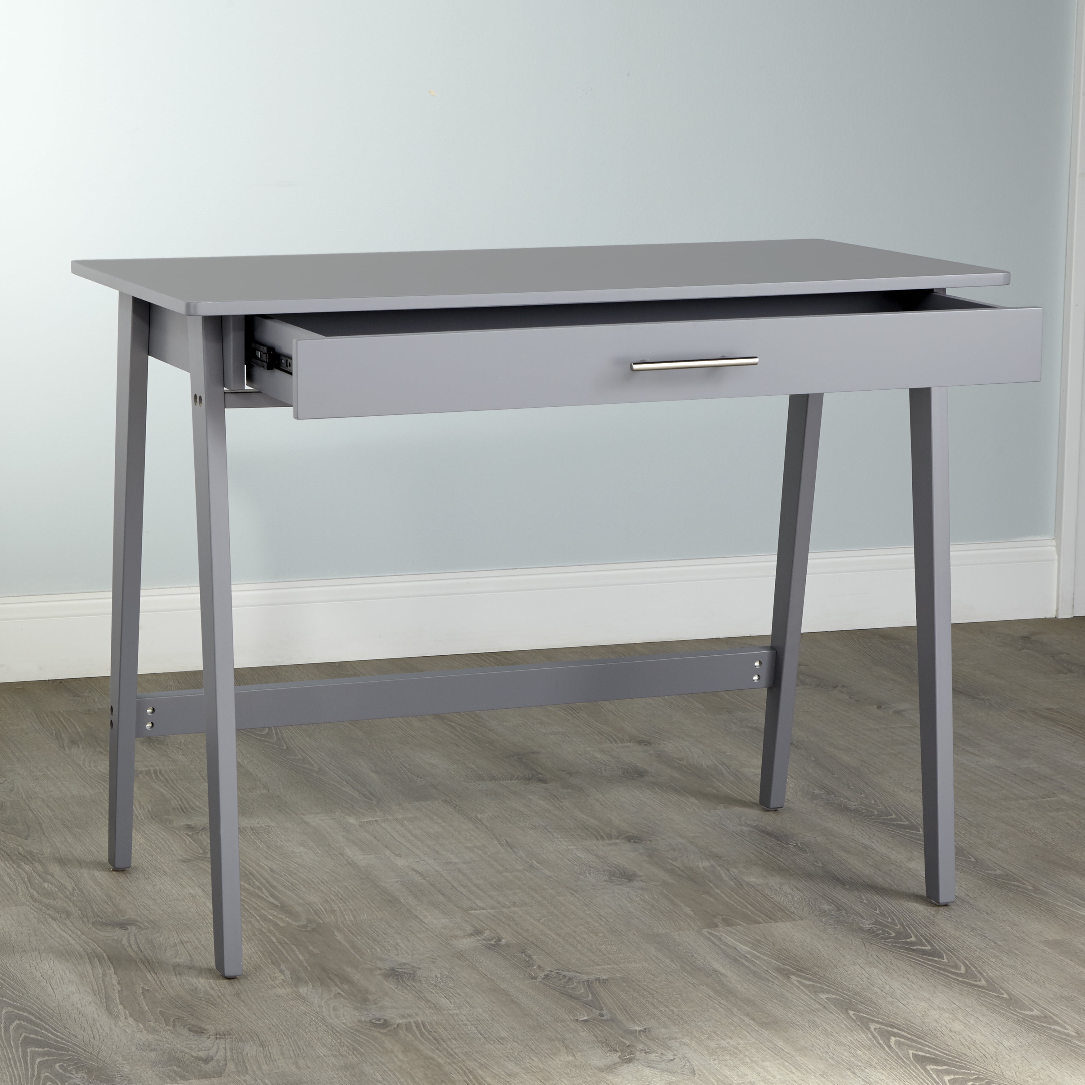 Includes one desk Designed with pinewood with MDF top Available in four finishes ? Black, Blue, Grey or White Ships in one box Assembly required Desk overall dimensions: 30.25 inches high x 40 inches wide x 20 inches deep Inside drawer dimensions: 2.75 inches high x 31.75 inches wide x 9.5 inches deep