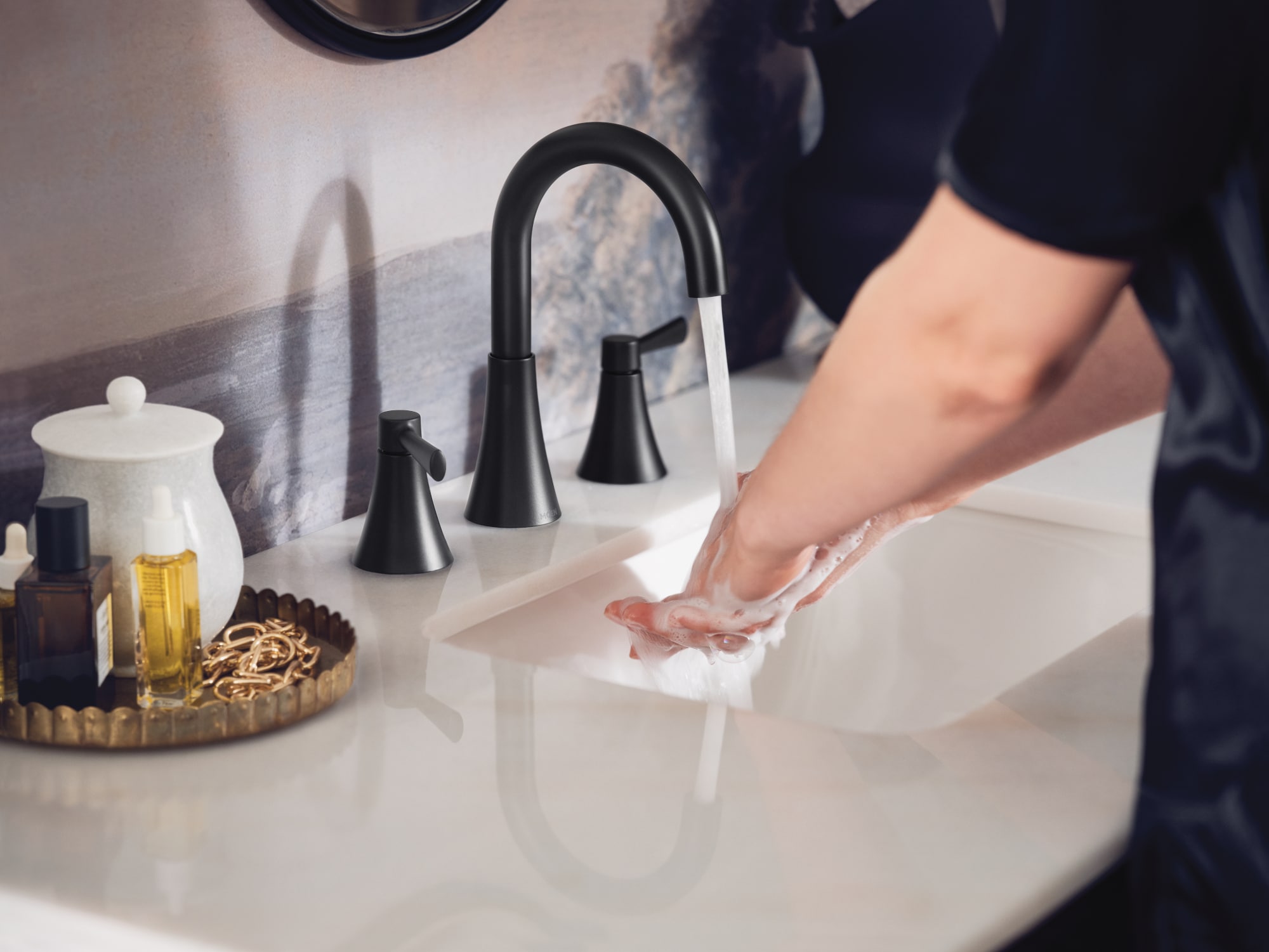 With the high arc of the faucet’s spout and smooth, tapered handles, the Ronan™ collection brings a sleek, transitional look to any bathroom. The 8” widespread bathroom faucet design allows for installation flexibility, and the two lever handles adjust easily for precise water flow and temperature control. Available in Matte Black, a contemporary yet surprisingly neutral black finish.