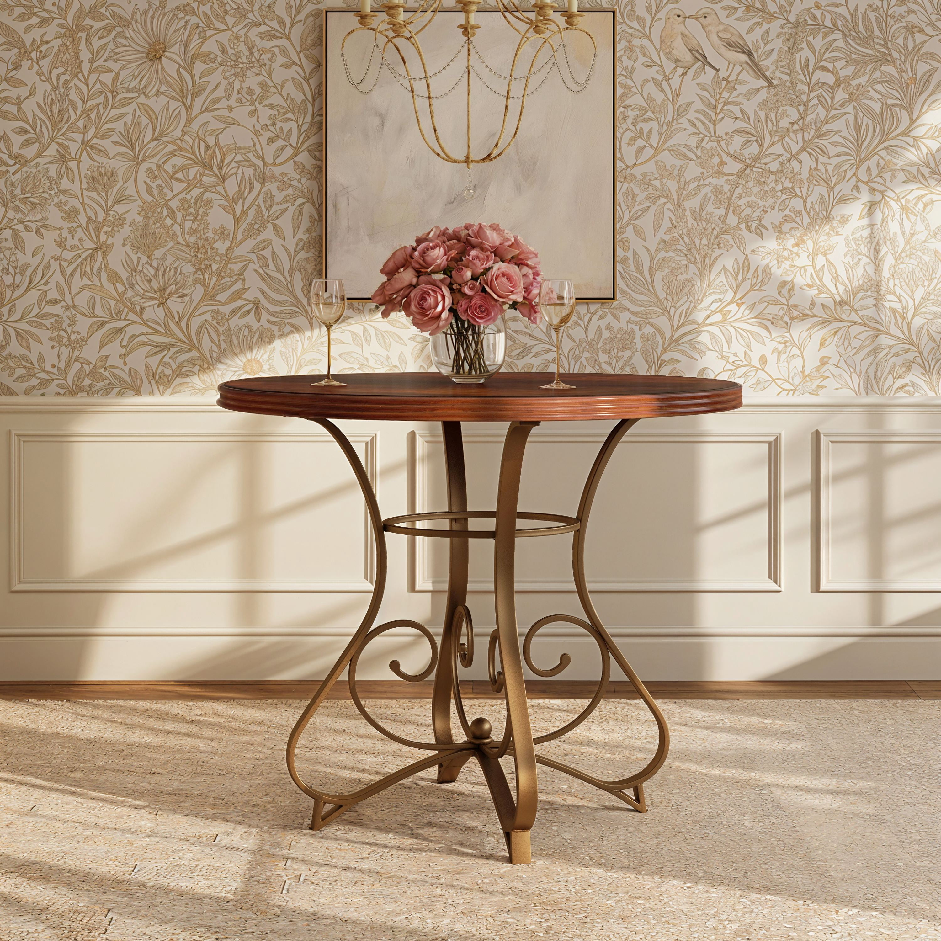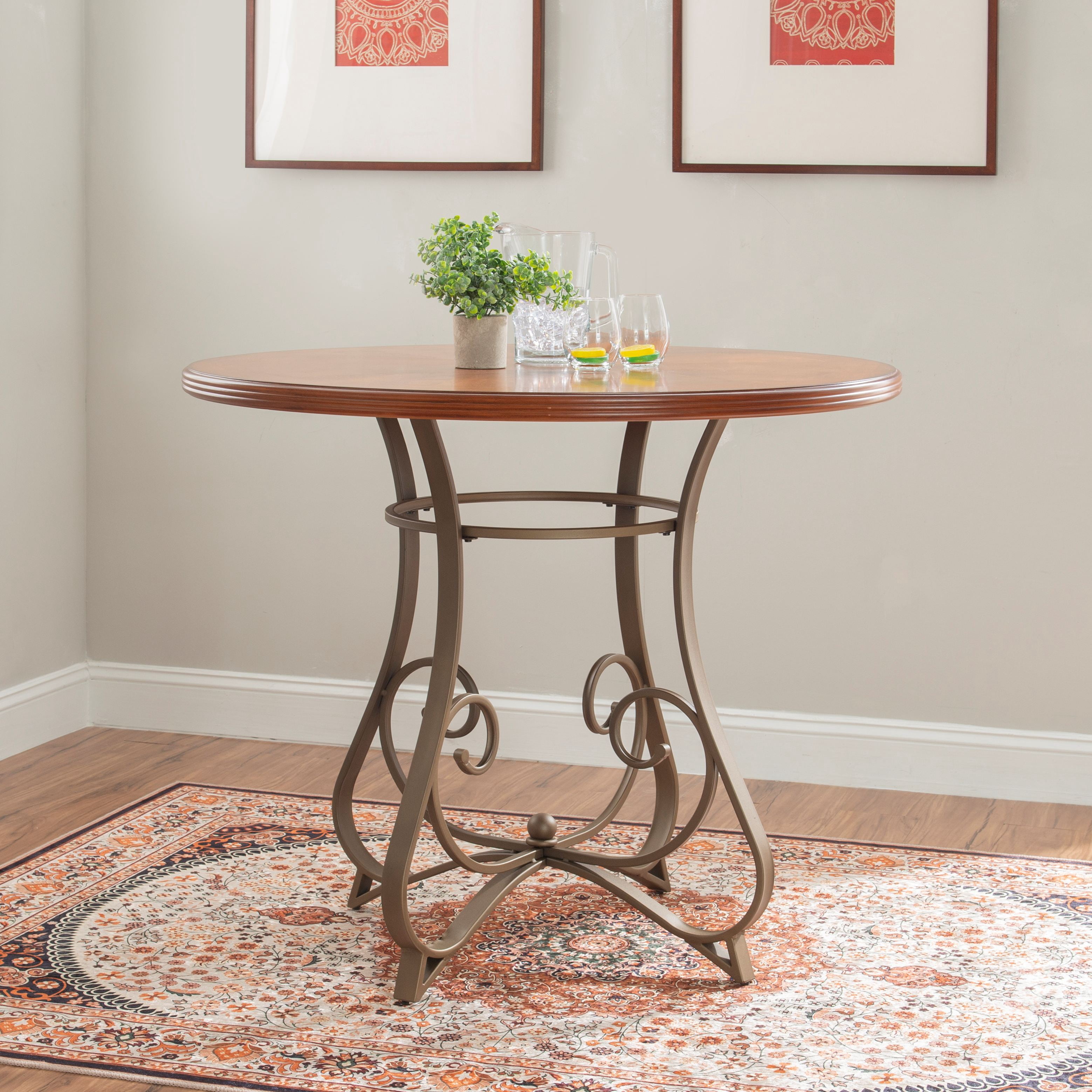 Features an interesting curve and scroll designed bottom. Will complement any décor. Brushed Faux Medium Cherry Wood Top Matte Pewter and Bronze Metal Some assembly required Assembled Dimensions: 41.88″ W x 41.88″ D x 35″ H Weight Capacity: 300 lbs for Top Ships in 2 boxes