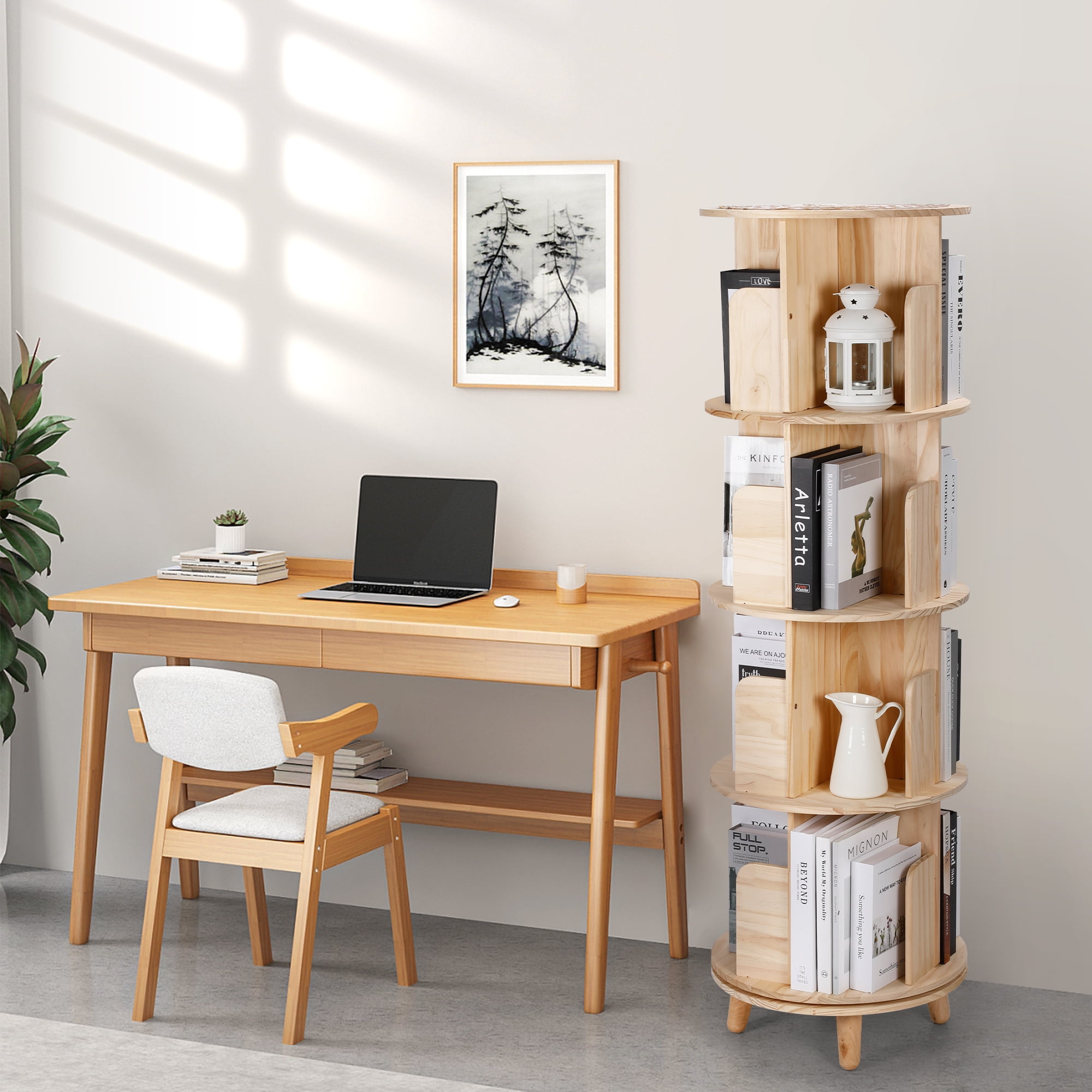 【360° Rotating Bookcase】 The round bookshelf with 360-degree rotation fits into the corner of any space with a compact floor area. It is the ideal space-saving bookshelf for easy organizing and accessing books. 【Solid Wood Bookshelf】 This spinning bookcase is made of solid pine wood which is free of formaldehyde, non-toxic, odorless and paint-free. You can also paint the bookshelf as you like. 【Well-Constructed Bookcase】 This spinning bookshelf is connected by eccentric wheels to strengthen the stability of the board connection. The bottom structure is made of an enlarged base so that the product will not tilt or swing easily. 【4-Tier Bookshelf Tower】 The spinning bookshelf tower consists of 4 tiers with 4 compartments on each tier, which can store over 120 books, documents, decorative items and so on. 【Modern Swivel Bookcase】 The spine bookshelf is practical and adds an elegant touch to your room. Perfect for living rooms, bedrooms, study rooms, and offices. This rotating bookcase is the perfect combination of fashion and function.