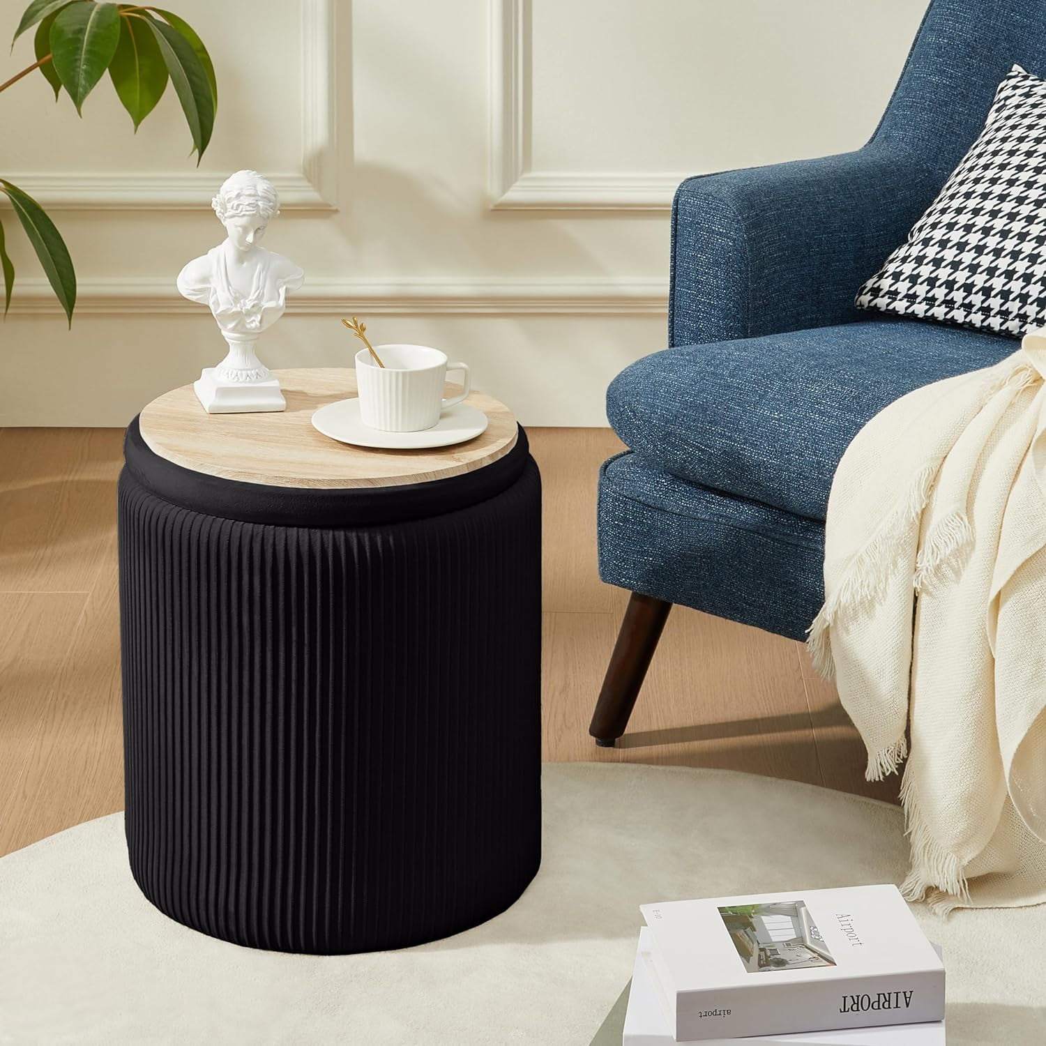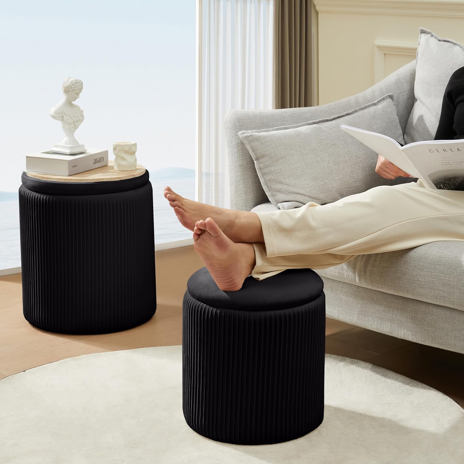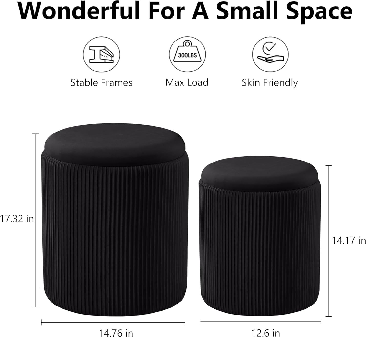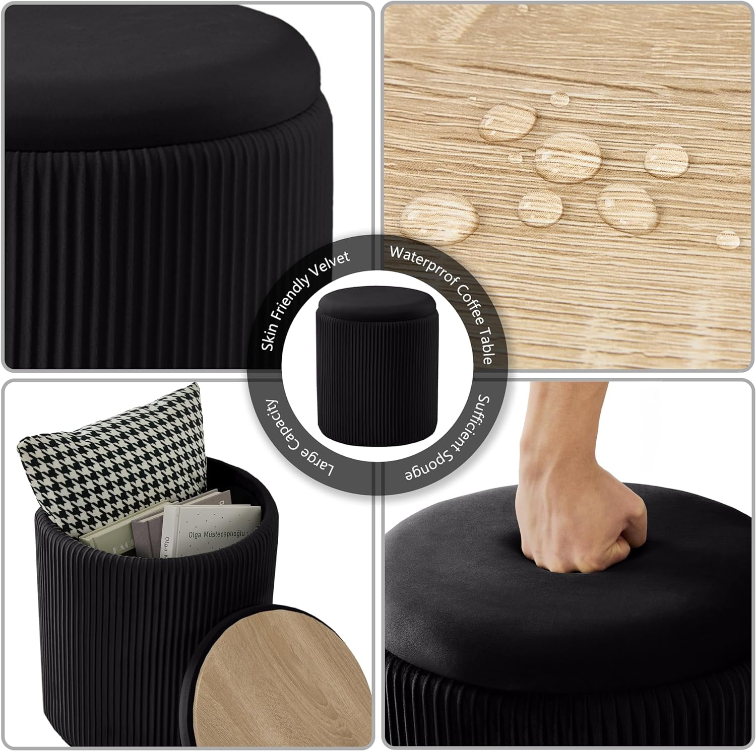 【Multifunctional Design】The design of this vanity stool makes it ideal for different scenarios.You can use it as an Ottoman or a vanity stool. The upholstered lid on the vanity stool is removable and can be turned upside down for use as a coffee table which is waterproof. 【Unique craftsmanship】The Dutch velvet of the vanity stool is dense and soft, and handcrafted lines on the sides of this round ottoman give it an exquisite look that makes your room more beautiful and unique. 【Comfortable experience】The upholstered seat of this round ottoman with storage is made of high density sponge, which feels skin-friendly to the touch and is easy to clean even with animal fur. 【Great hidden storage】This vanity stool is so stable that it can hold up to 300 pounds. Inside the stool is also designed a small round ottoman, both can be used to store clothes, books and others. 2-in-3 design saves space and helps you create a clean enonment.宴Ẑ 【Multiple selection】This round ottoman with storage requires no assembly. We offer six different colors for you to choose, each one is a good choice. If you have any questions during the purchase process, please contact us and we will be happy to solve your confusion.