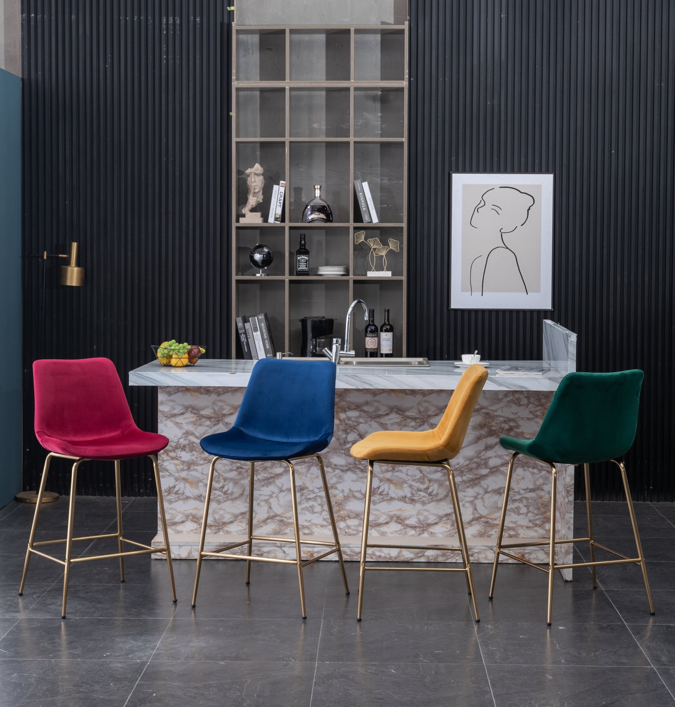 This Aufurr counter height stool features a modern dazzling design that offers both comfort and style. Complemented with precise angles and a minimalistic structure, this stool brings a sleek touch to any decor. Available in four color options. The metal frame features a gold plating finish and streamlined silhouettes augmented by stretcher bars that double as footrests for extra stability and durability. The seat and backrest are delicately upholstered in soft velvet, which provides an unique look and soft-touch experience. In addition, the high-density foam padded seat provides optimum comfort. Dimensions: 19.50”W x 22.25”D x 39.25”H. Seat: 26.50”H x 19.50”W x 15.75”D. Seat Back: 18.13”W x 14.50”H. Seat to Footrest: 15.50 inch, Floor to Footrest: 8.50 inch Some assembly required, all parts and instructions included. The photo may be slightly different from the actual item in terms of color due to the monitor’s display.
