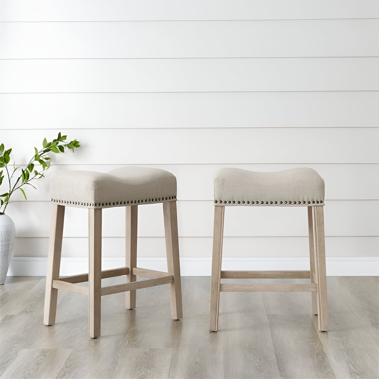 Ideal for lower counters, the Roundhill Furniture 25.5″ CoCo Counter Height Upholstered Stool, Tan, Set of 2 combines the comfort of a saddle seat with the contemporary look of nailhead trim design. The space-saving design fits neatly under counters and stands ready to provide extra seating when you need it. The legs are crafted from solid rubberwood for long-lasting. The neutral color pallet will blend into your decor easily. Getting the perfect match to your existing decor is a cinch, thanks to the array of available fabrics to choose from..