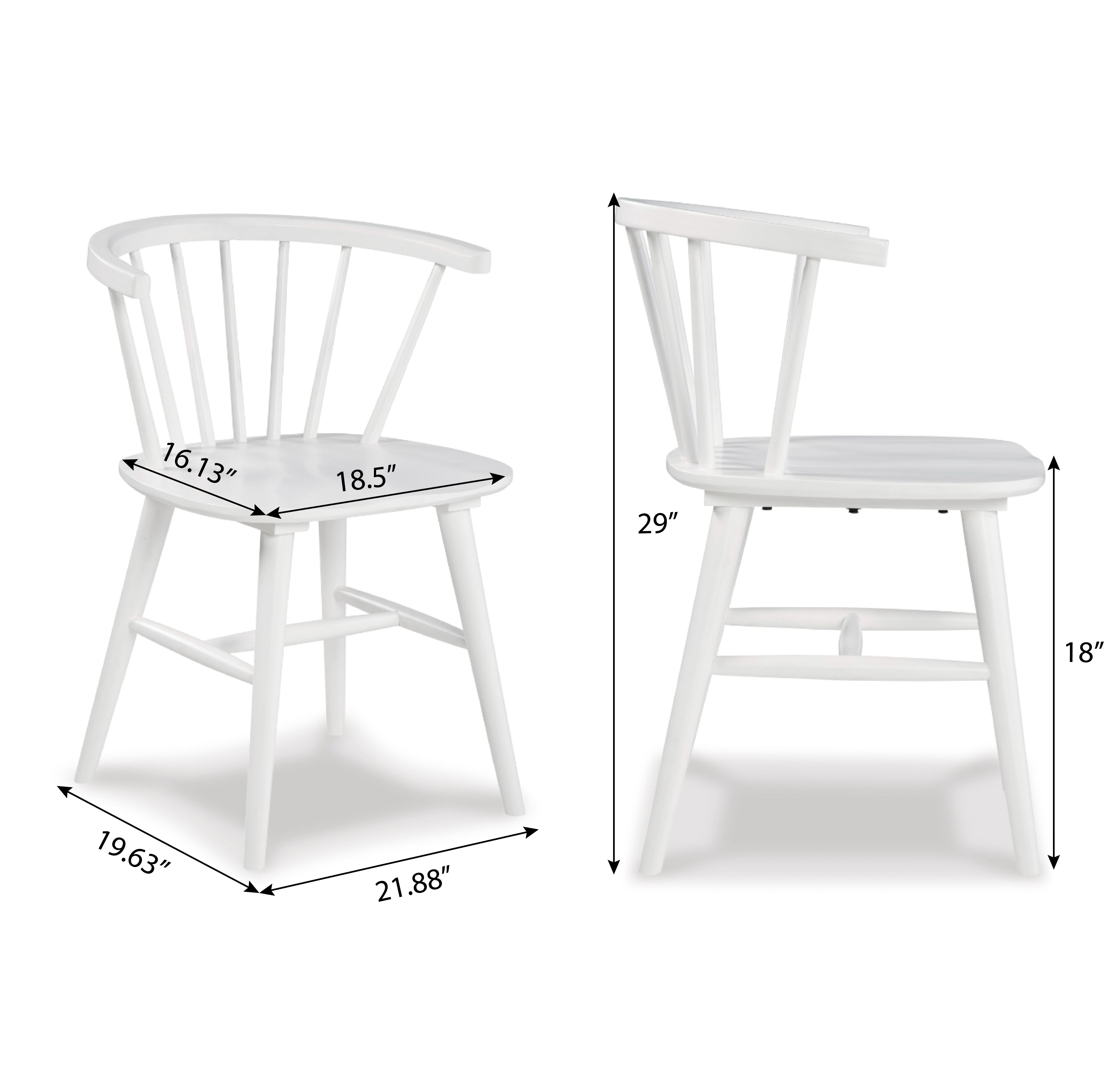 With its sleek clean lines and captivating bright white finish, this chair effortlessly adds a sense of freshness and modernity to any space. Embrace the perfect blend of elegance and sophistication with our extraordinary dining chair. These dining chairs are crafted with solid wood, showcasing durability and quality. The addition of a sturdy “H” stretcher further enhances their stability and strength. These dining chairs showcase a stylish low spindle back design paired with beautifully turned legs. The combination of these features adds a touch of elegance and sophistication to the overall aesthetic. Dimensions: Chairs: 21.88W x 19.63D x 29H. Seat Dimensions: 18.50W x 16.13D x 18H. Some assembly is required. All parts and instructions are included. Kindly be aware that the color of the actual item may slightly differ from the photo due to variations in monitor display.