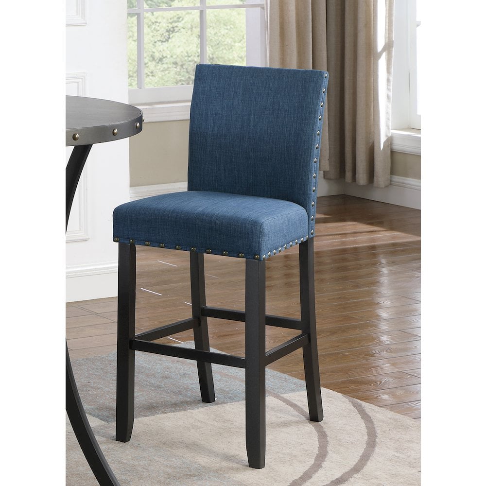 Set of 2 enticing nail head trim bar stools, blue linen and cotton fabric upholstery on the seat and chair back Sturdy hardwood frame with solid legs Dark espresso finish Dimensions: 16″W x 23″D x 44″H; Seat Height: 30″H Some assembly required. Photo may be slightly different from the actual item in terms of color due to the monitor’s display