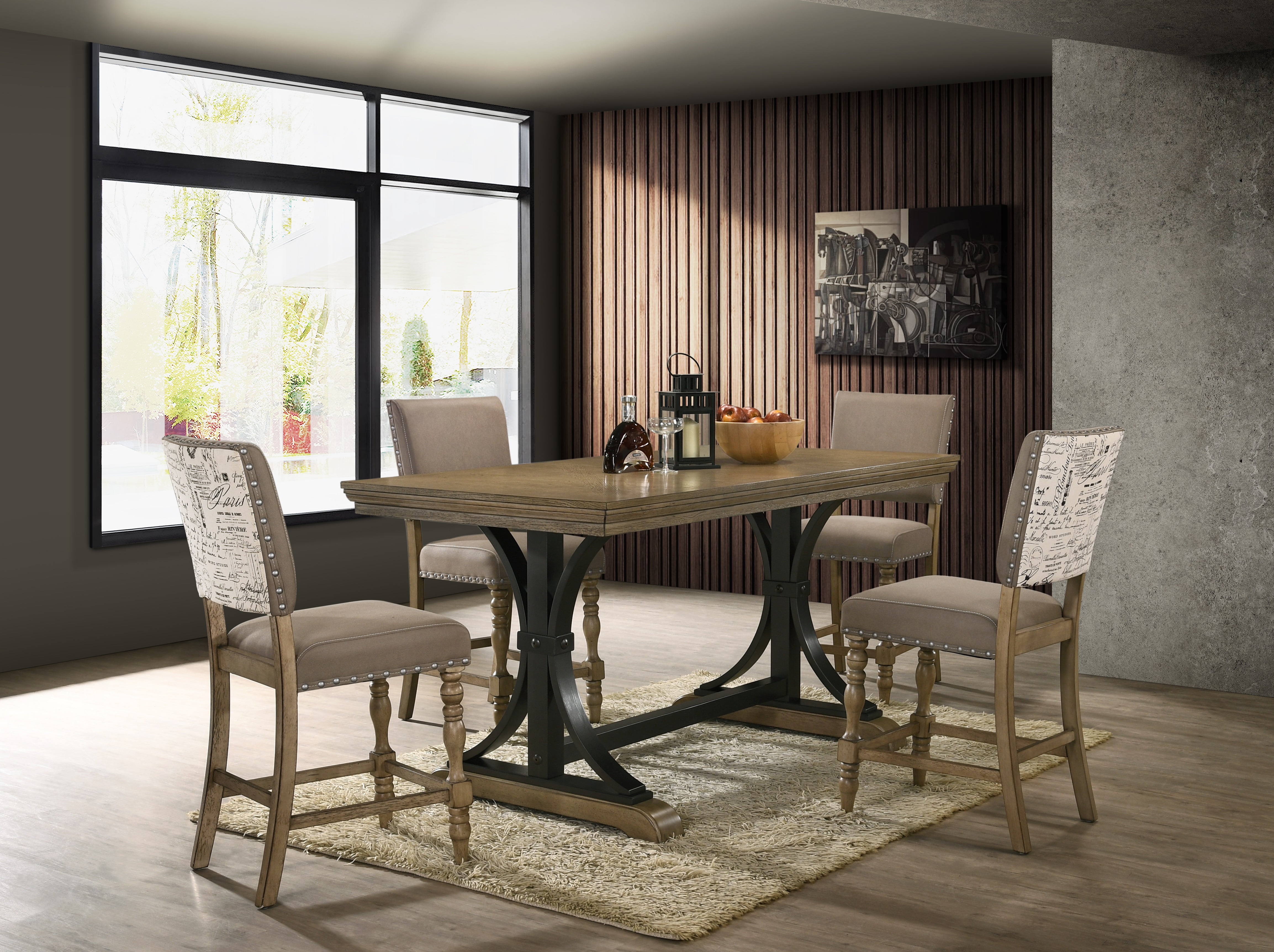 This counter-height rectangular table comfortably seats up to six people. The driftwood finish and the panel design on the top offer a warm and rich contrast to soften the lines Sturdy trestle metal legs with footrest perfectly accented this piece. The rubbed edges of this table add dimension to the design Tabletop is crafted from solid rubberwood with oak veneers, the table base is crafted from metal, solid wood, and MDF Dimensions: 72″W x 36″D x 36″H. Leg Height: 34.4″. The width of the bottom of the leg” is 33.7″ Some assembly is required, and all parts and instructions are included. The photo may be slightly different from the actual item in terms of color due to the monitor’s display