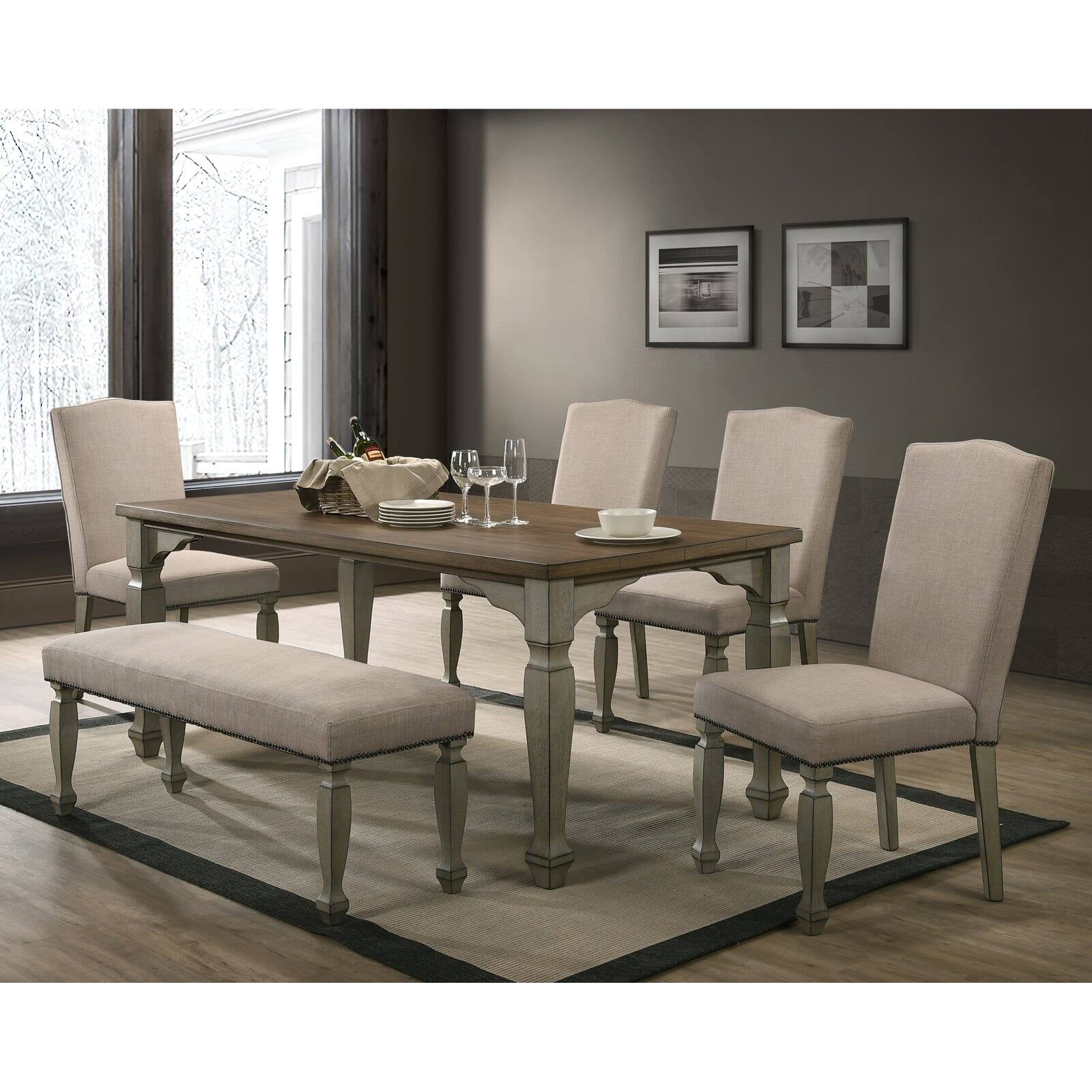 Dimensions: 72L x 36W x 30.31H in. Solid hardwood construction with planked top Blend of antique gray and dark oak finishes Carved legs and frame lend classic appeal Features natural wood grain and distressed marks Farmhouse-chic styling 6 person seating