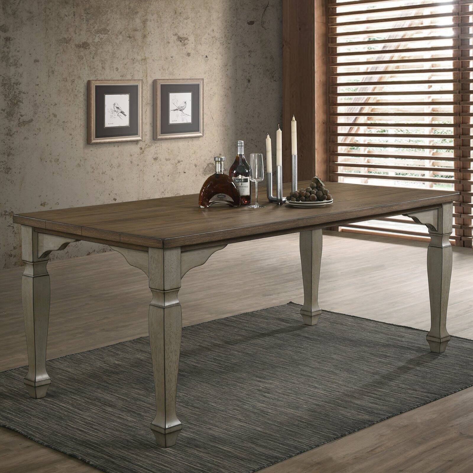 Graceful detailing and a blend of finishes set the Roundhill Furniture Breda Rectangular Dining Table up for room-defining glory. This dining table features carved legs and base detailing; ensuring an elegant addition to your dining room. Its planked wood top sports a dark oak finish while its base boasts an antique gray hue.