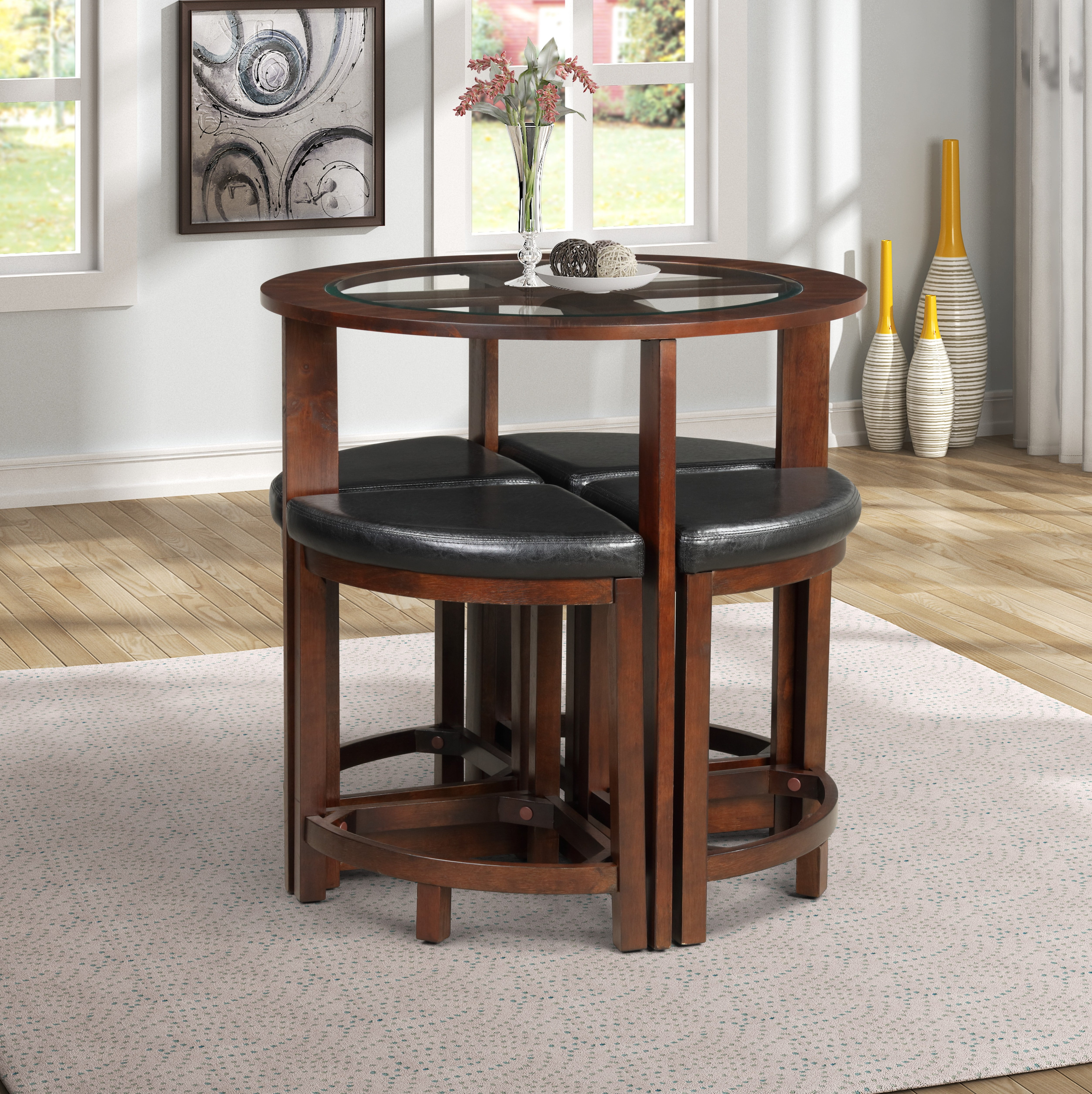 The rich dark finish flows beautifully over the straight-lined contemporary design and is perfectly complemented by the inset beveled clear glass table top. The matching backless stools feature a comfortable faux leather upholstered seating area creating a stylish dining collection that fits flawlessly into any home’s decor 4 chairs store neatly under table Dimensions: Table: 36″ DIA x 36″H, Stool: 22″W x 22″D x 24″H Some assembly required. Photo may be slightly different from the actual item in terms of color due to the monitor’s display