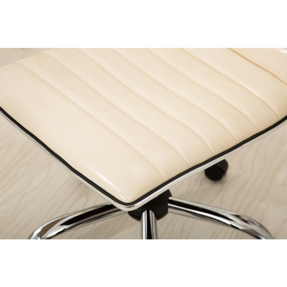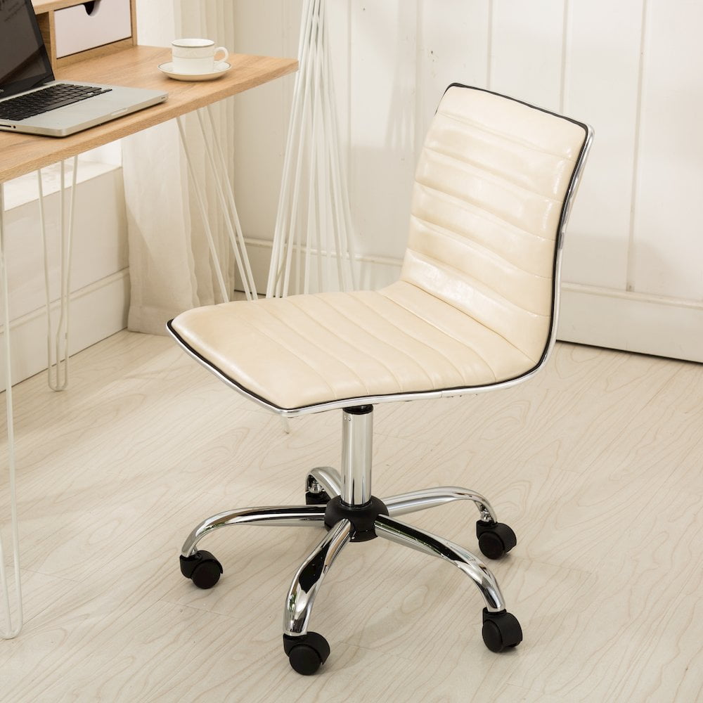 Dimensions: 22.8W x 23.62D x 32H in. Seat height: 18-22.5H in. Armless design slides right up to desk Metal frame with high-quality polyurethane upholstery Choose from available upholstery colors Mid-back construction with tilt mechanism 360° swivel and sturdy casters