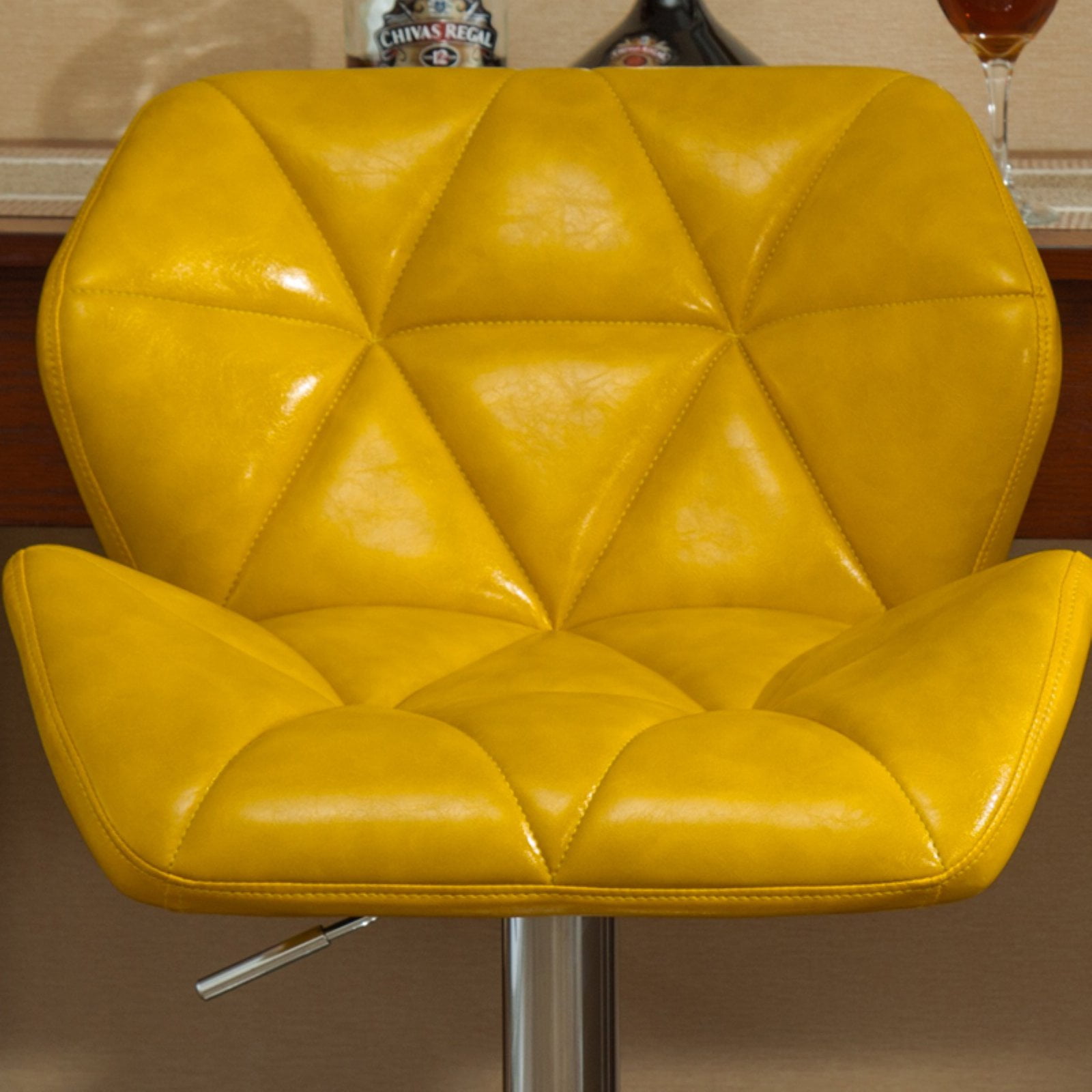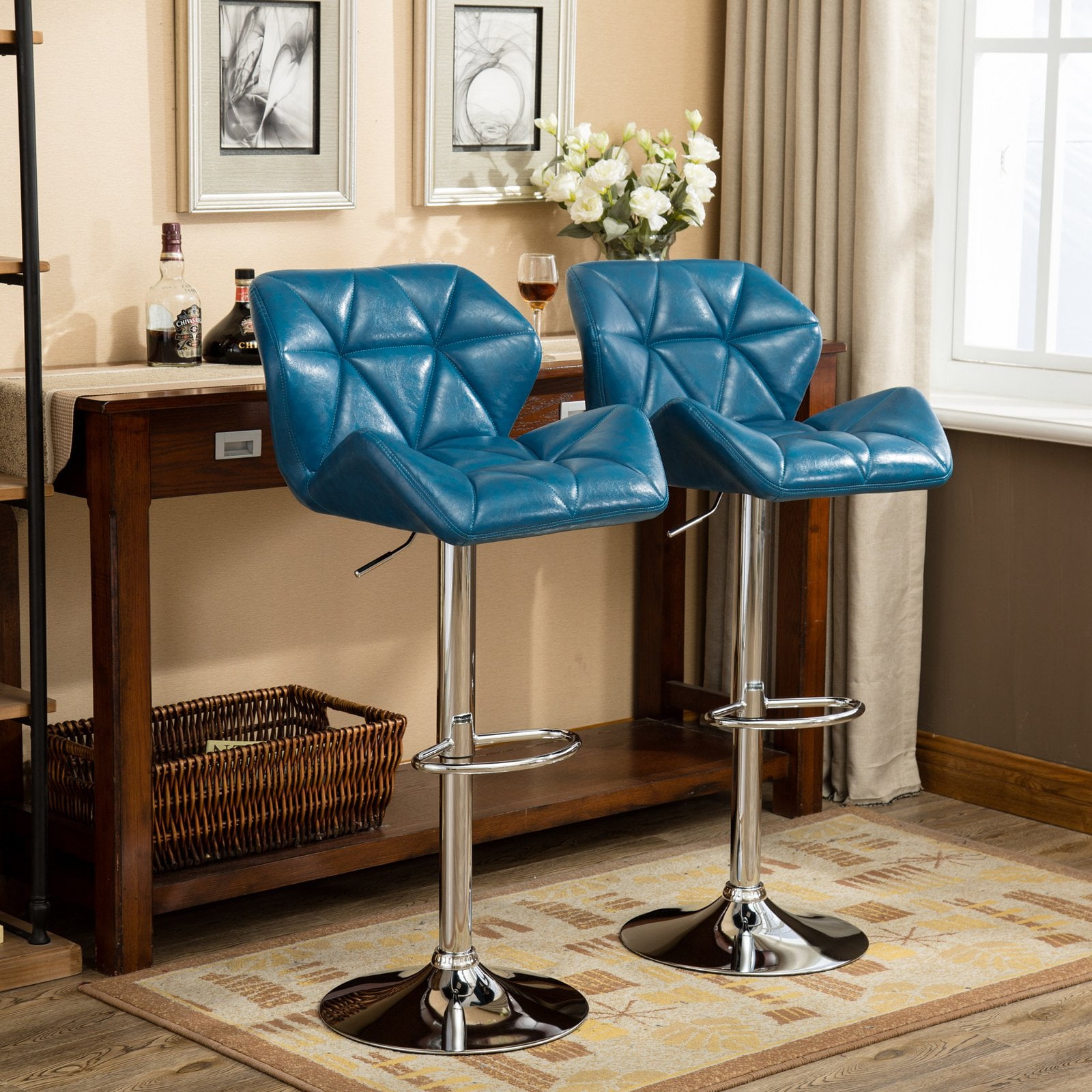 Diamond-tufted swiveling seat stool with gas-lift height adjustment PU leather seat in variety colors. Built in foot rest for extra comfort, 16.5″ DIA big base gives more stability. Dimensions: Chair: 20.5″W x 20.63″D x(35-43.25)”H; Seat: 20.5″W x 14.25″D x (25.5-33.75)”H Some assembly required. Photo may be slightly different from the actual item in terms of color due to the monitor’s display